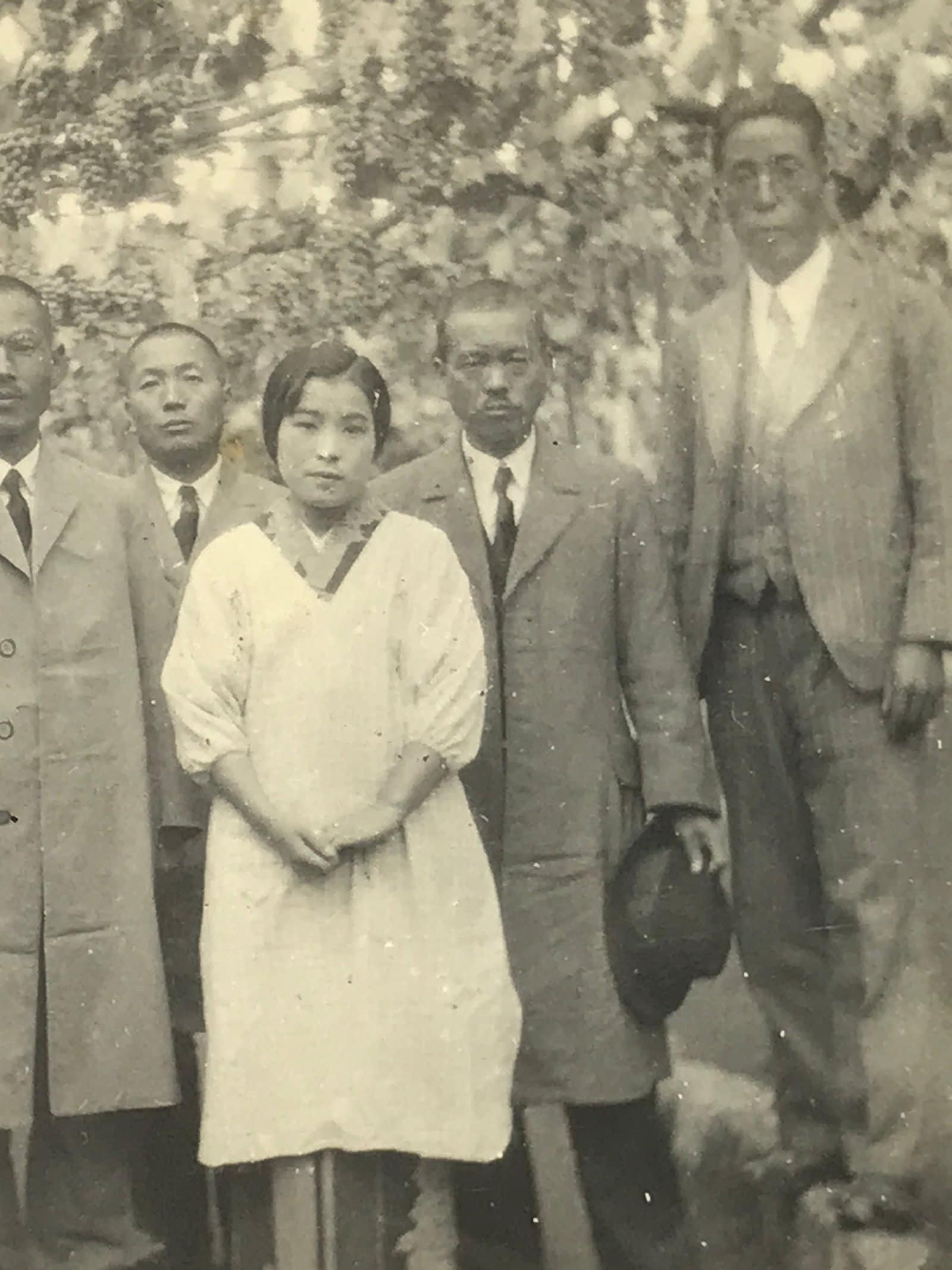 This is an original vintage early Showa Era photograph of a group of men in suits with one woman in kimono posing beneath a pergola with full-bloom wisteria flowers.