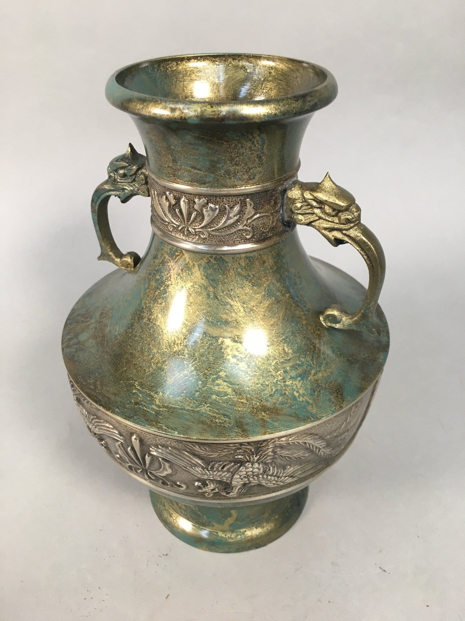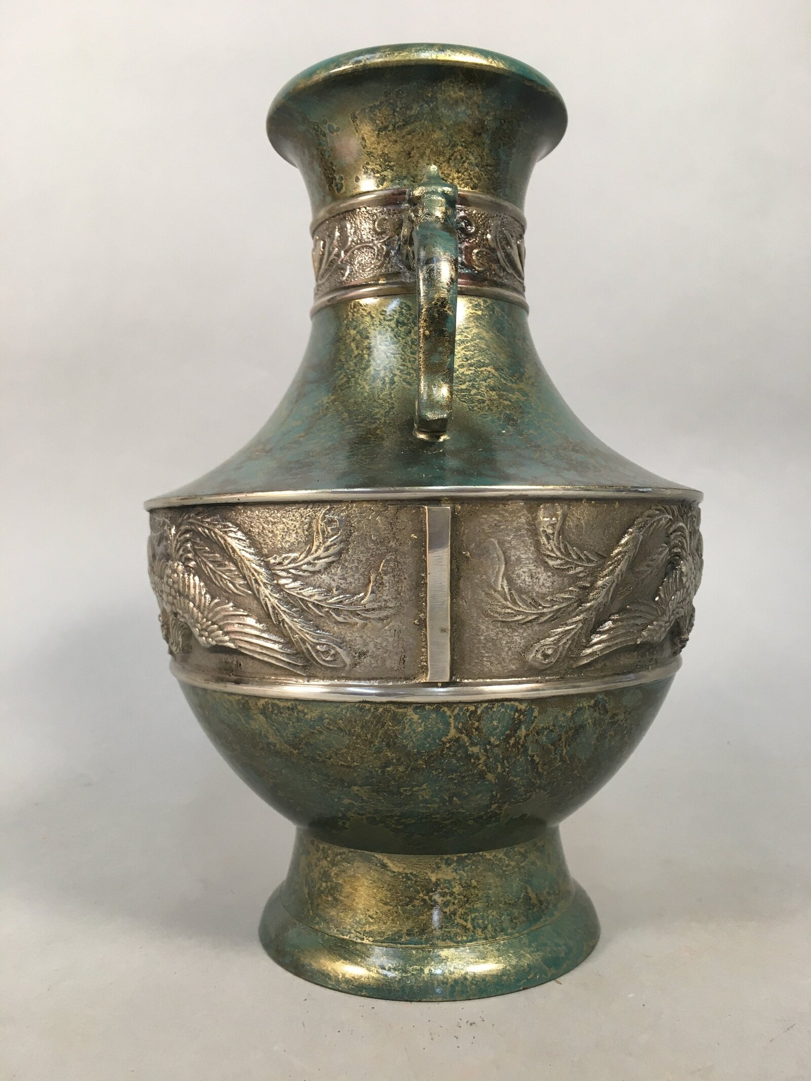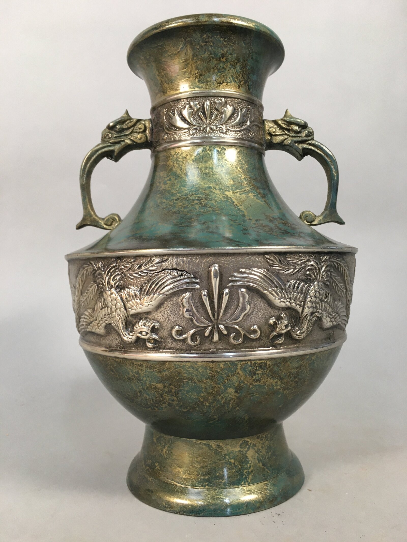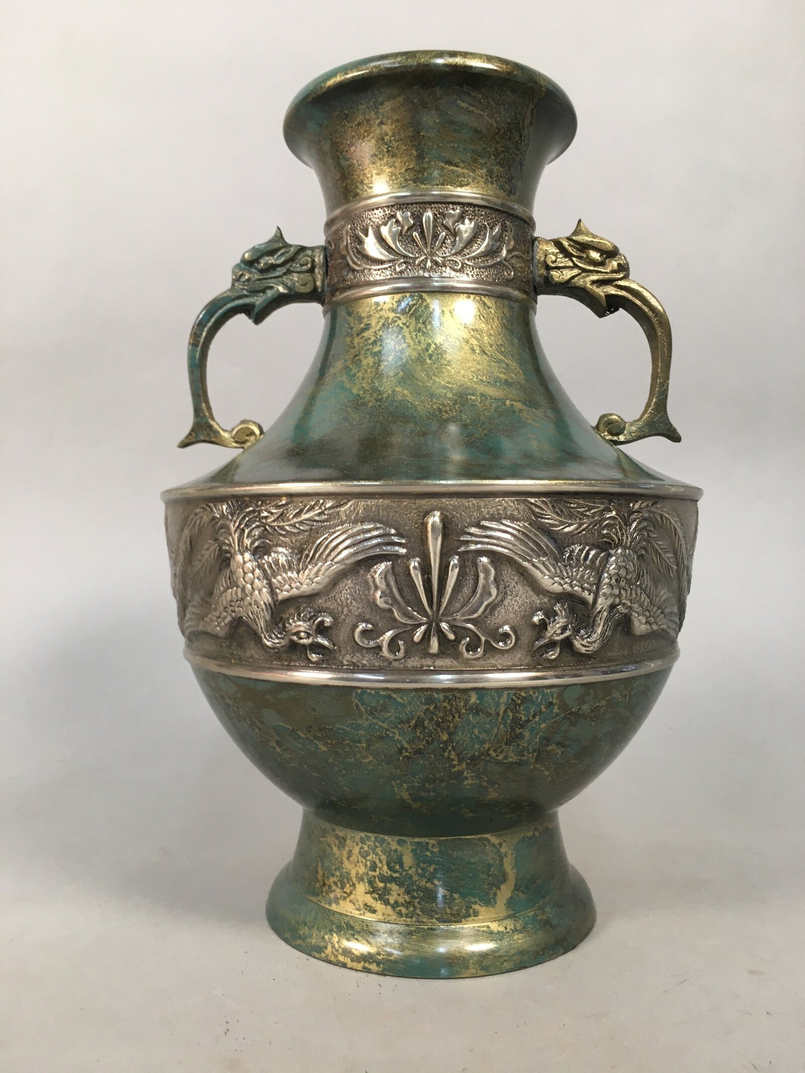 January 18, 2026Japanese Bronze Flower Vase Vtg Cast Metal Kabin Ikebana Green Gold Shishi FV894