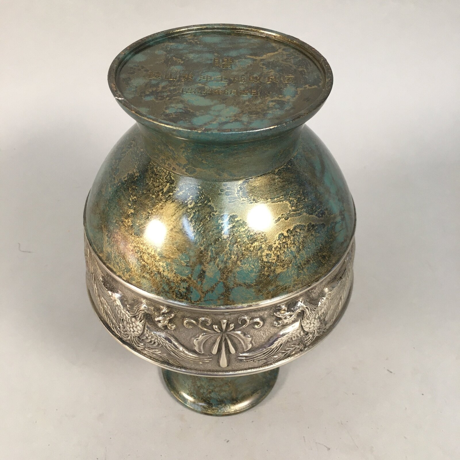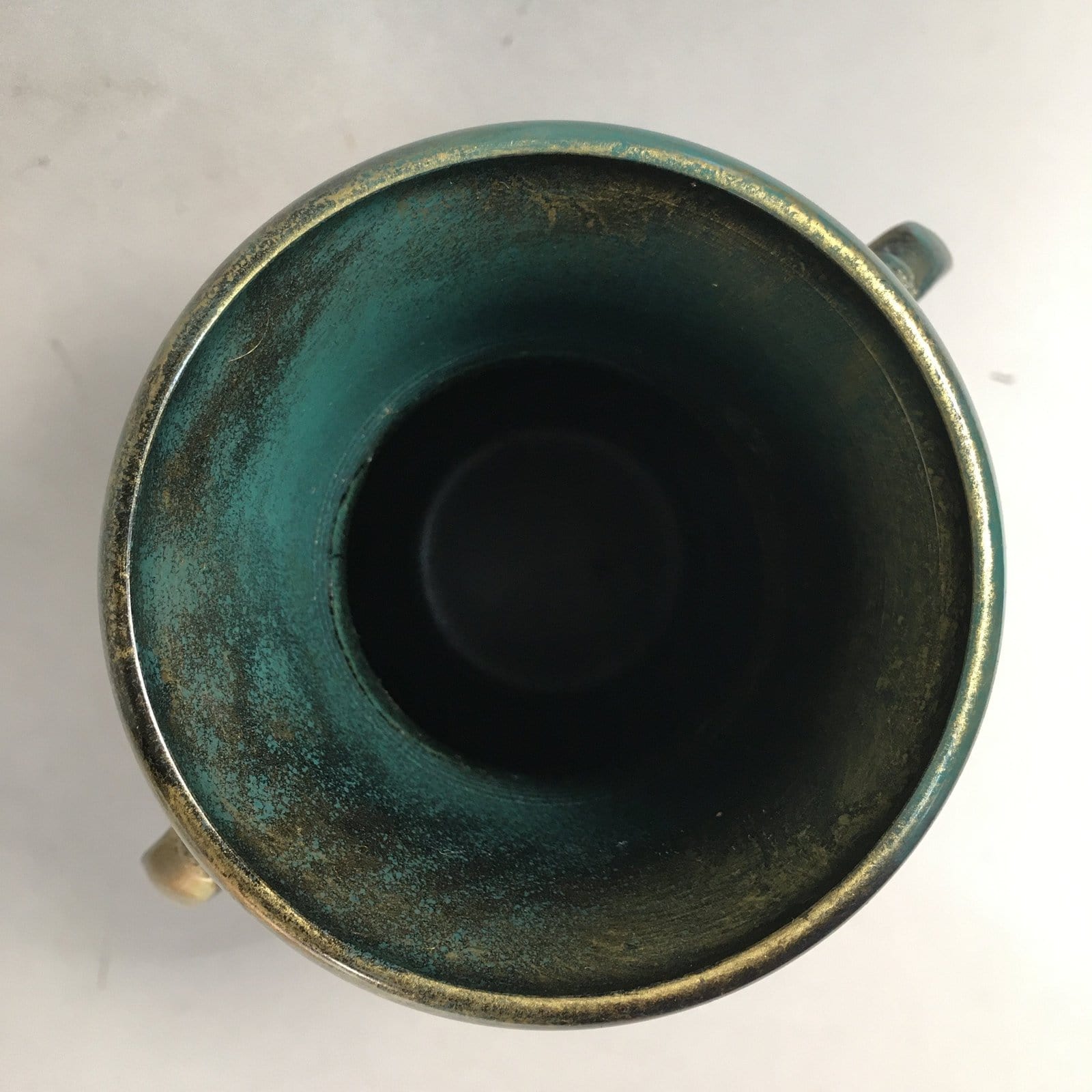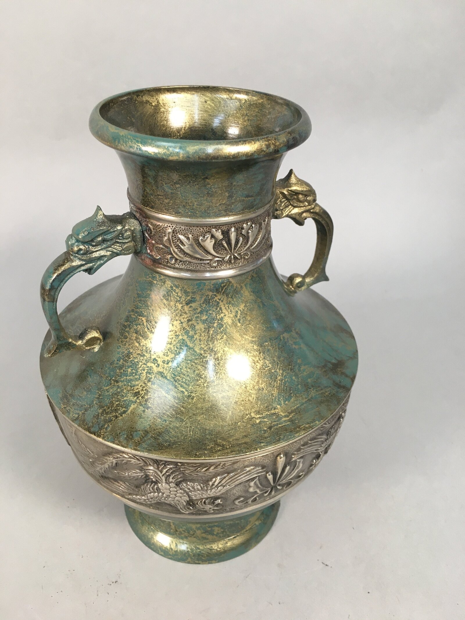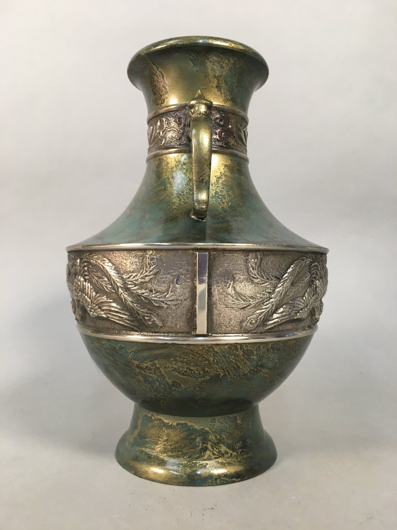 January 18, 2026Japanese Bronze Flower Vase Vtg Cast Metal Kabin Ikebana Green Gold Shishi FV894