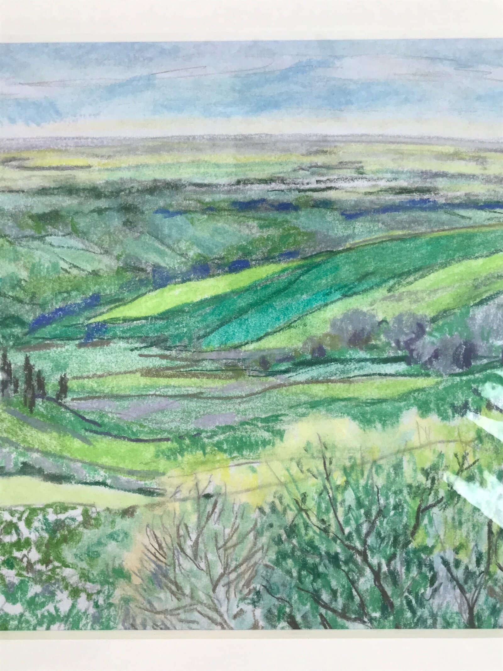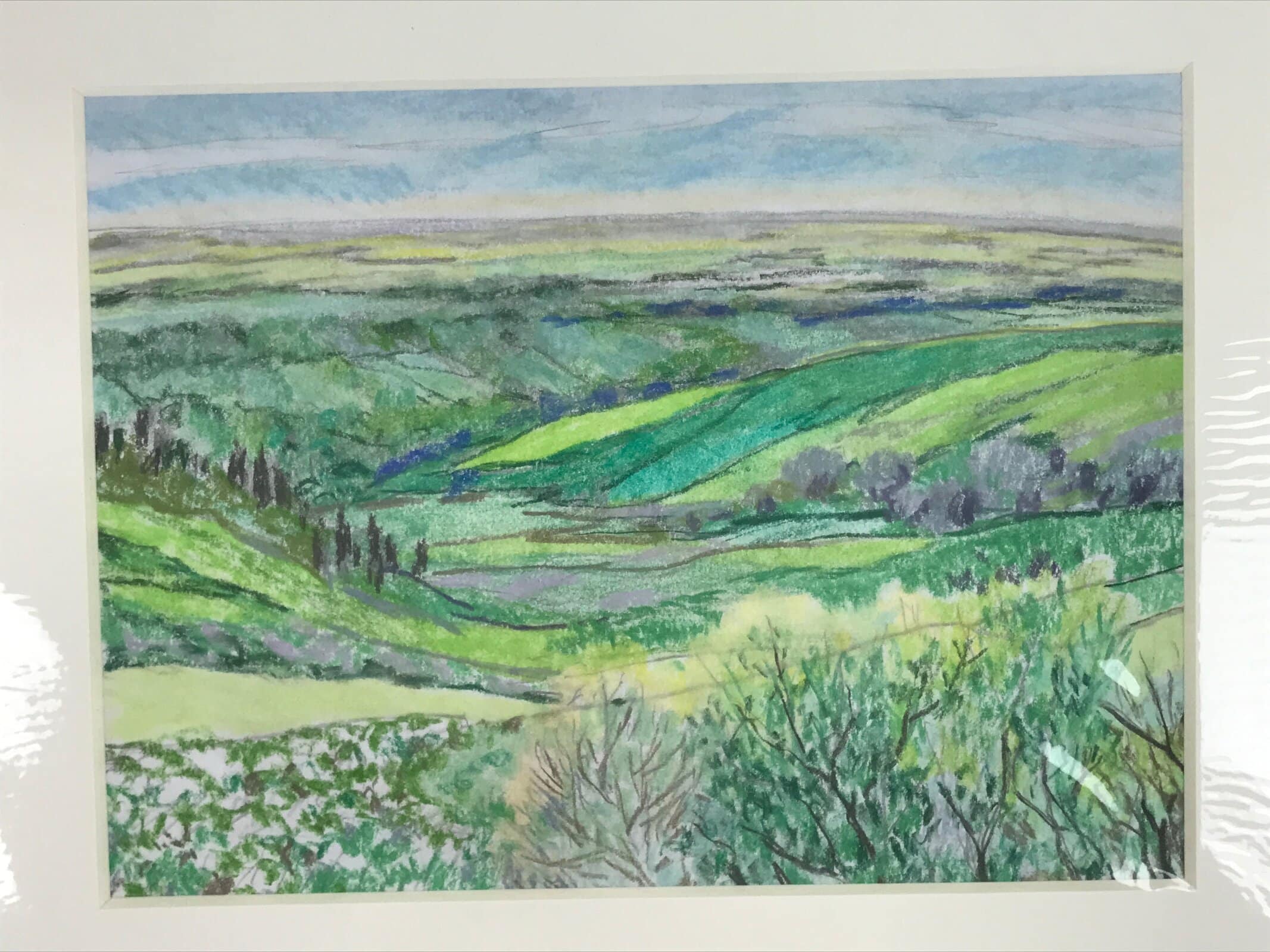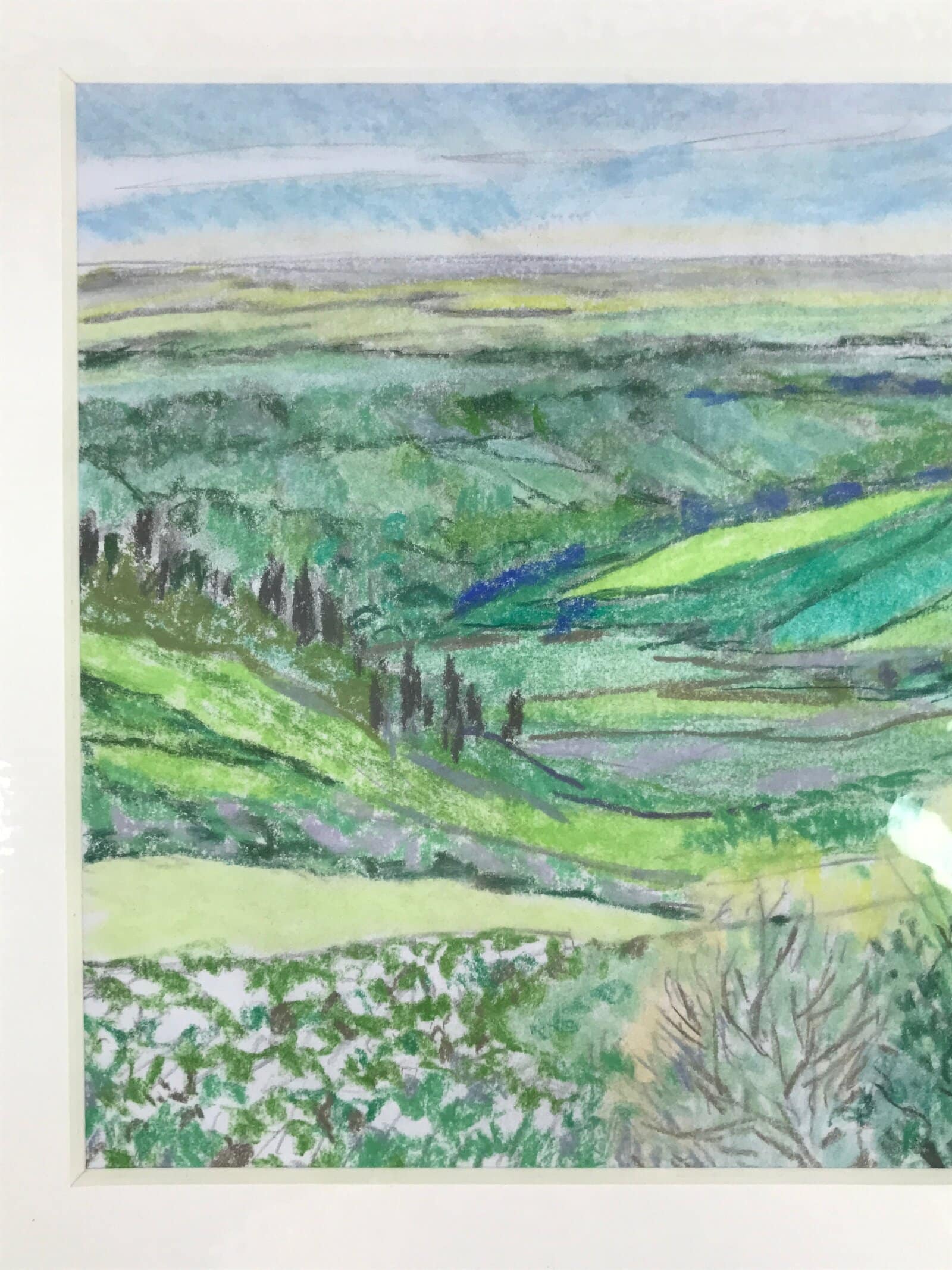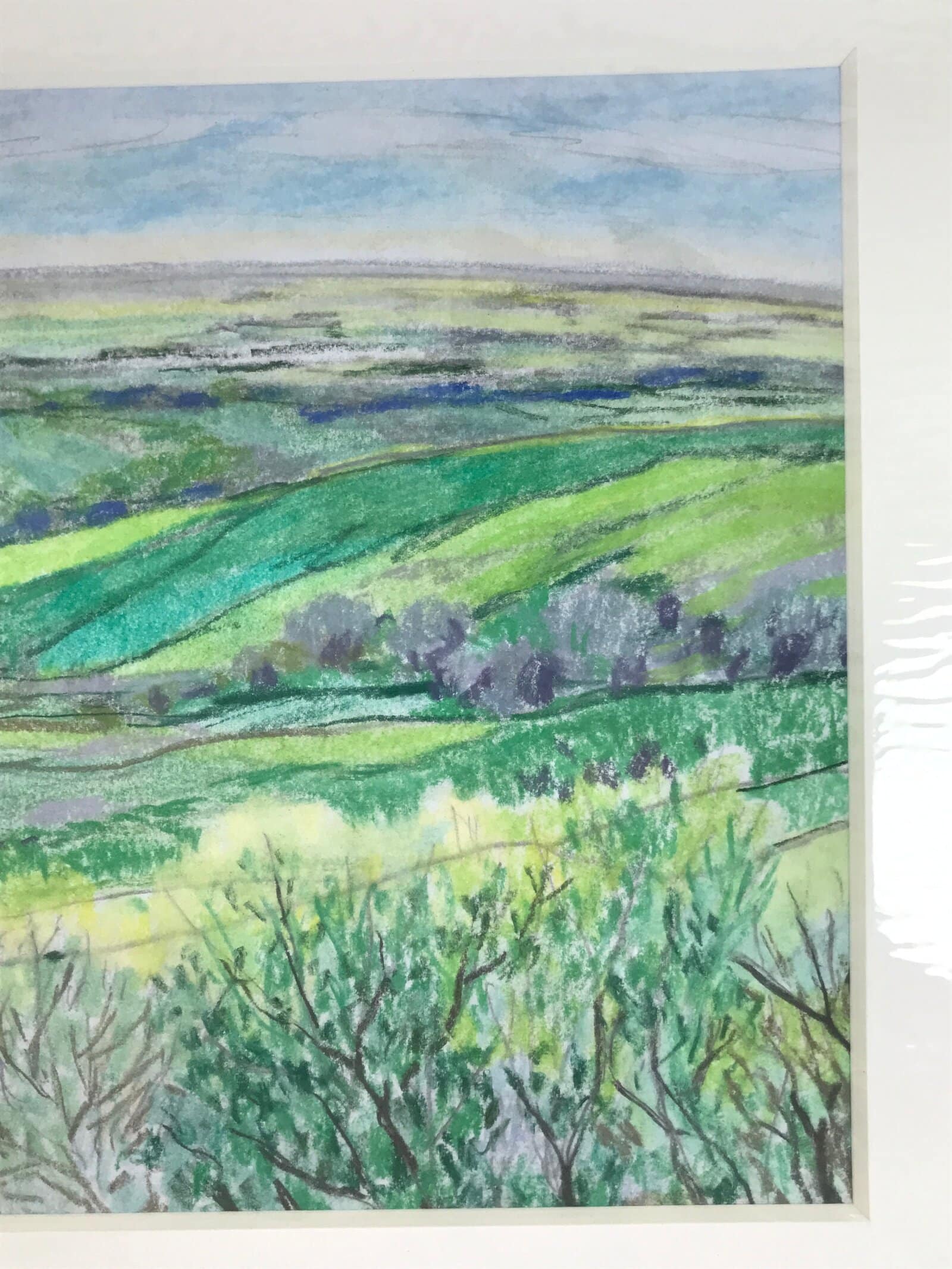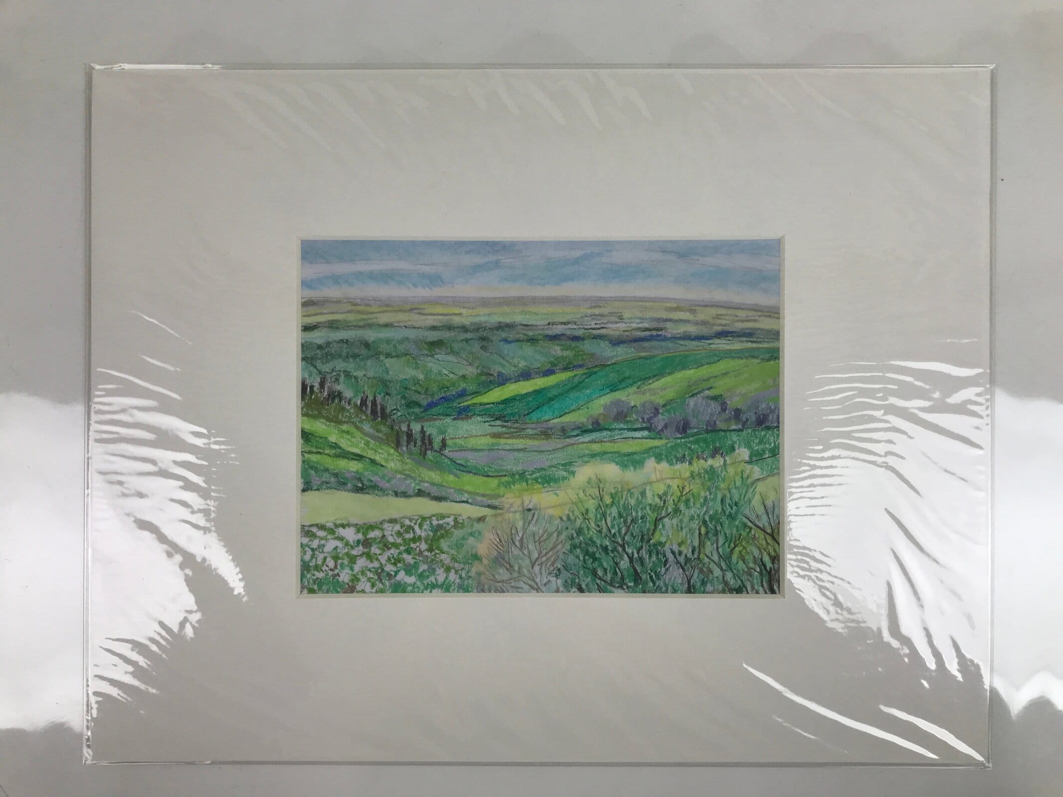 This original pastel drawing on cardstock paper features rolling verdant green hills in Japan’s magical countryside. Pastel is a gorgeous, often overlooked, art medium that blends colors together beautifully and this piece is no exception. It is adhered to a plain white matboard, ready for easy framing and has been stored in a plastic sleeve. This work is unsigned, but was among a collection of other similar drawings by the Japanese artist Yoshihiro Hagino.