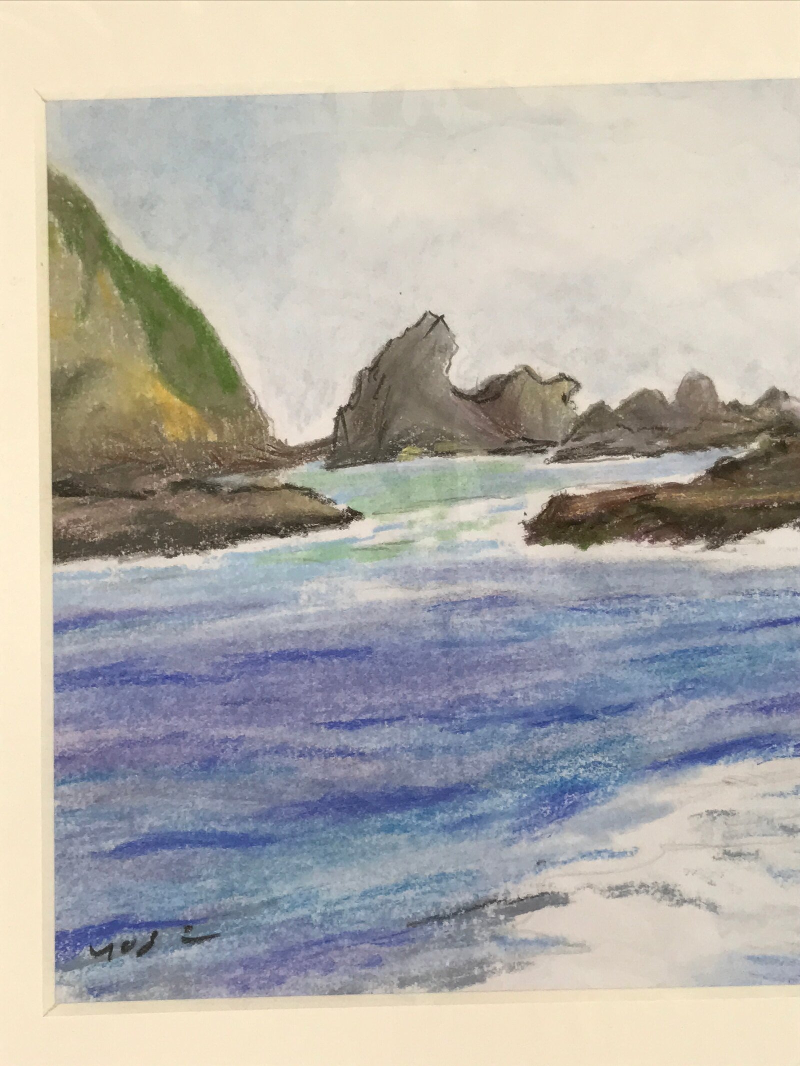 This original pastel drawing on cardstock paper features an oceanside view of aves crashing over the rocks along the shore. Pastel is a gorgeous, often overlooked, art medium that blends colors together beautifully and this piece is no exception. It is adhered to a plain white matboard, ready for easy framing and is stored in a plastic sleeve. This work is signed by the Japanese artist Yoshihiro Hagino.