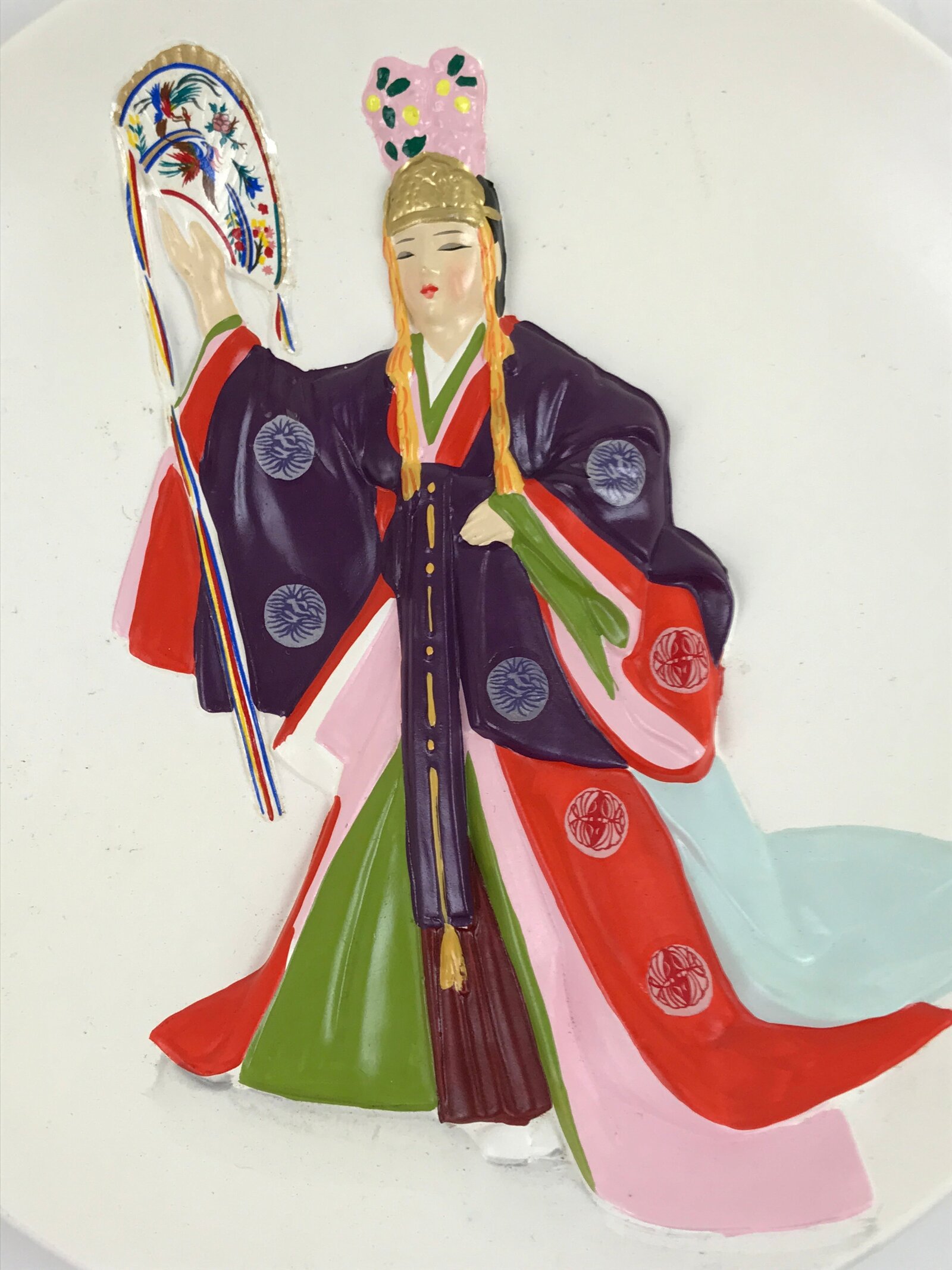 This vintage Japanese decorative item is a ceramic plate with dancing shrine maiden relief. This is cased in a paper box. Resin stand is included.
