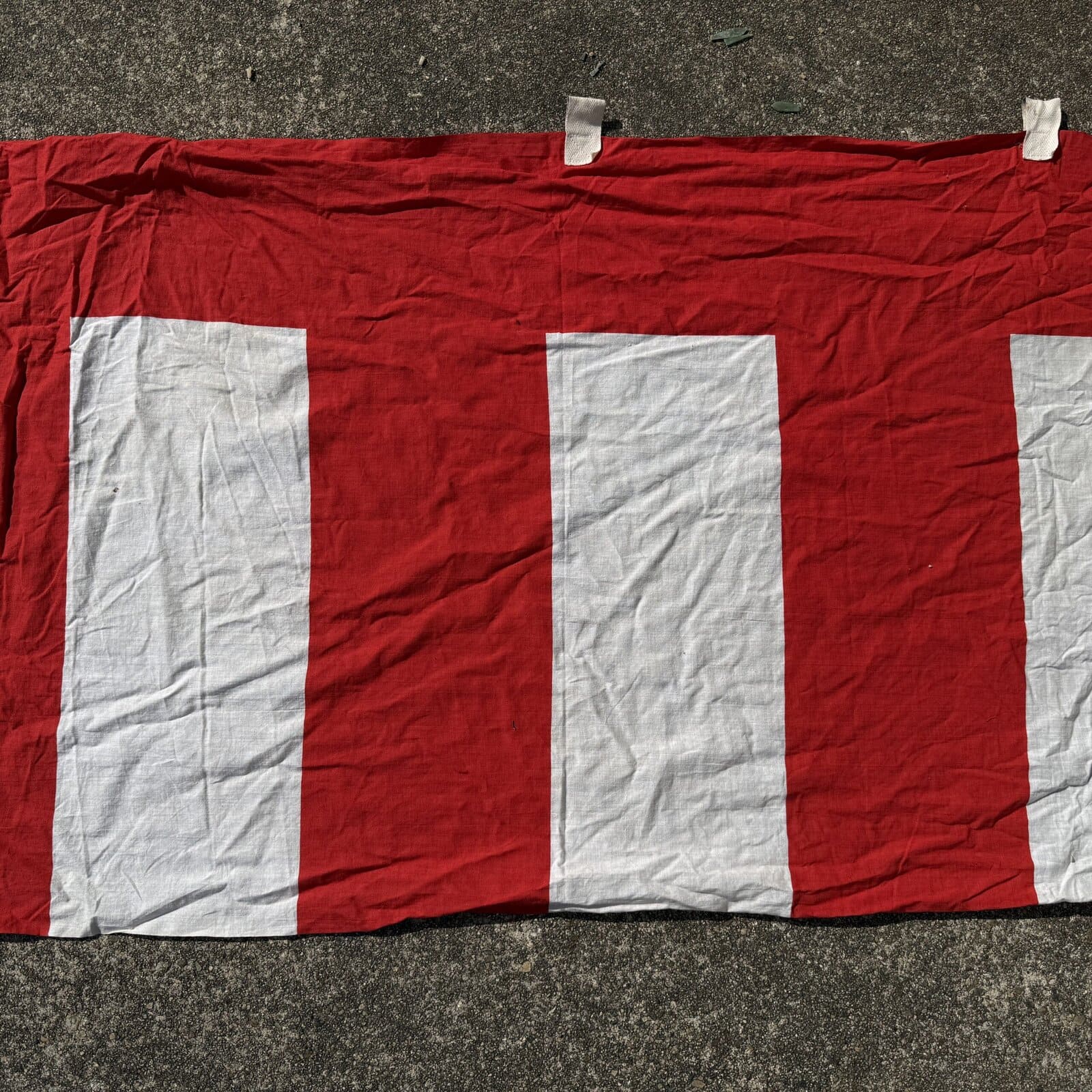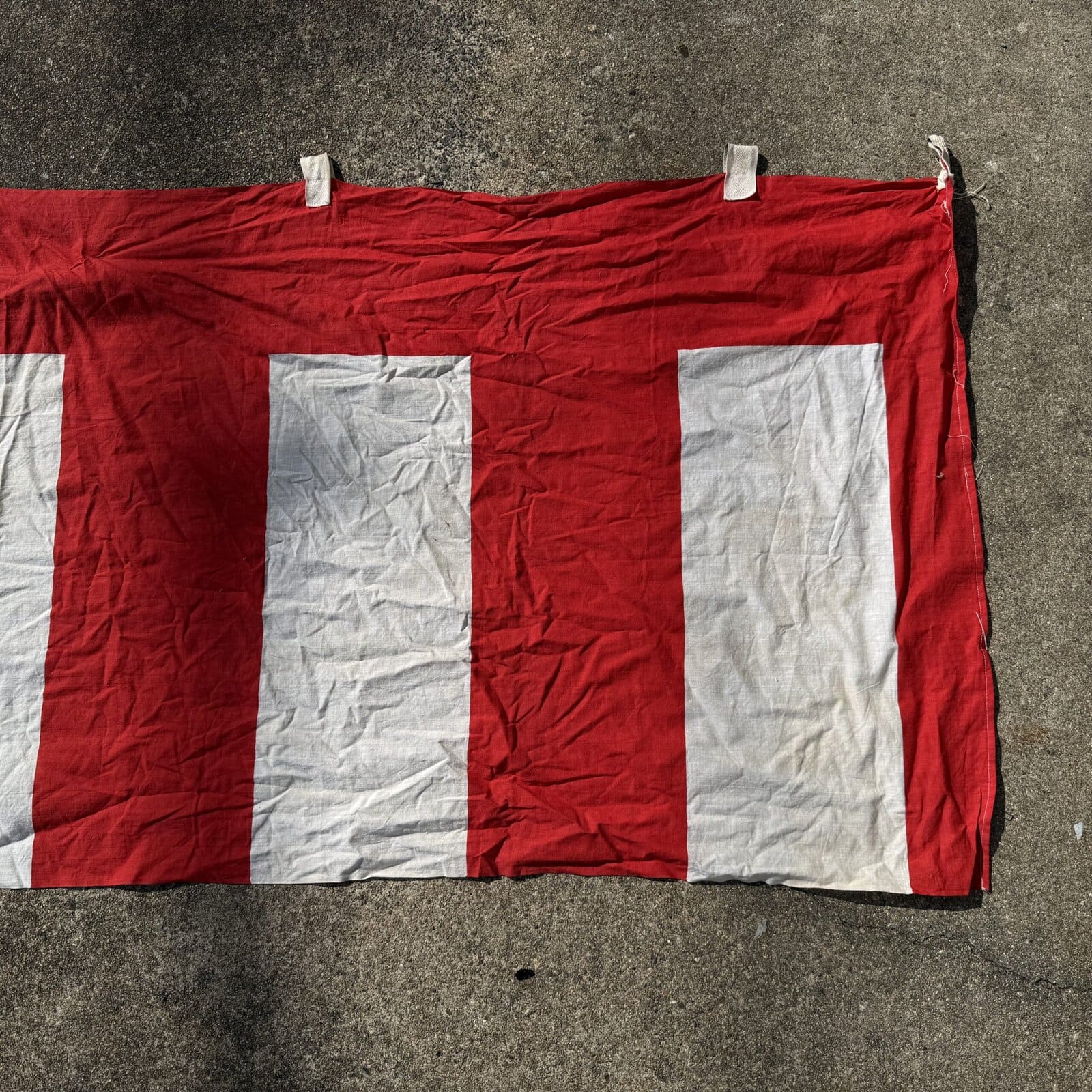 This is a vintage Japanese kohakumaku fabric divider. It features large red-and-white vertical stripes and loops at the top for securing to a rope.