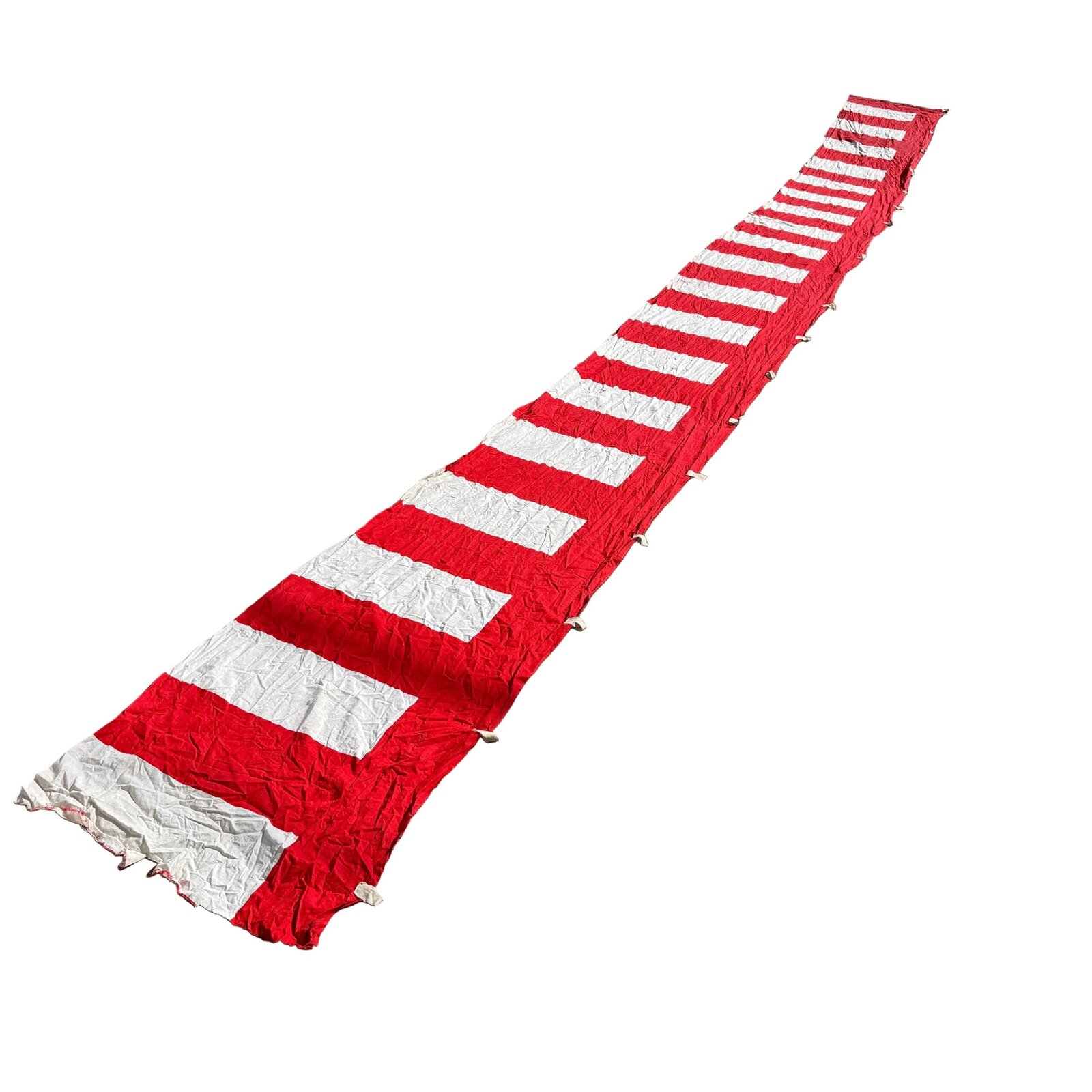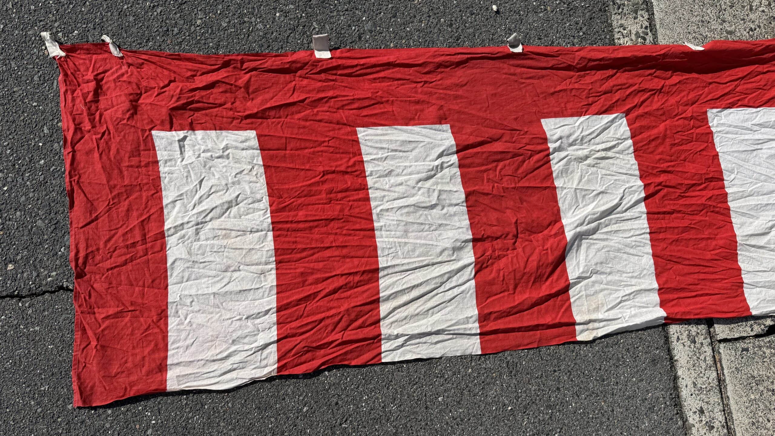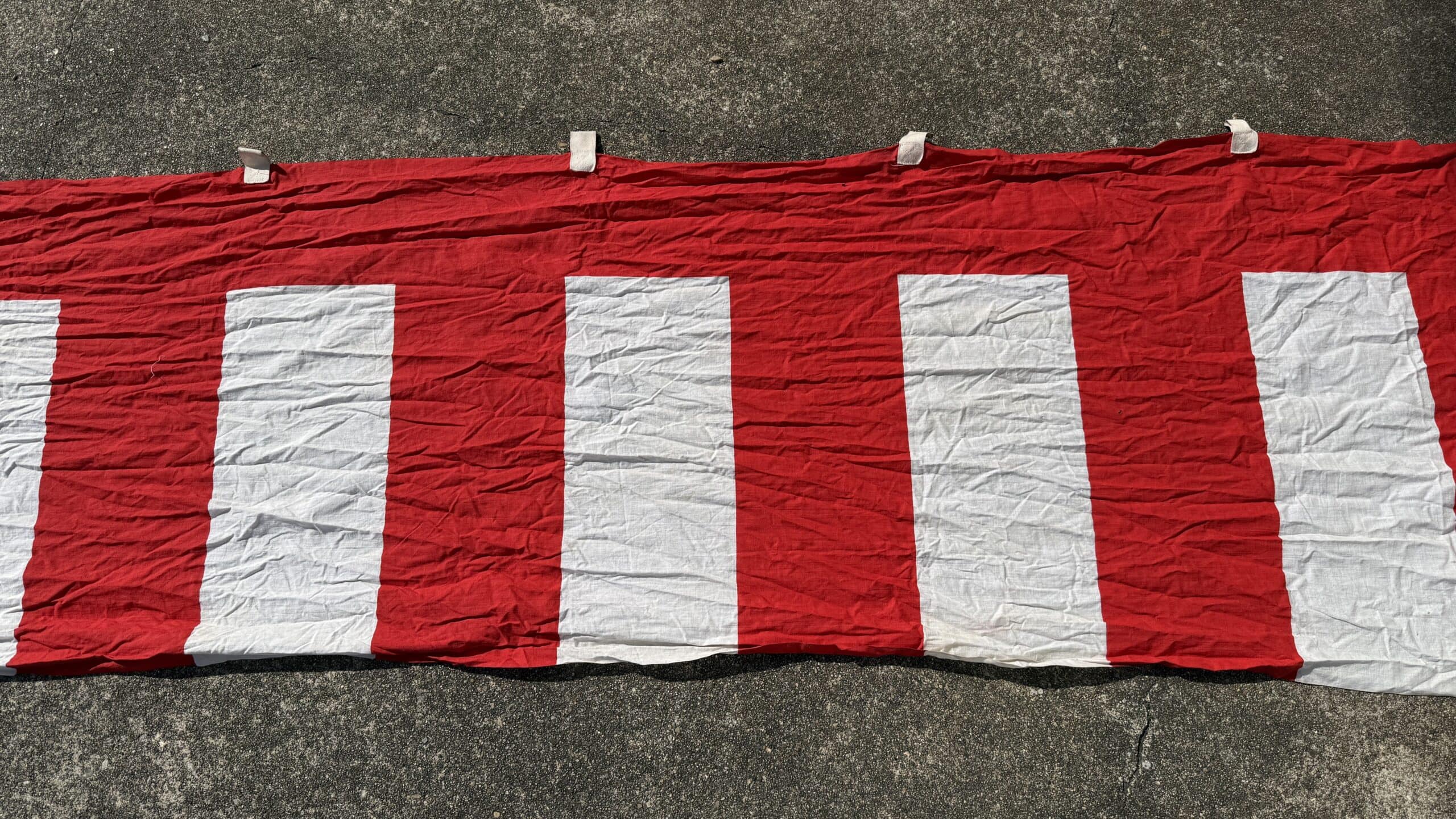 This is a vintage Japanese kohakumaku fabric divider. It features large red-and-white vertical stripes and loops at the top for securing to a rope.