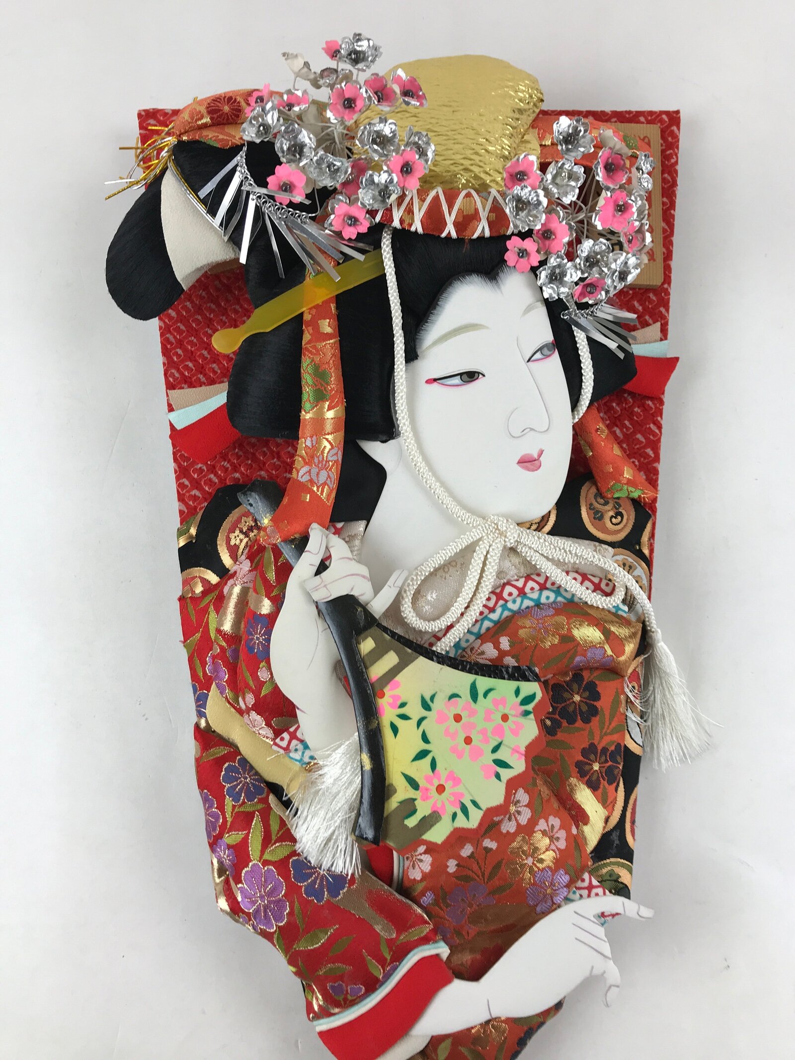 This item is a Hagoita wooden paddle decorated with fabric. It shows a Japanese woman (geisha) dressed in a gorgeous red, purple, blue and gold kimono and holding a fan. The woman wears the traditional hairdo and a gorgeous headpiece. The cloth part of the kimono is made of silk. The back of the paddle is painted and represents cherry blossoms. The handle is covered with a black velvet fabric. This hagoita paddle comes in its original paper box. Shuttlecocks are not included.
