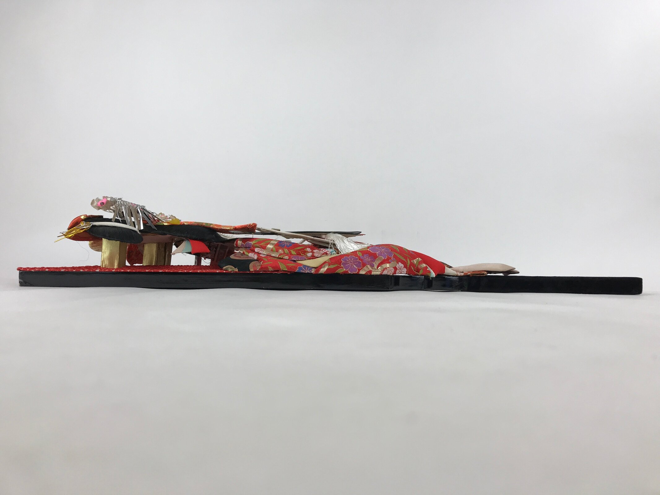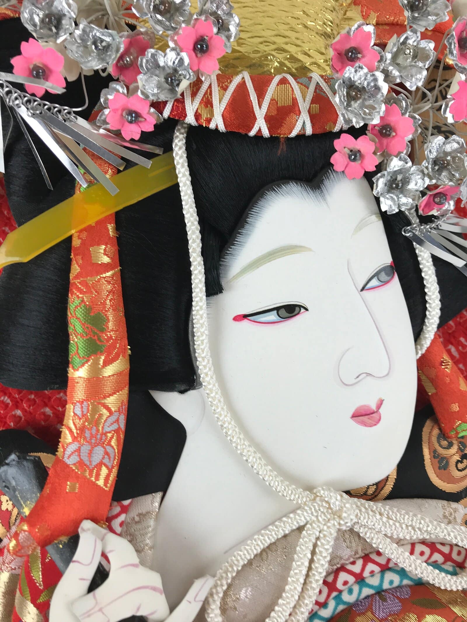 Hagoita is the wooden paddle used to hit shuttlecocks made of soapberry seeds and bird feathers, that is used to play the traditional Japanese pastime called Hanetsuki ( Japanese badminton) during the New Year. This is a three-dimensional fabric art (Oshie-Hagoita) of a woman or geisha in a kimono. The design is beautiful, so it would be nice as a room decoration.