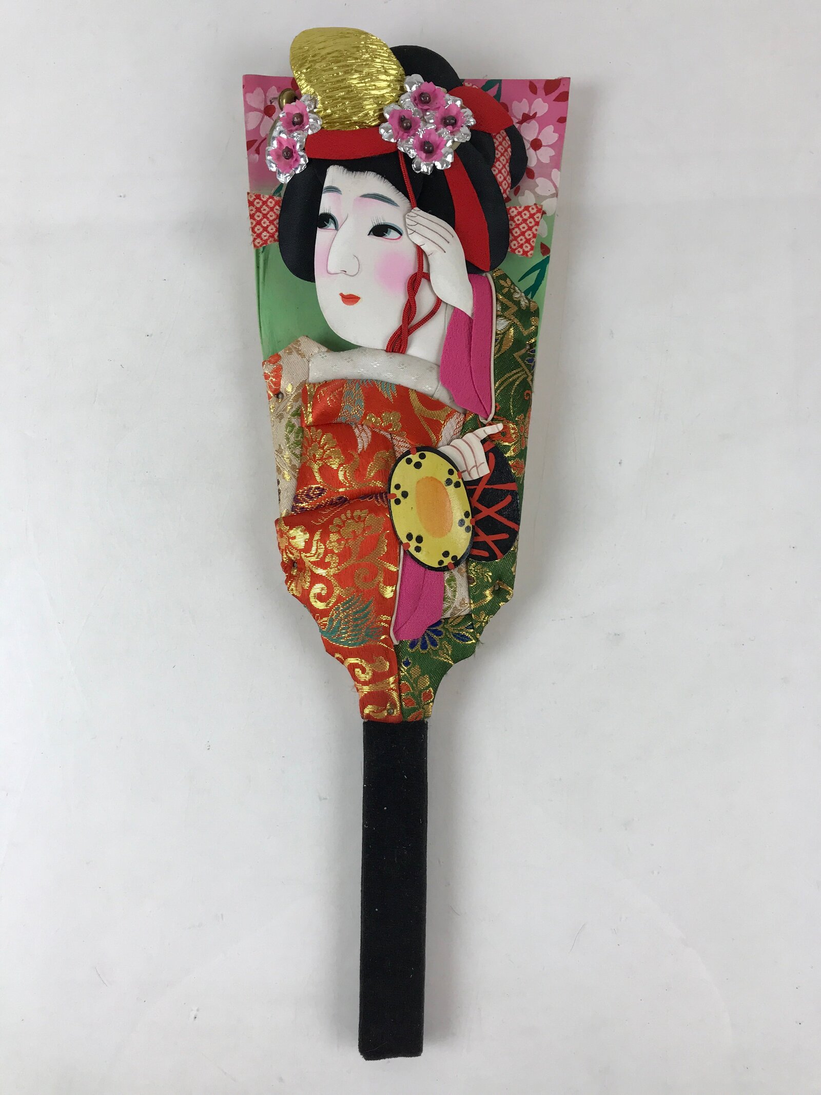 Hagoita is the wooden paddle used to hit shuttlecocks made of soapberry seeds and bird feathers, that is used to play the traditional Japanese pastime called Hanetsuki ( Japanese badminton) during the New Year. This is a three-dimensional fabric art (Oshie-Hagoita) of a woman or geisha in a kimono. The design is beautiful, so it would be nice to have room decoration.