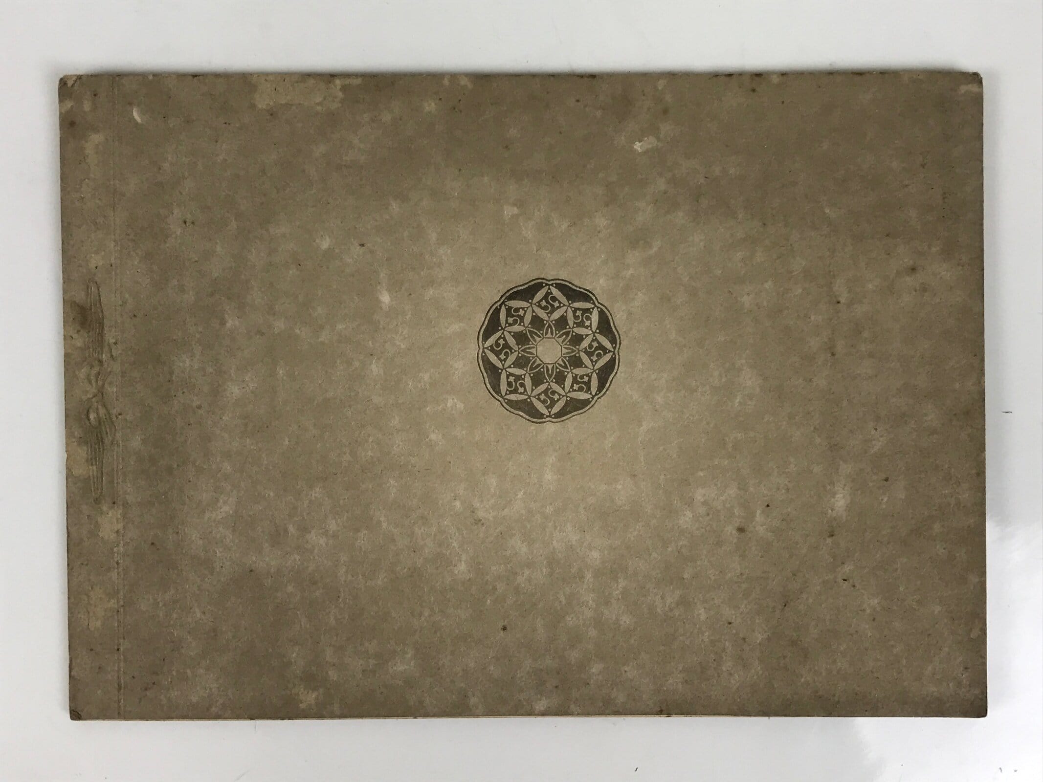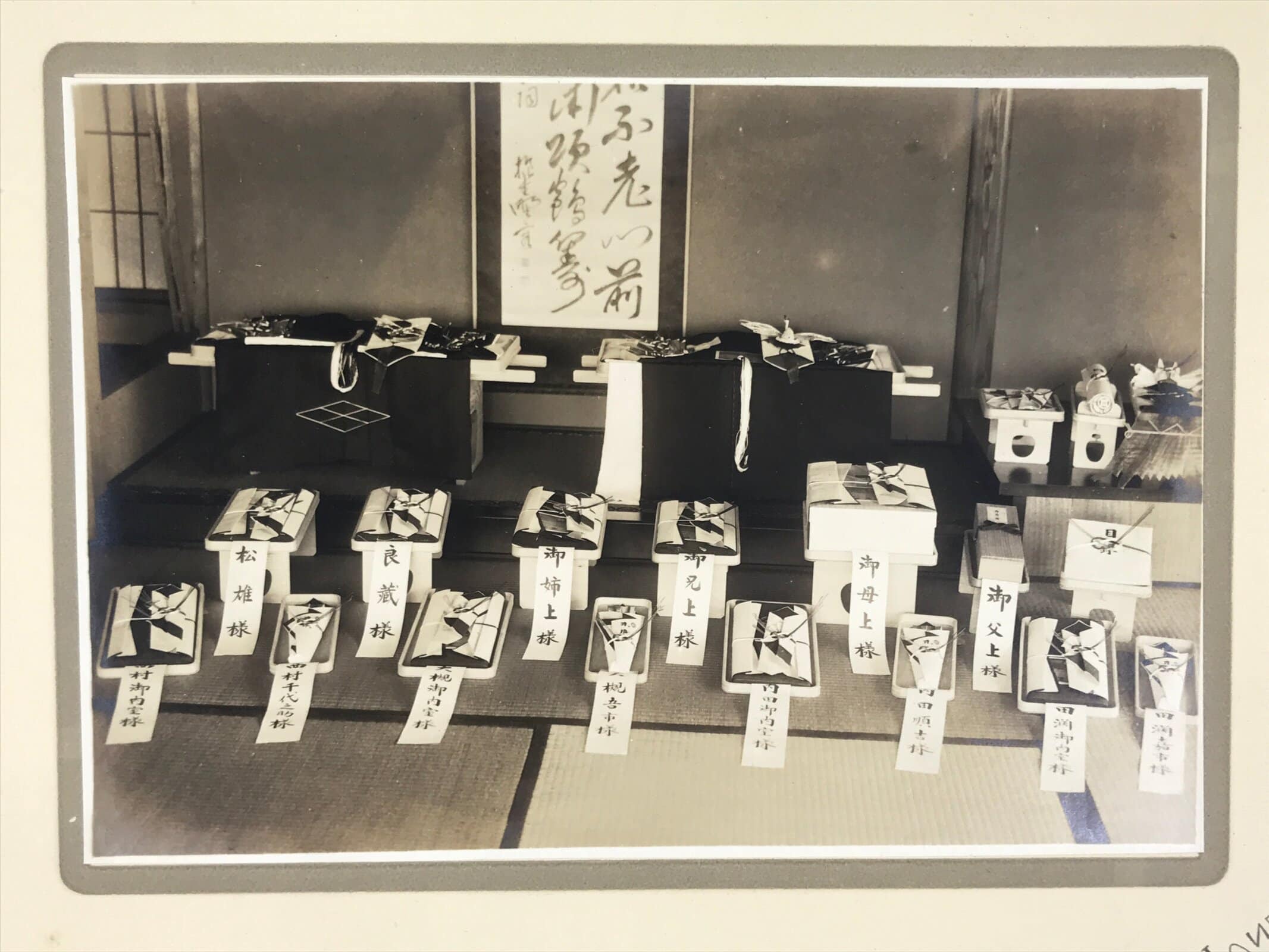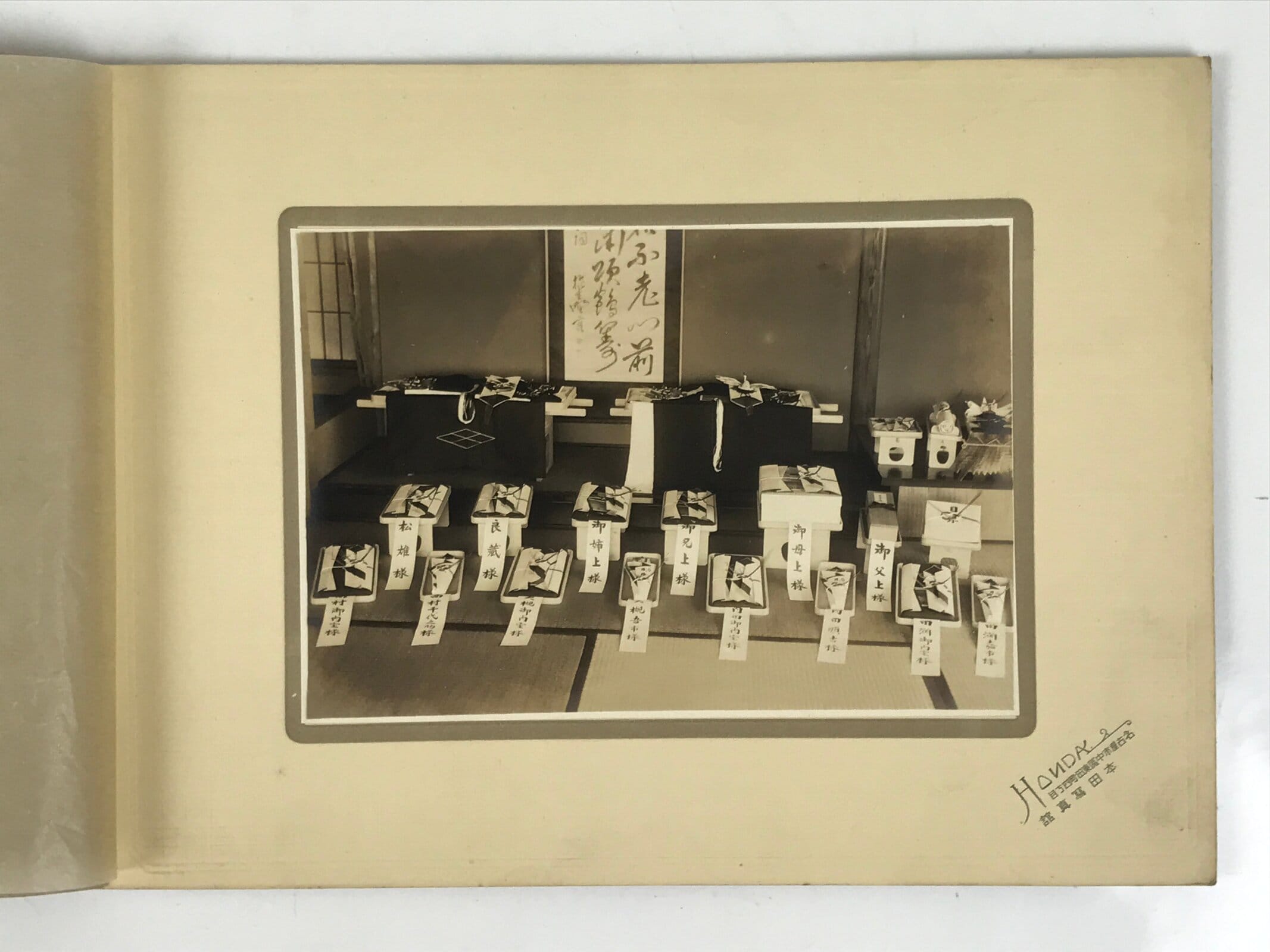 This is a vintage sepia tone photograph from the early Showa Era taken of a couple’s wedding gifts. Based on the style of some of the gifts, it appears the couple had a Shinto wedding. The gifts are laid out in a tatami room with tags that say who the giver was (individuals, family, etc). It comes adhered to a paper folding cover.