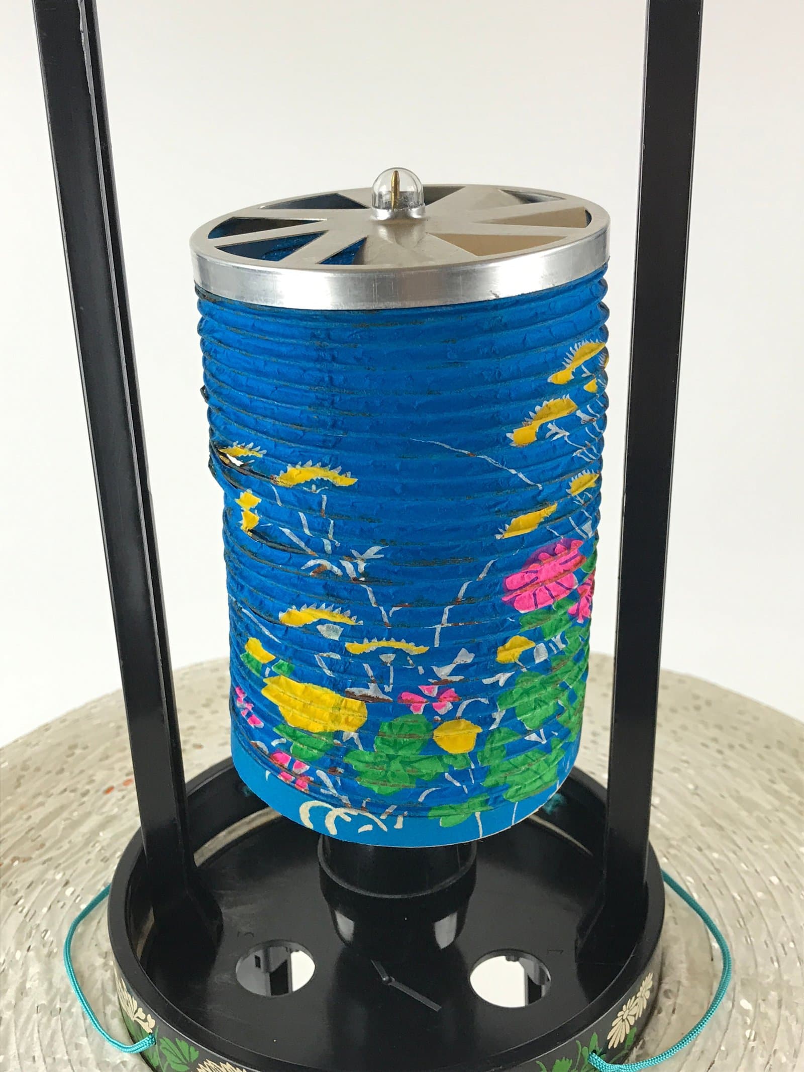 This is a vintage Japanese electric Ouchi lantern. Ouchi lanterns are standing lanterns with 3legs that are displayed during the summer Obon festival to commemorate ancestors.