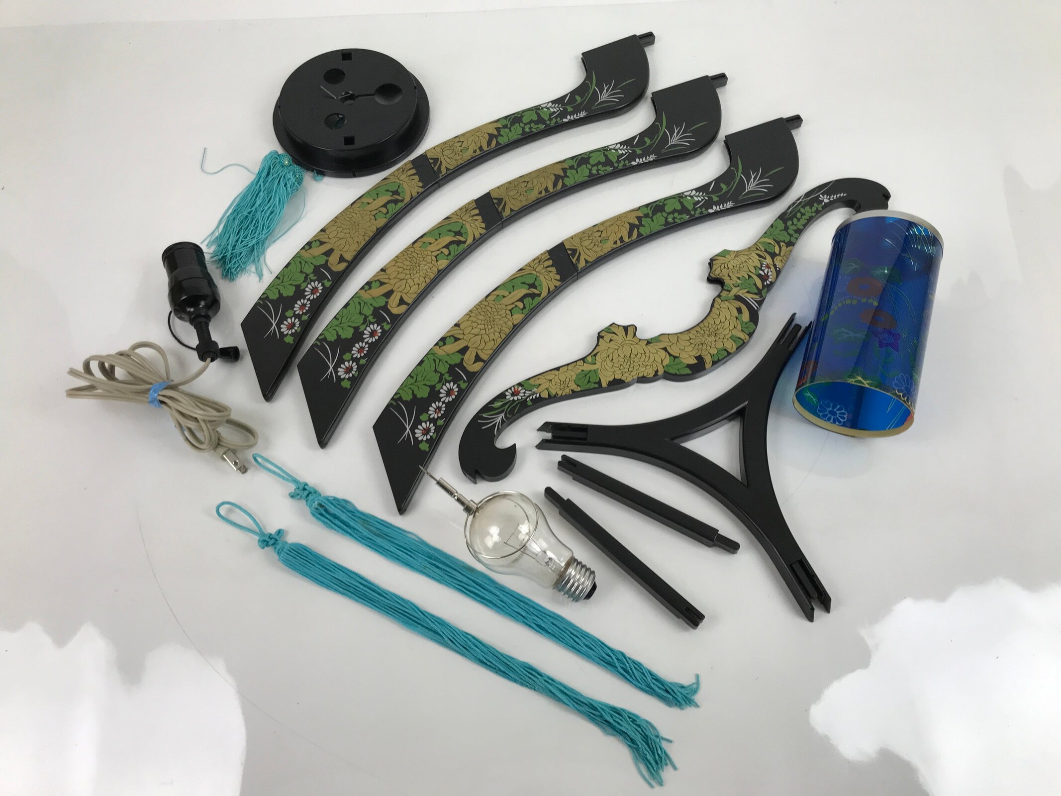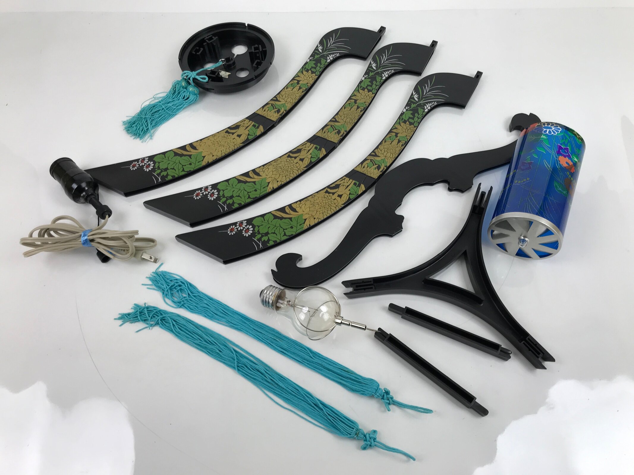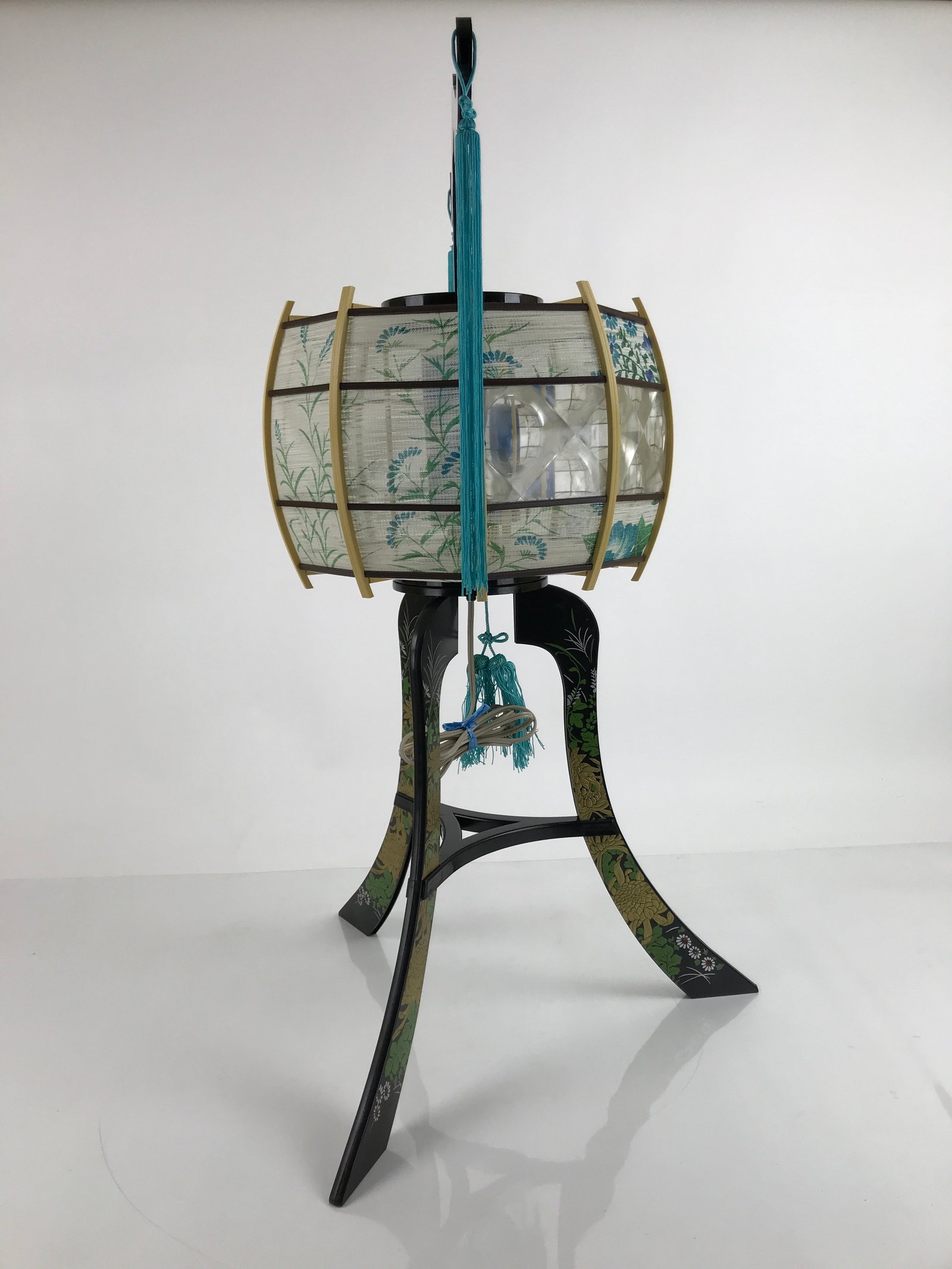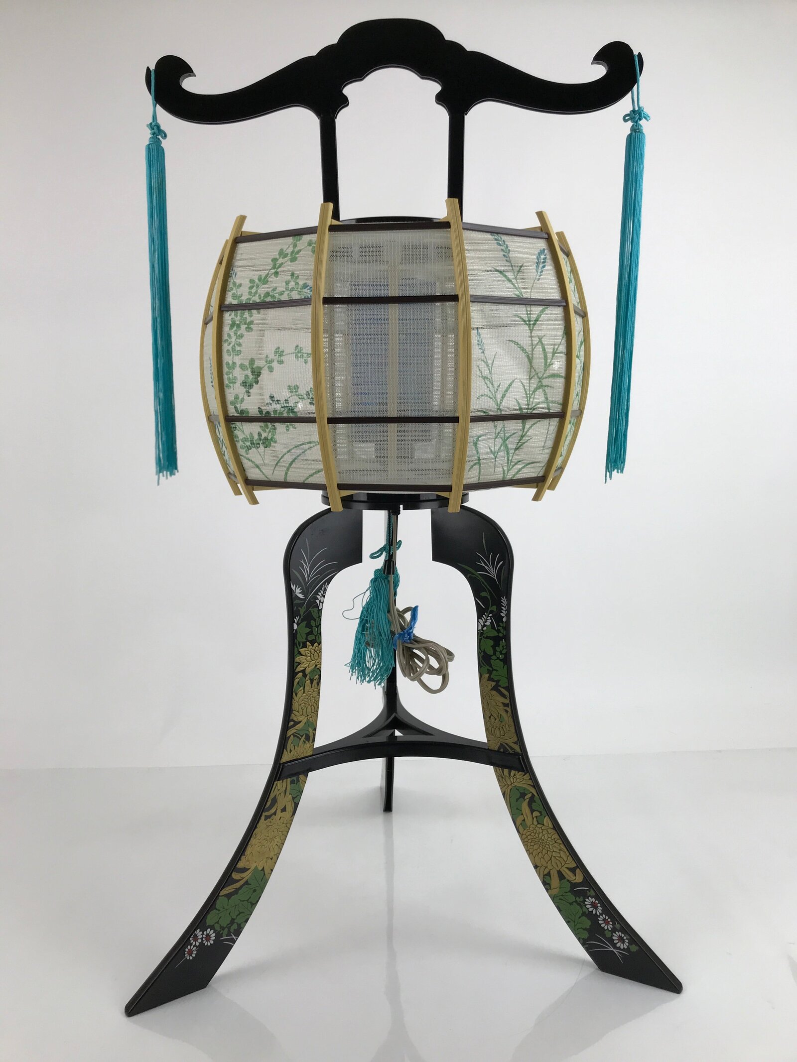 This is a vintage Japanese electric Ouchi lantern. Ouchi lanterns are standing lanterns with three legs that are displayed during the summer Obon festival to commemorate ancestors. The woven fiber lantern with a reflective plastic middle section is white and has an elegant design of blue flowers including bellflowers (kikyo) and fits snuggly on its black plastic frame with gold and green floral designs. It fits semi-flat in its original box. It has an electric light with a plastic blue covering that spins when the lightbulb becomes warm. There are blue tassels on the bottom as well as two long blue tassels that hang from the top piece.