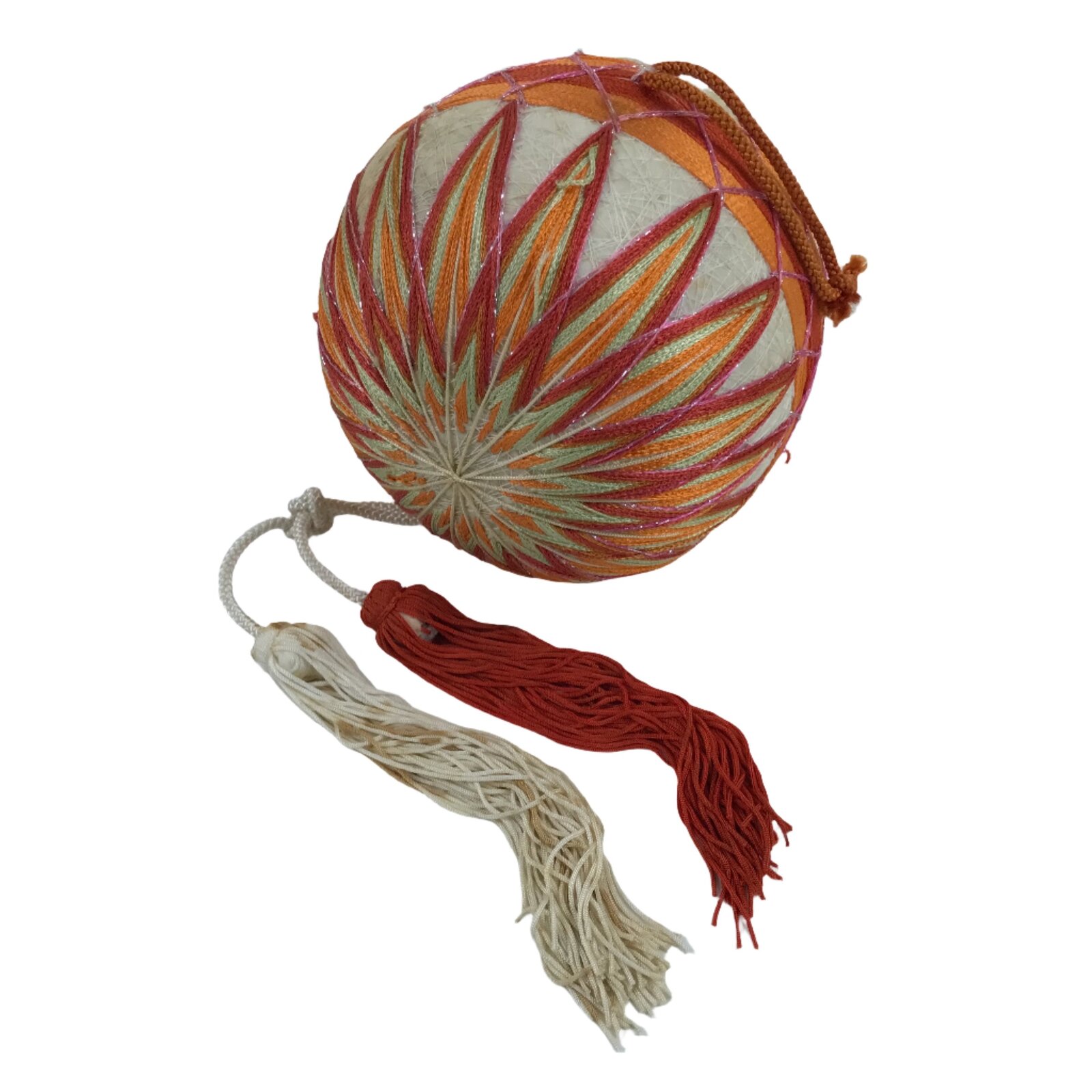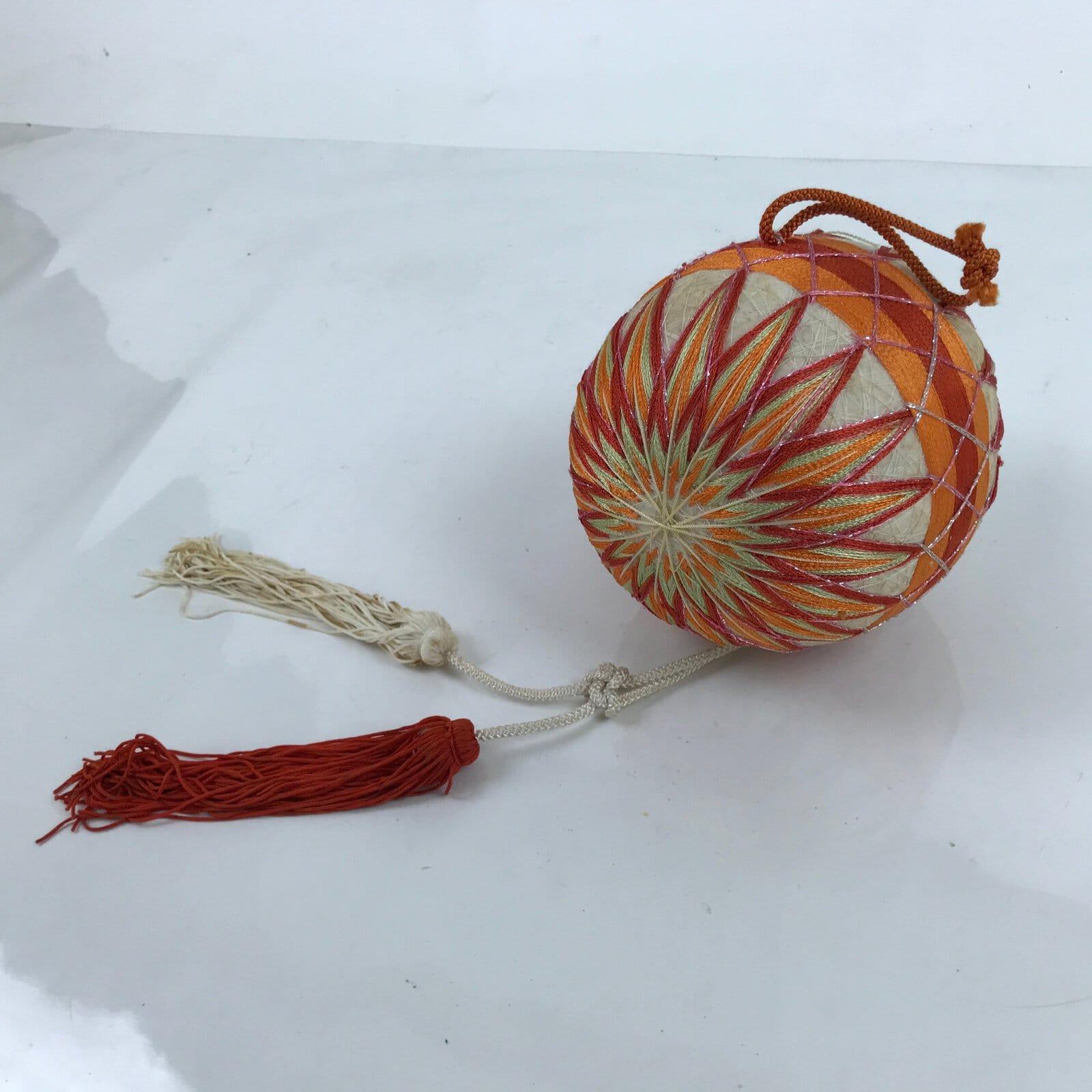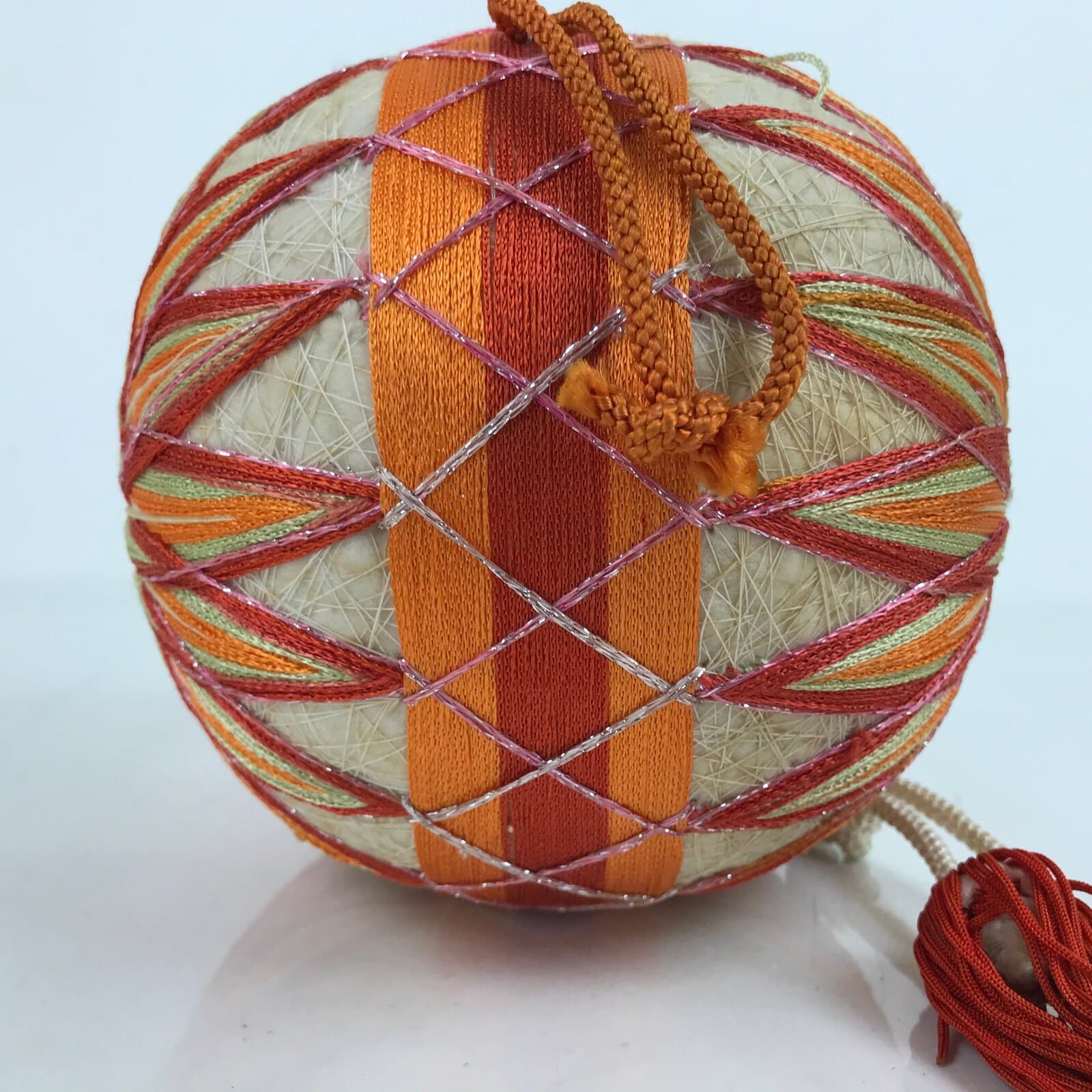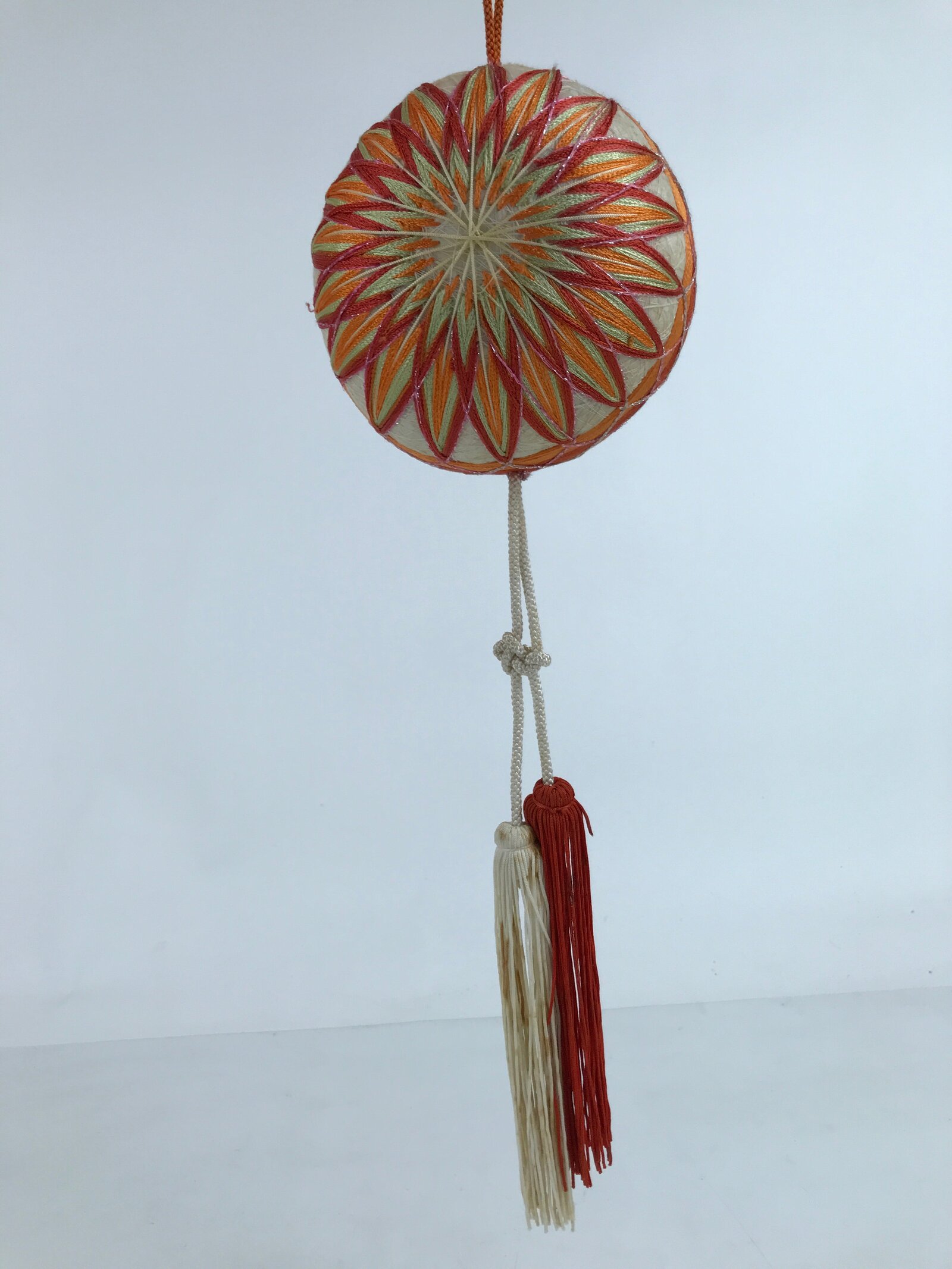 This traditionally crafted Japanese fabric ball, Temari, has been constructed using woven vibrant orange, red, pink and beige silk embroidery thread/floss in a deisng that features two large chrysanthemums on either end, an orange and red band at the center, and a crisscross lattice of pink and silver. This particular mari can hang and has two large red and white tassels at the bottom, the colors synonymous with New Year. It is likely stuffed with dried rice hulls/husks and is contained by a soft beige cloth beneath the silk threads.