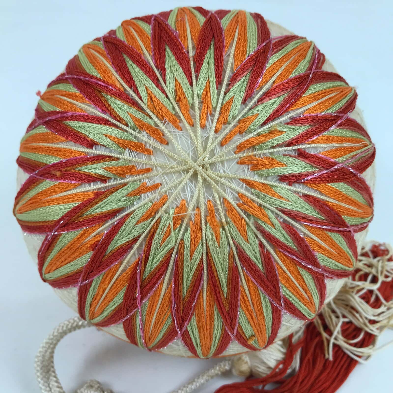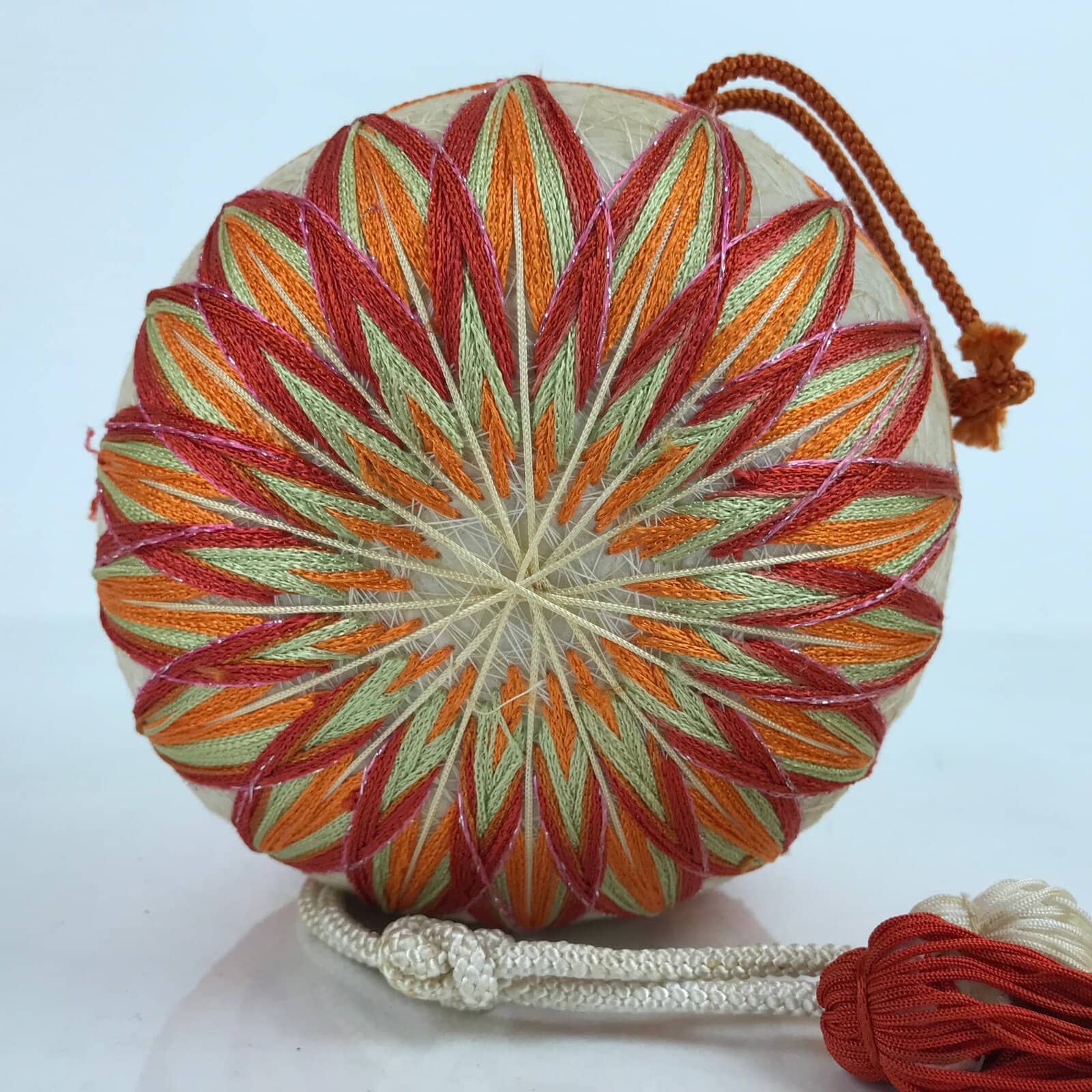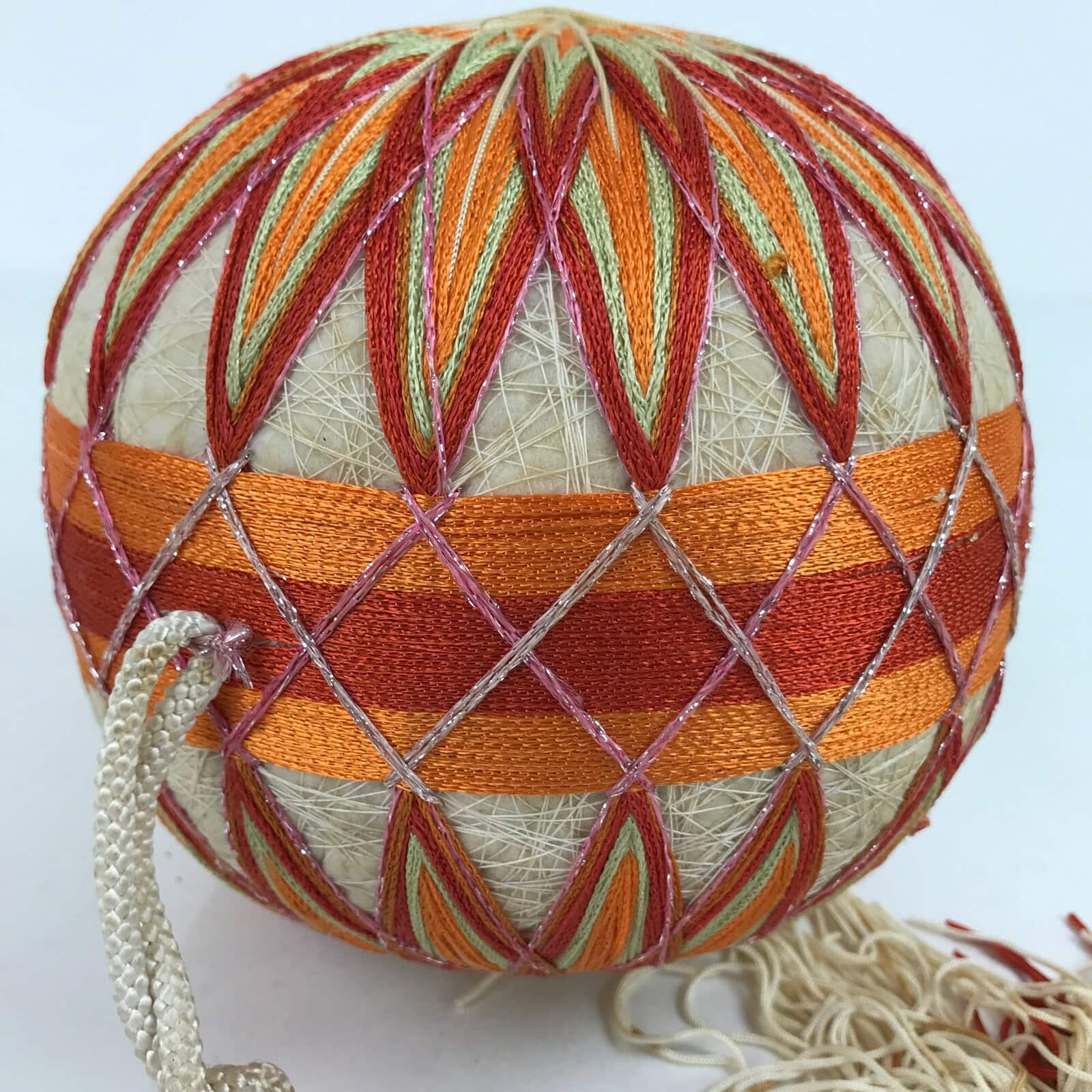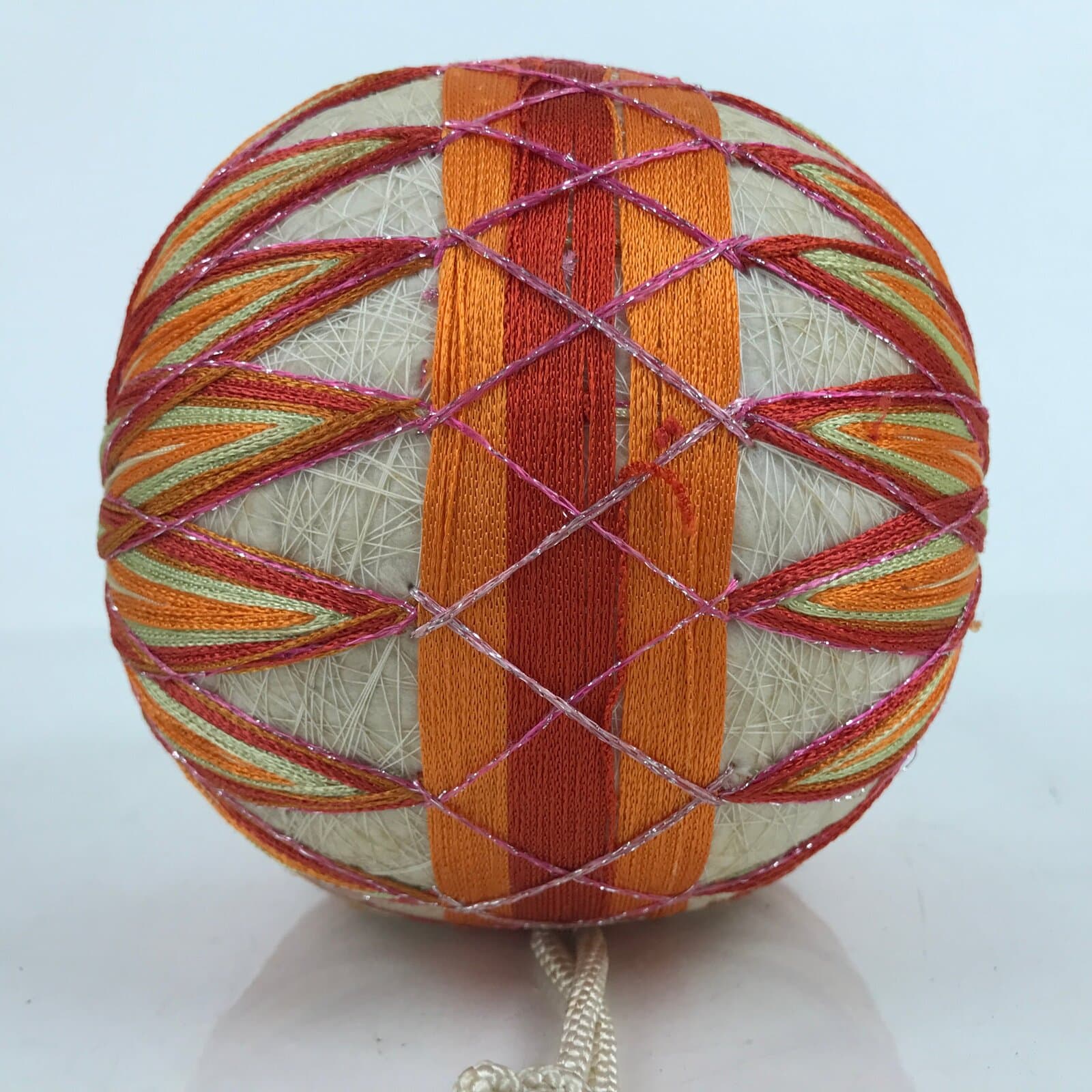This traditionally crafted Japanese fabric ball, Temari, has been constructed using woven vibrant orange, red, pink and beige silk embroidery thread/floss in a deisng that features two large chrysanthemums on either end, an orange and red band at the center, and a crisscross lattice of pink and silver. This particular mari can hang and has two large red and white tassels at the bottom, the colors synonymous with New Year. It is likely stuffed with dried rice hulls/husks and is contained by a soft beige cloth beneath the silk threads.