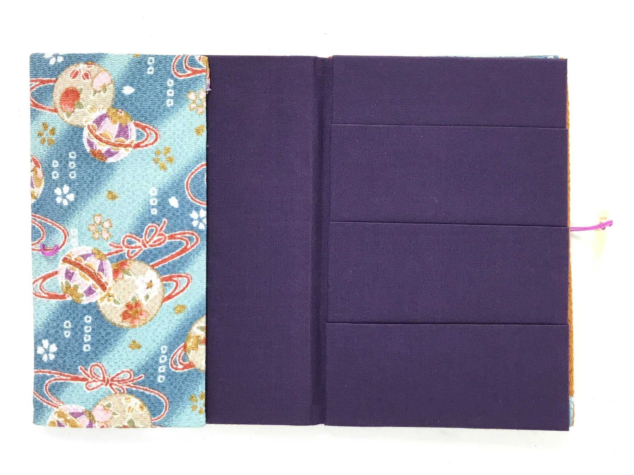 This is a vintage Japanese cushioned fabric-covered card holder. It has four places to hold cards: three small cards and one bigger one. It has a resin latch and purple string to keep it closed. The fabric outside has balls and ribbon designs in streaming-like two tones of blue color, and gold, pink, and white cherry blossoms are throughout. The fabric inside is purple.