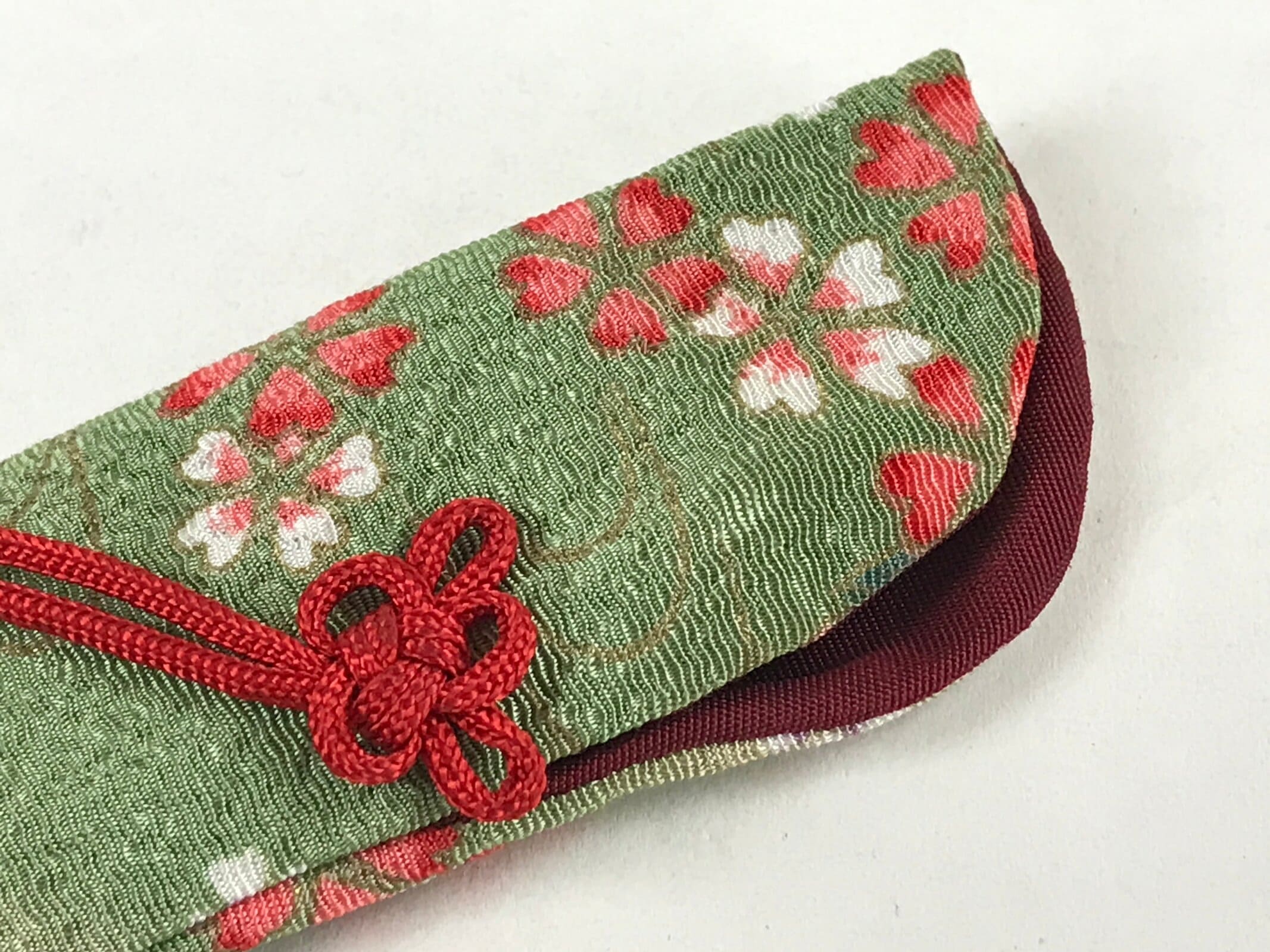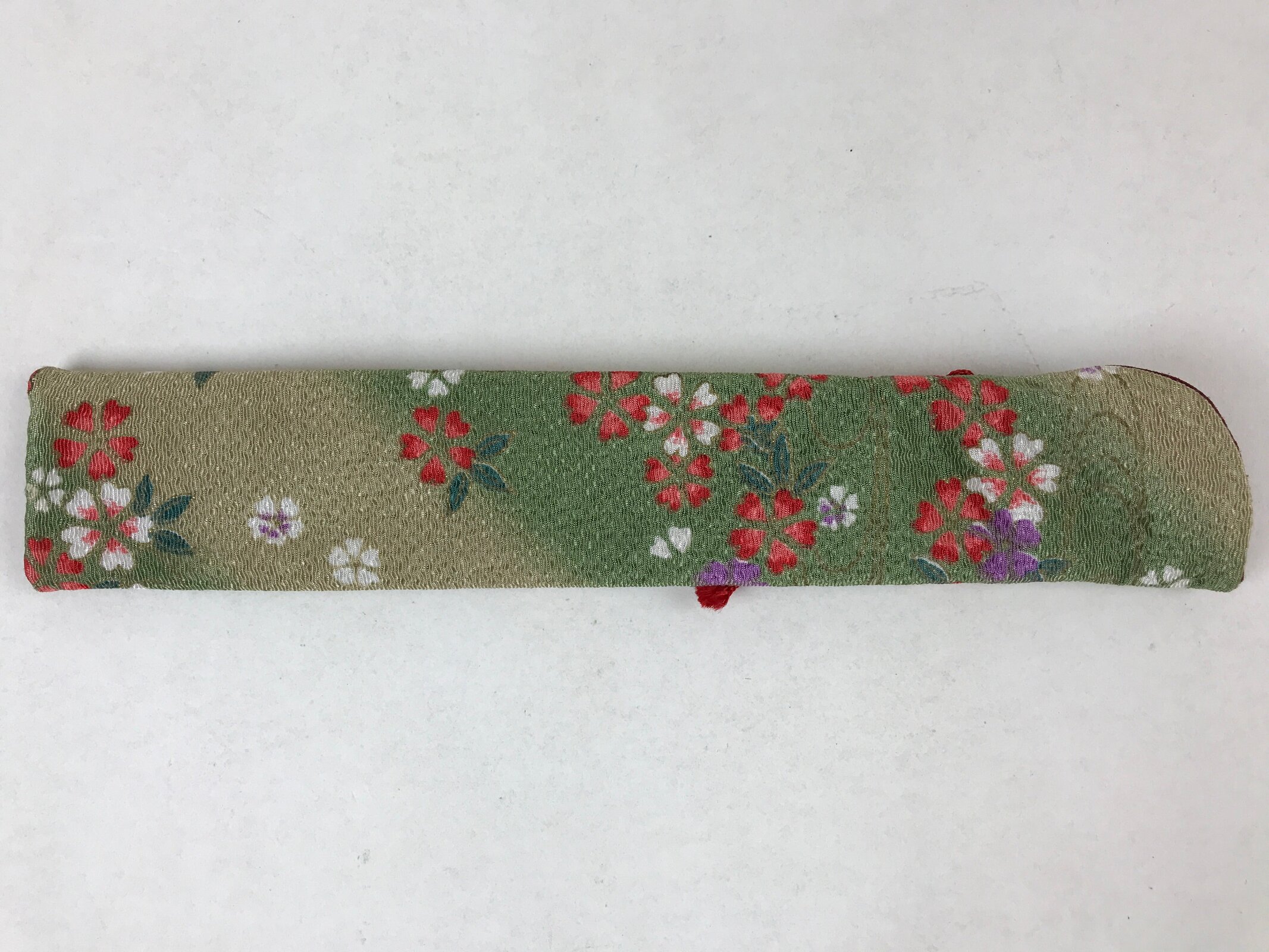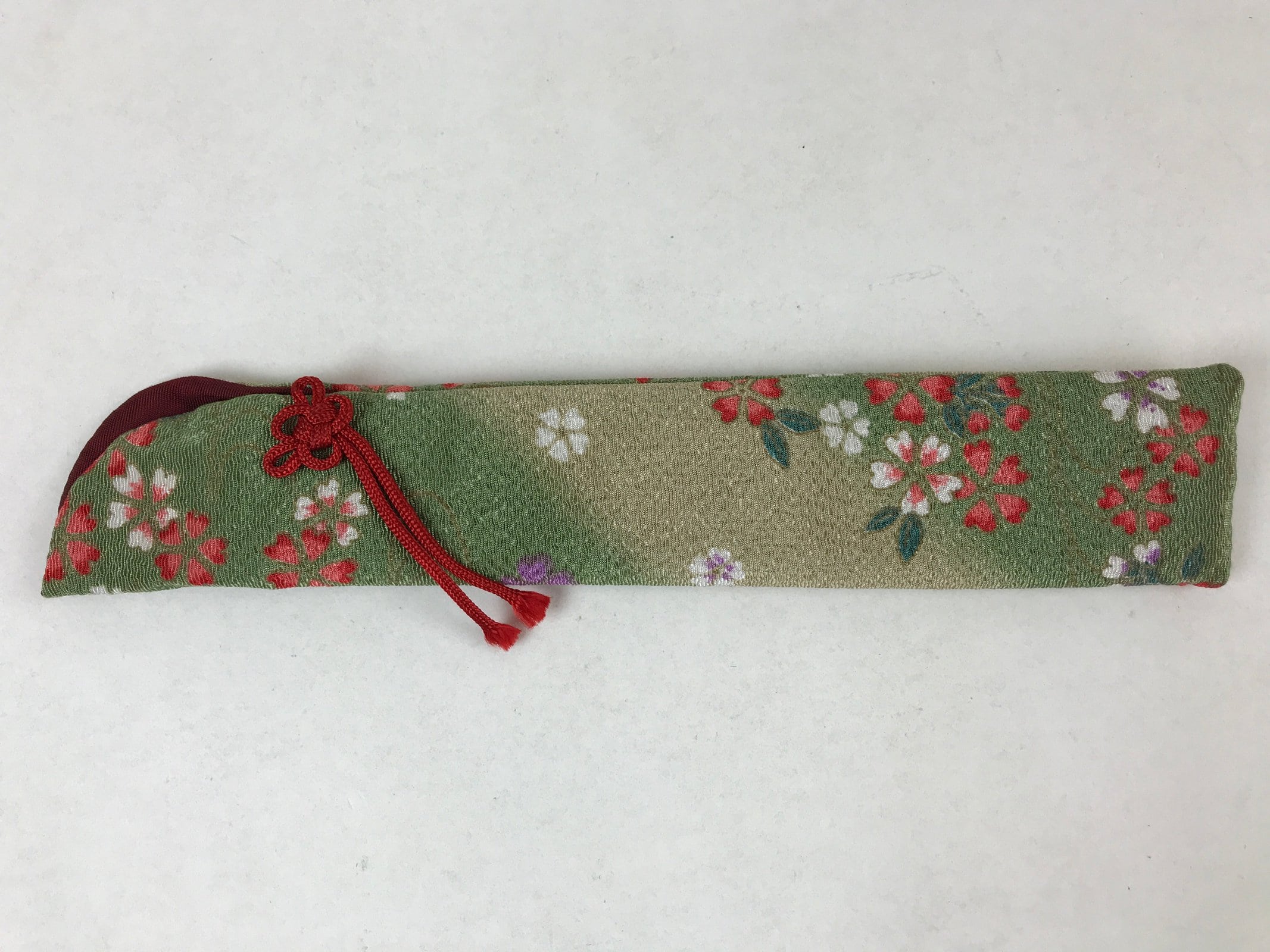 This is a vintage Japanese folding fan case/carrying sleeve, or sensubukuro. With textured green and red fabric featuring a cherry blossom design, this case is perfect for standard-size folding fans (22cm). It also has a red knotted cord for decoration and a burgundy lining. The top is open for easy access.