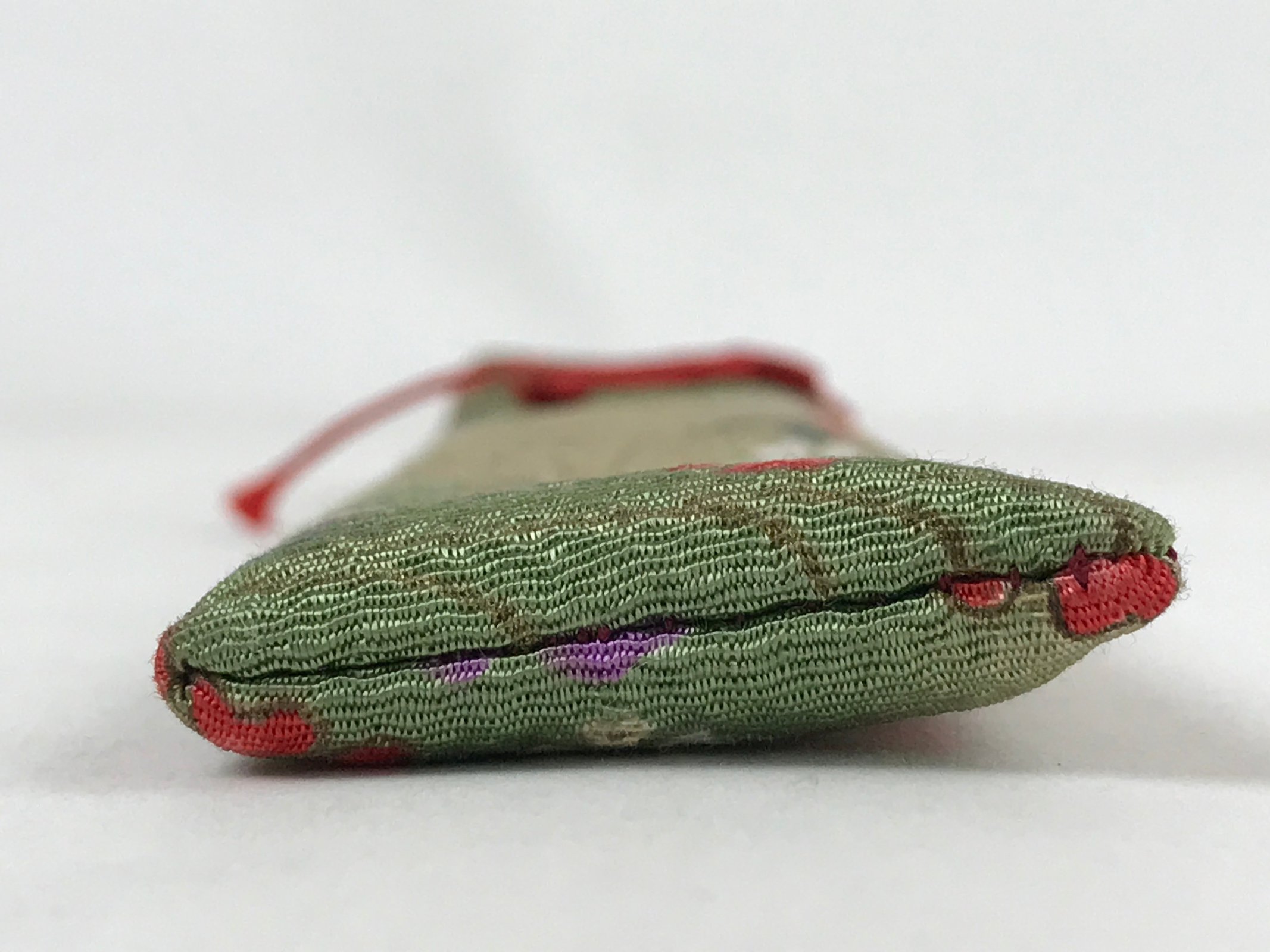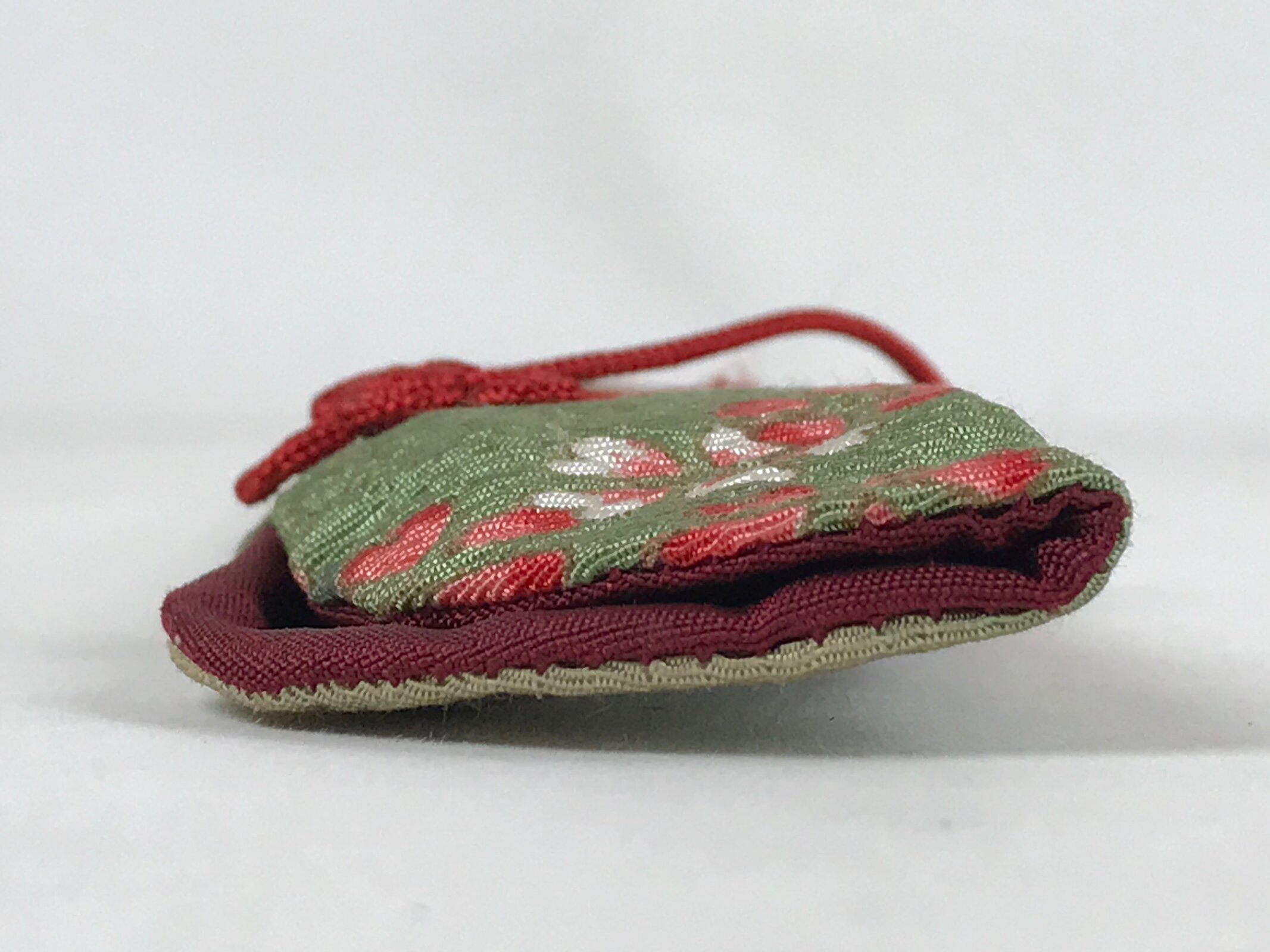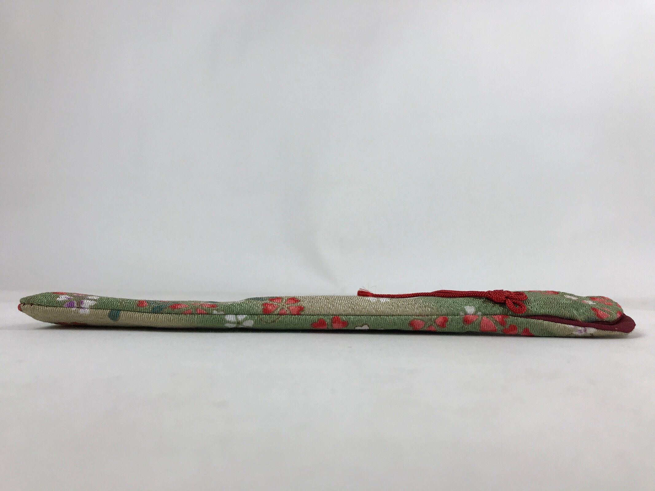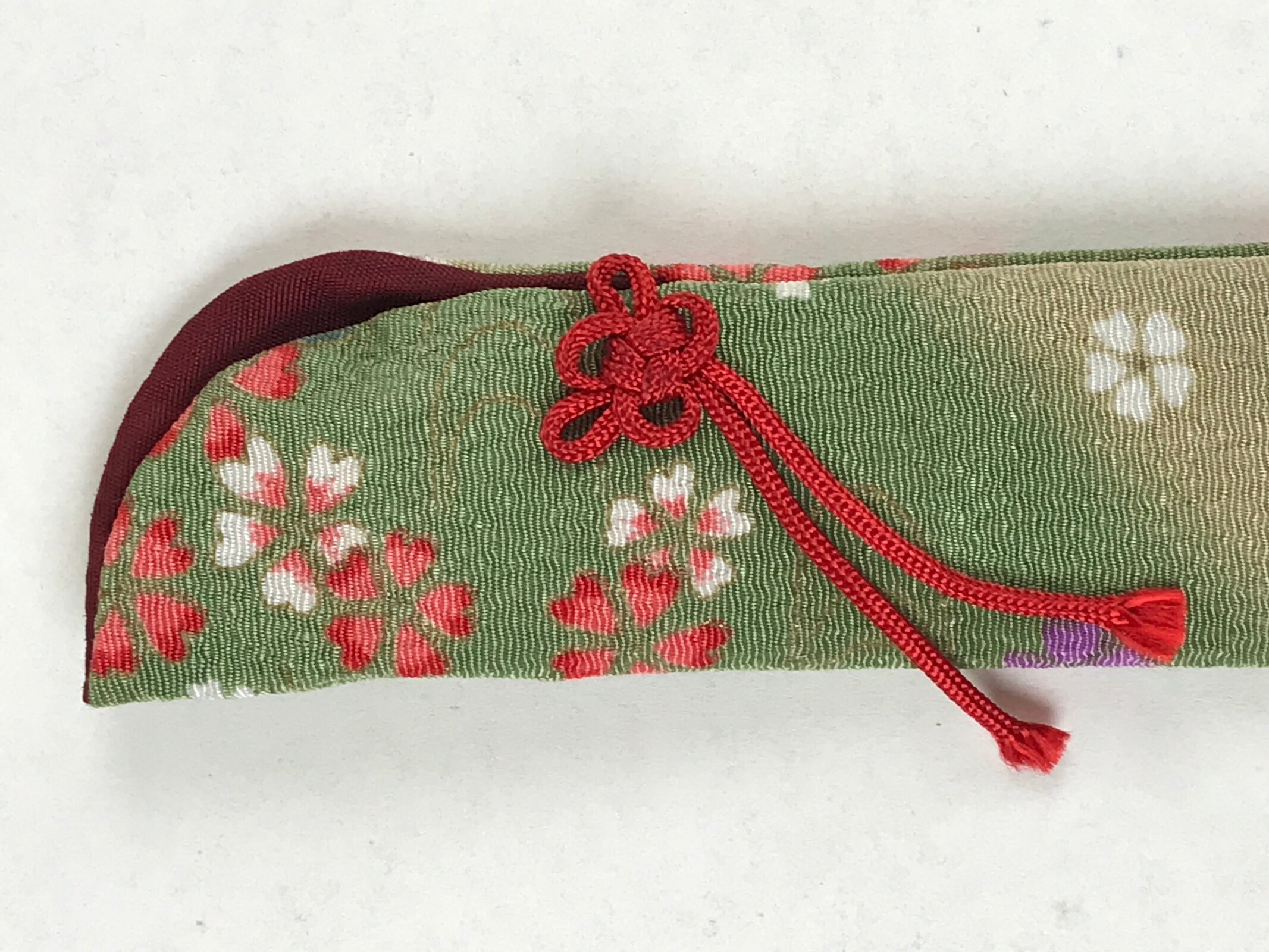 This is a vintage Japanese folding fan case/carrying sleeve, or sensubukuro. With textured green and red fabric featuring a cherry blossom design, this case is perfect for standard-size folding fans (22cm). It also has a red knotted cord for decoration and a burgundy lining. The top is open for easy access.