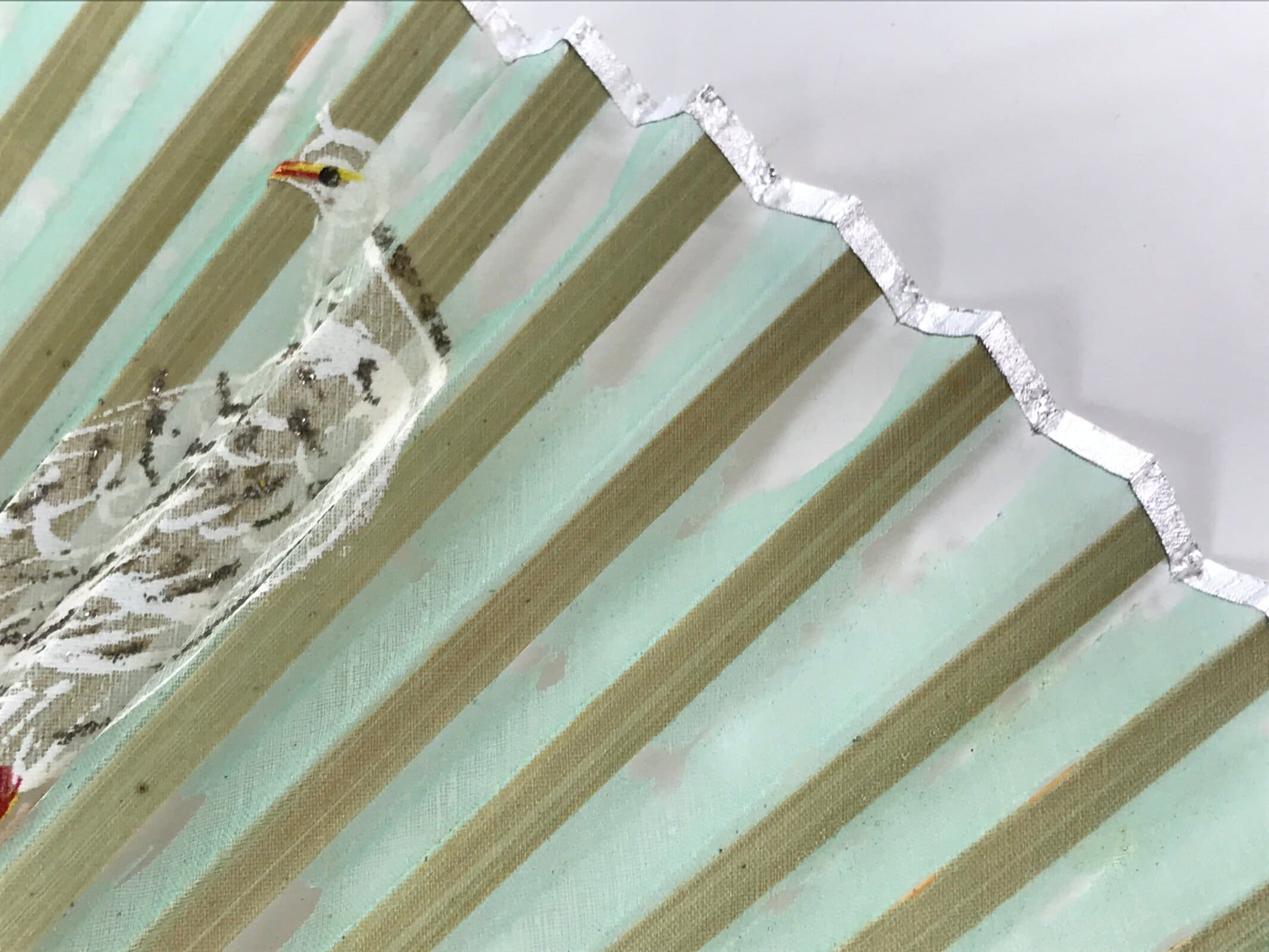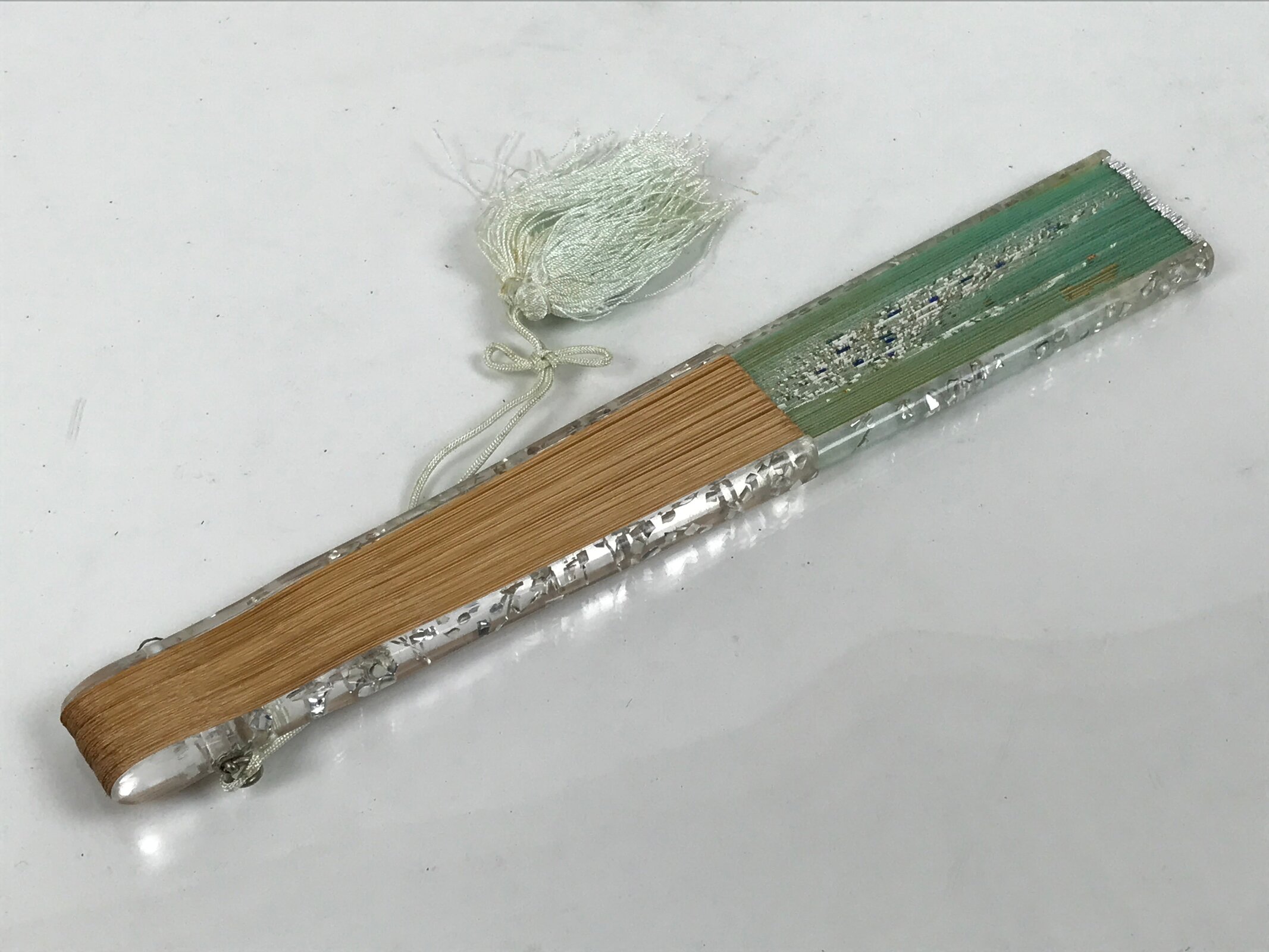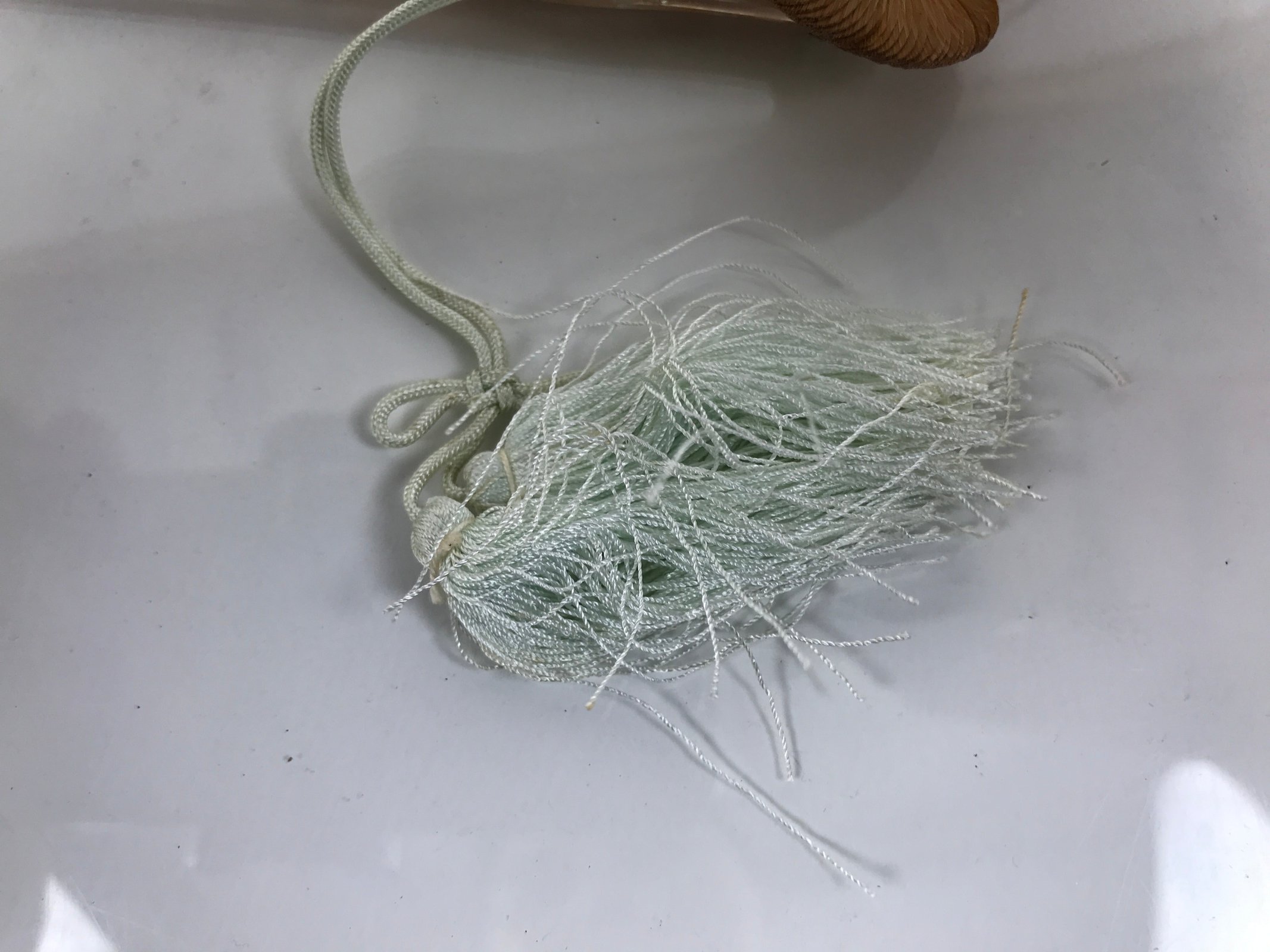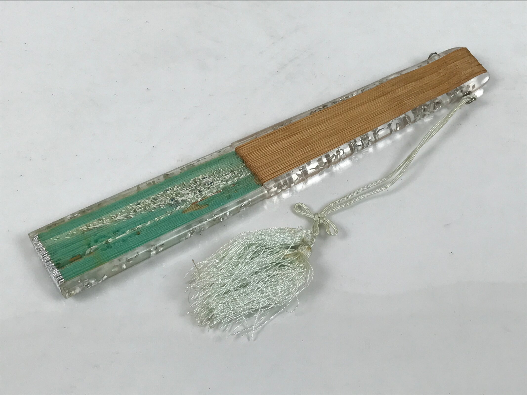 This is a traditional Japanese folding fan called sensu. You can use this when it’s hot or as decoration. This decorative fan is made with a sheer mint-green fabric that features a white and blue peacock. The frame is a combination of natural bamboo and resin. There is a mint-green string with tassels attached to the bottom.