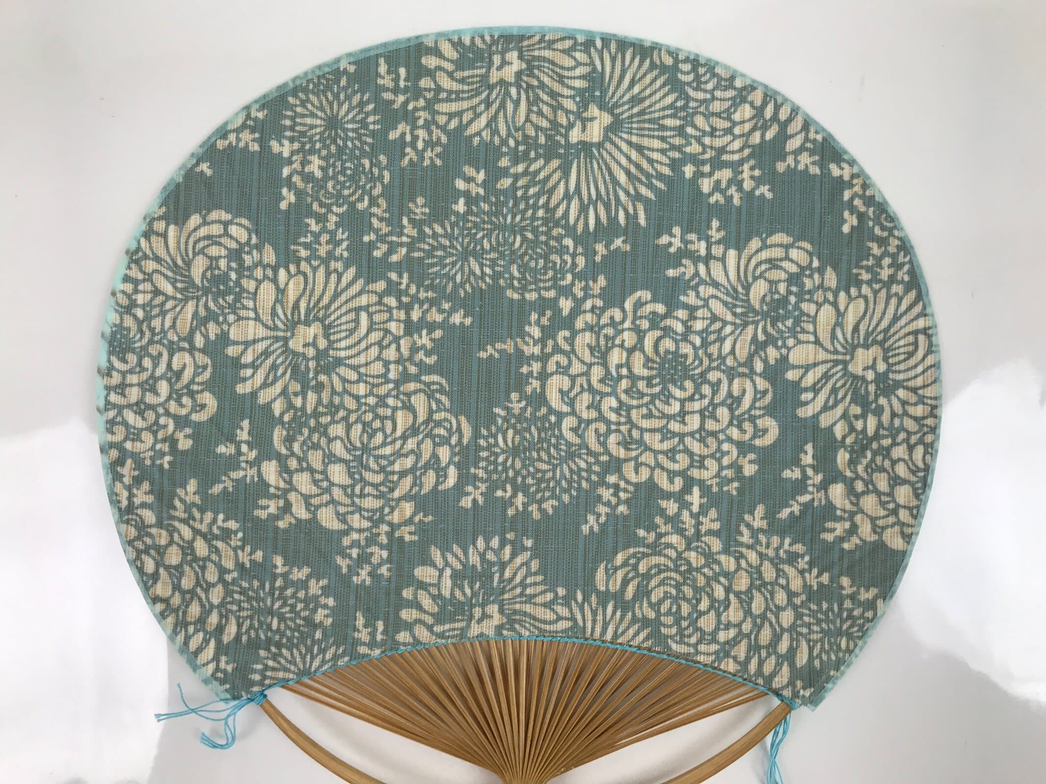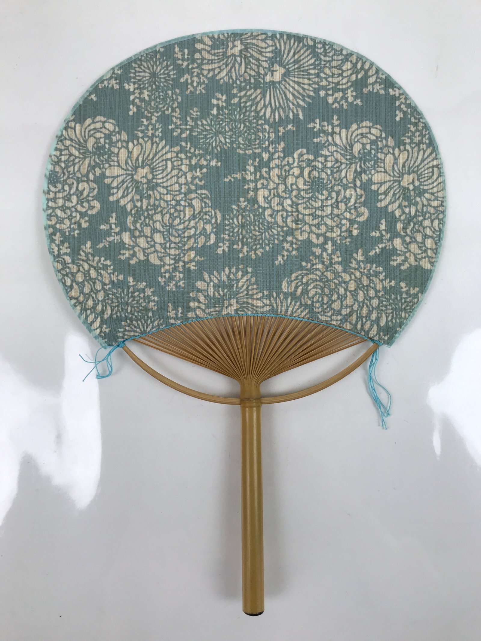 Japanese Fabric Fan Uchiwa Vtg Bamboo Round Paper Back Blue Chrysanthemums U134