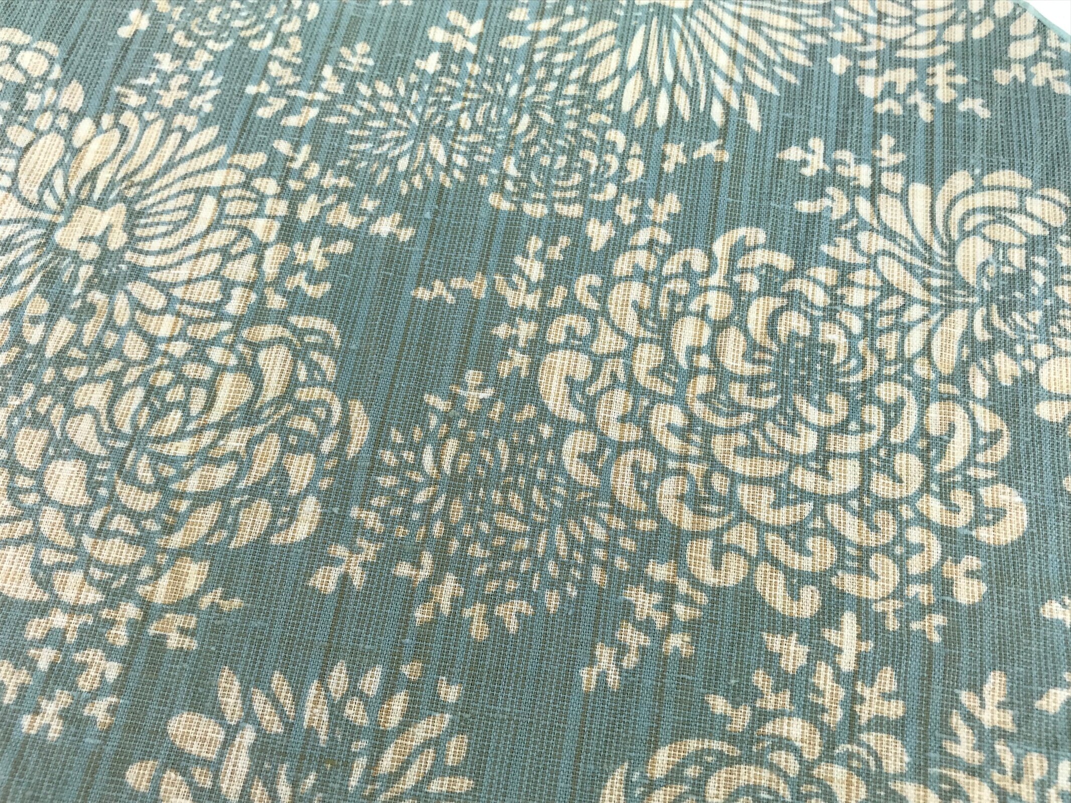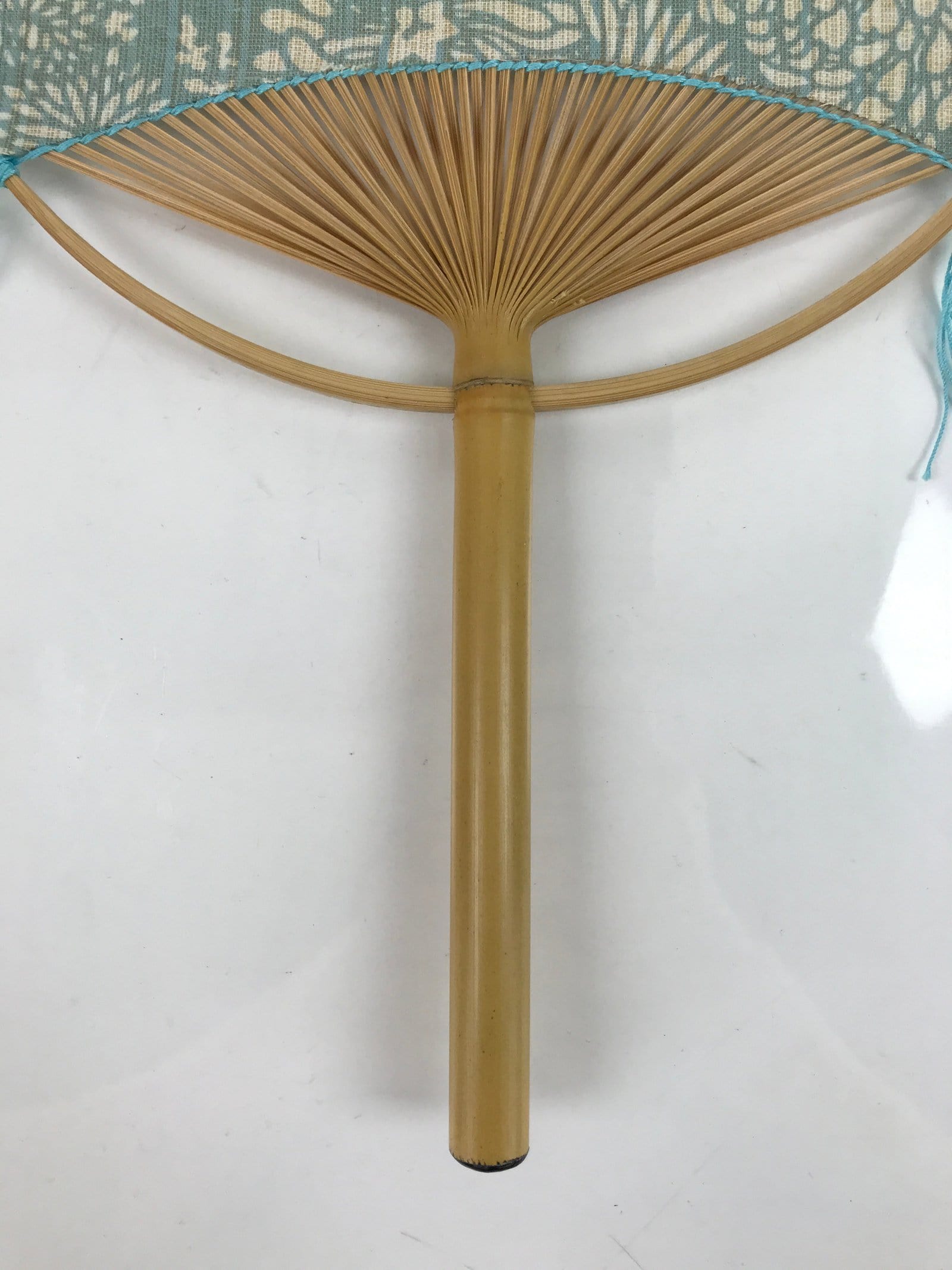 This is a Japanese vintage fabric fan or Uchiwa. Uchiwa is a traditional fan tool typically made of wood or bamboo and paper in a flat paddle-like shape. This particular fan is a classic round-shaped uchiwa made with a cloth front side with beautiful chrysanthemums in a light blue, and the back side made of plain white paper. There is also string tied at the very bottom edge of the fabric part with little tassels on both ends. It has a sturdy handle with black lacquer on the very end. It is functional, but also excellent as a decorative piece.