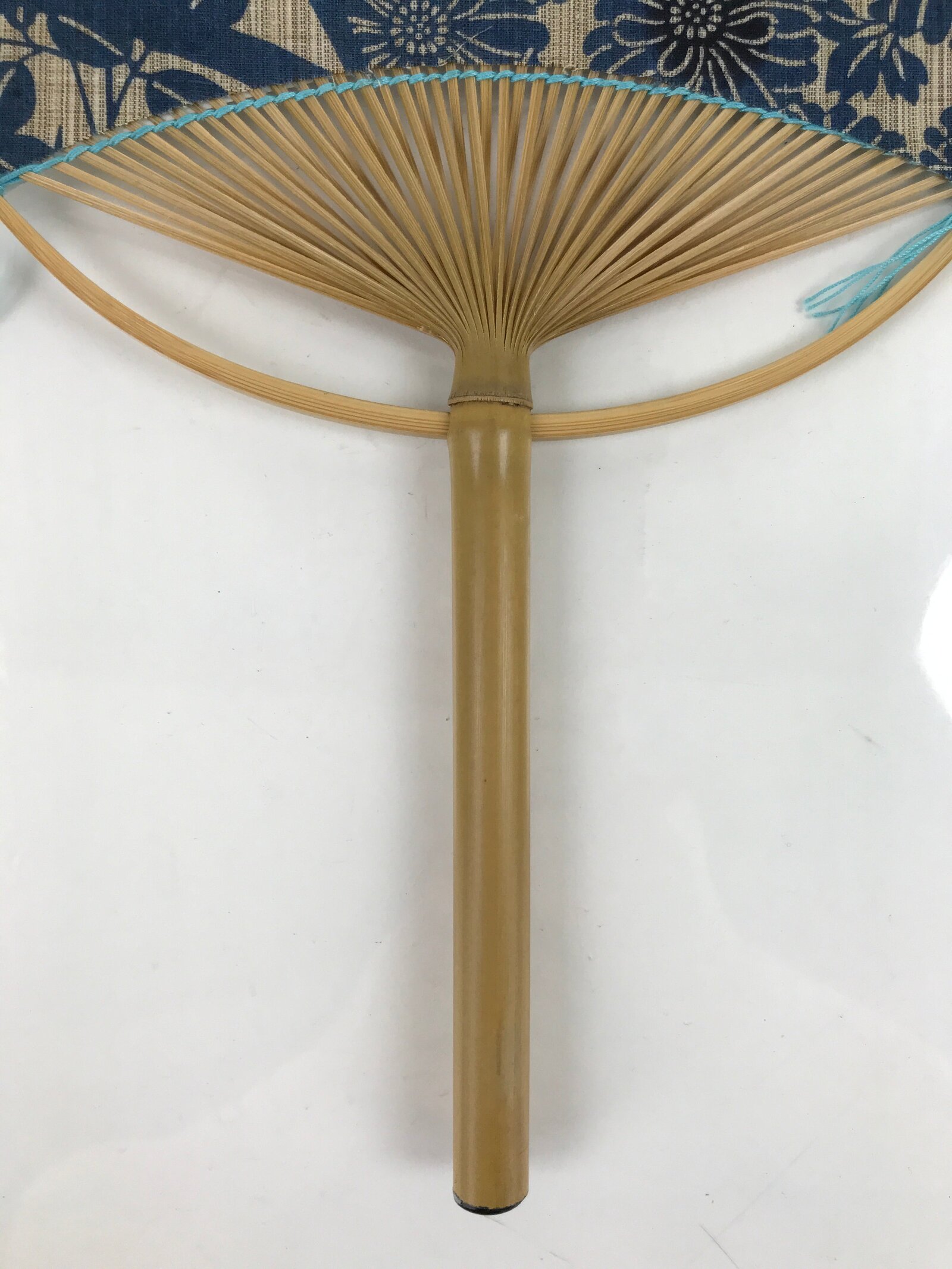Japanese Fabric Fan Uchiwa Vtg Bamboo Round Paper Traditional Floral Blue U143