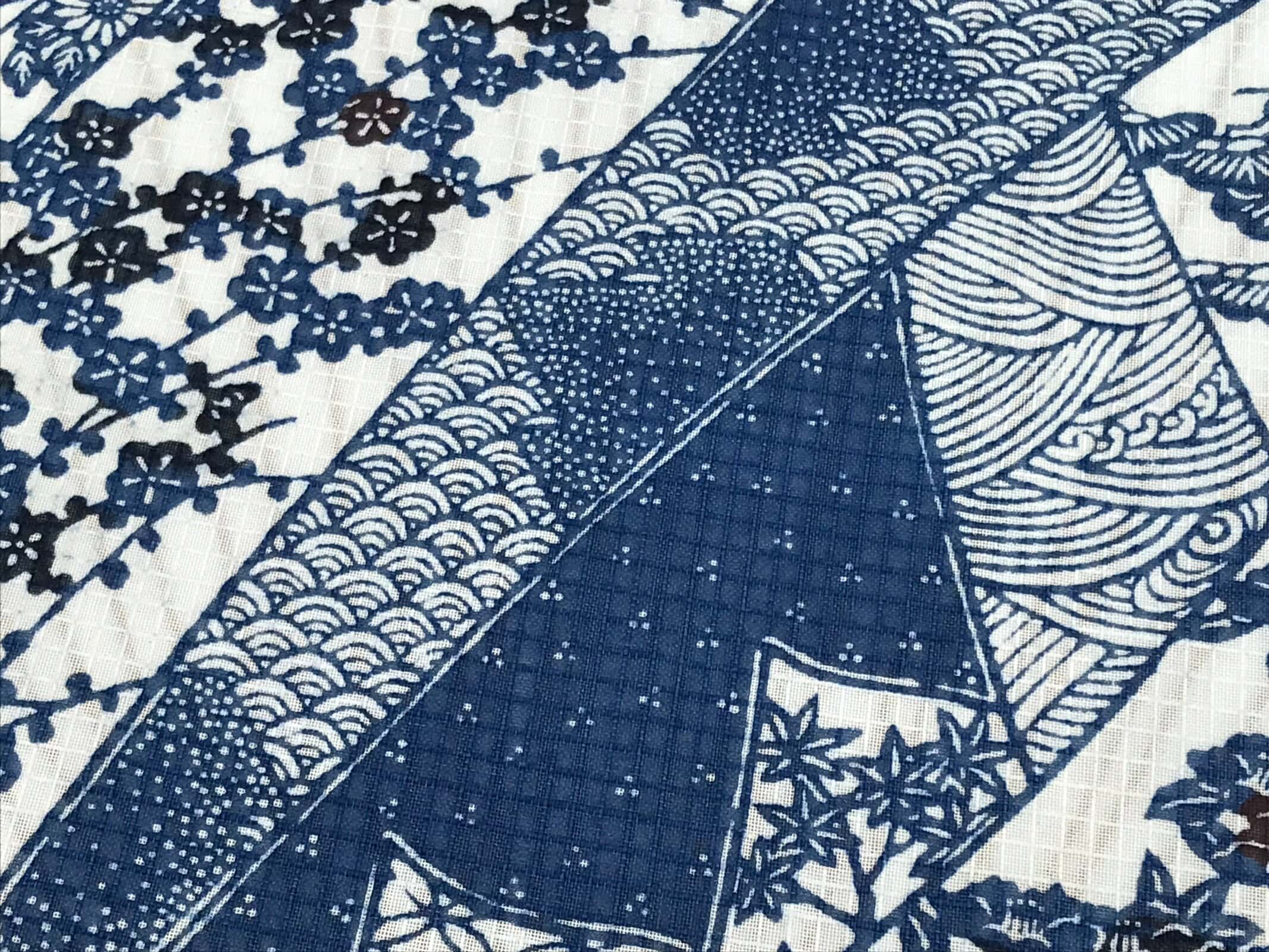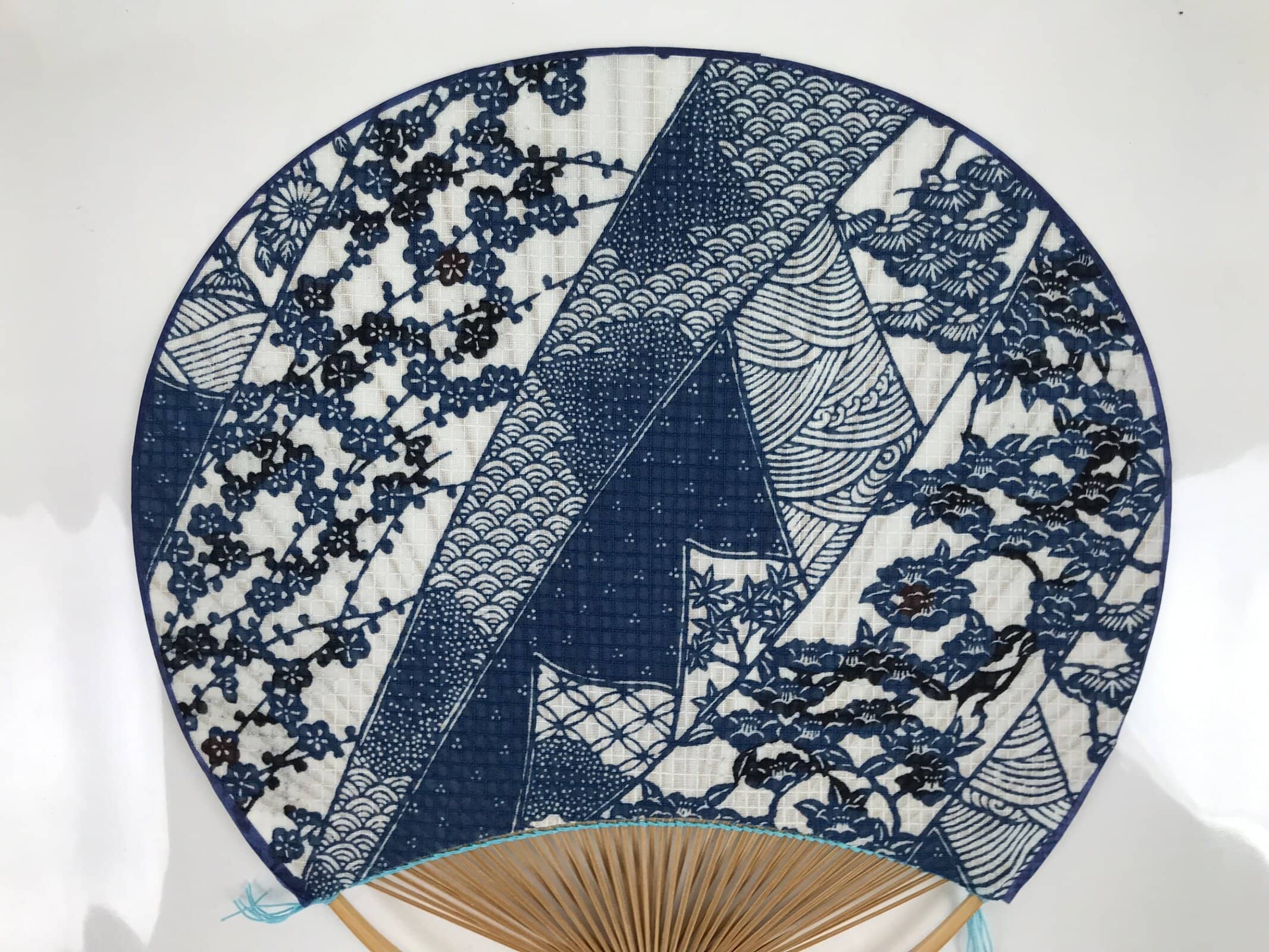 This is a Japanese vintage fabric fan or Uchiwa. Uchiwa is a traditional fan tool typically made of wood or bamboo and paper in a flat paddle-like shape. This particular fan is a classic round-shaped uchiwa made with a cloth front side with various floral motifs and traditional patterns such as seigaiha (calm ocean waves) in white and a rich indigo blue, and the back side made of plain white paper. There is also light blue string tied at the very bottom edge of the fabric part with little tassels on both ends. It has a sturdy handle with black lacquer on the very end. It is functional, but also excellent as a decorative piece.
