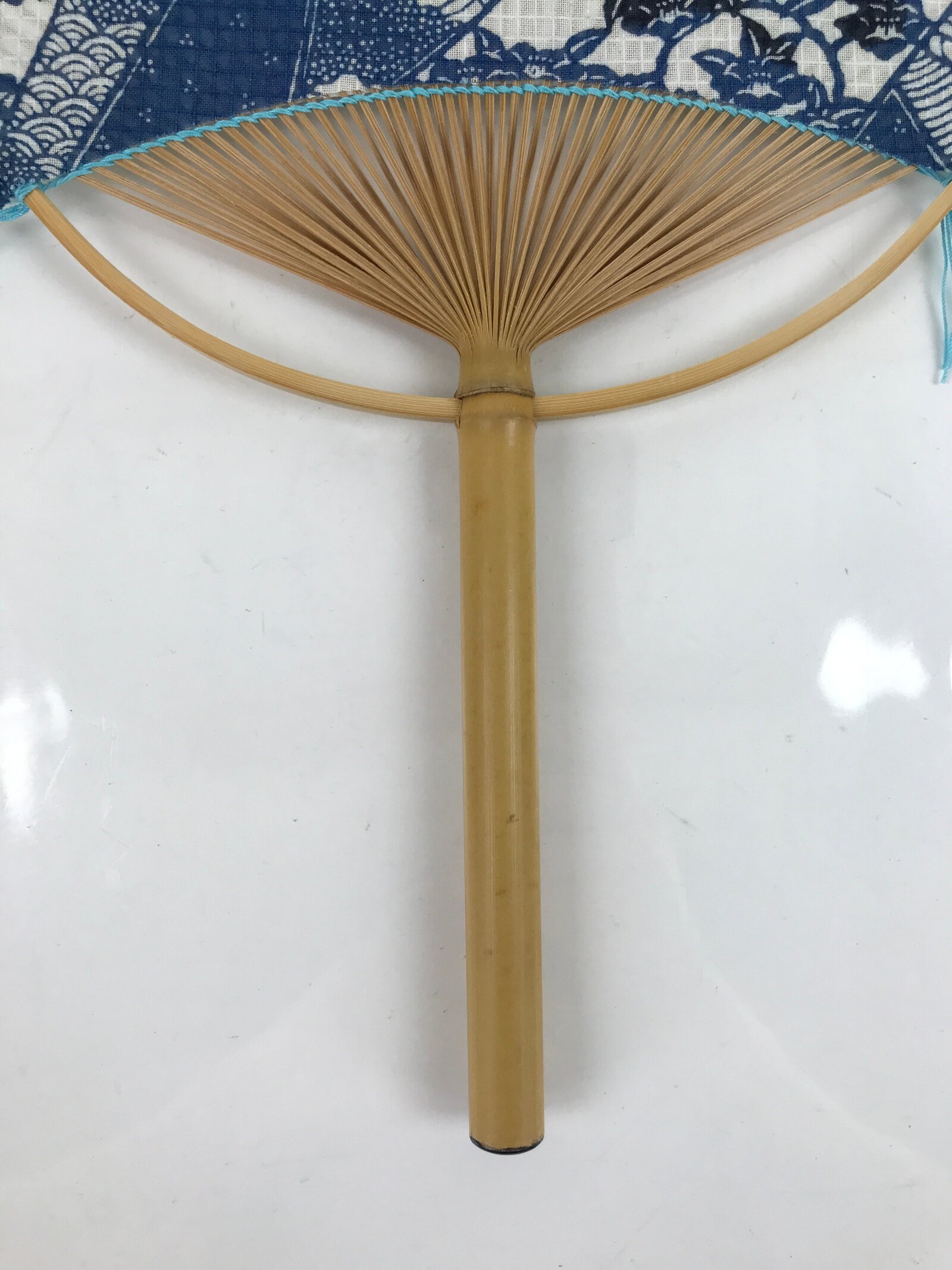 Japanese Fabric Fan Uchiwa Vtg Bamboo Round Paper Traditional Designs Blue U140