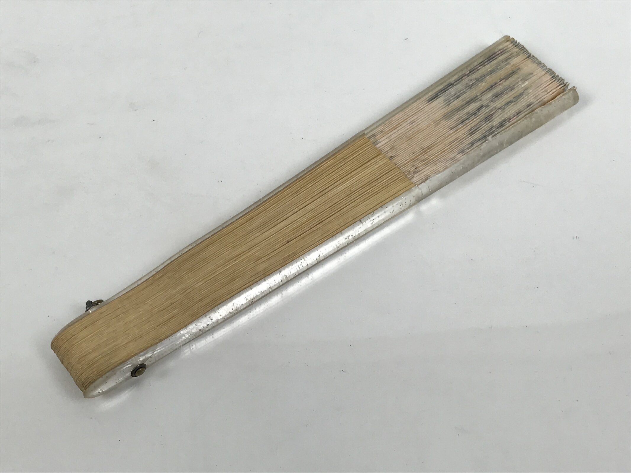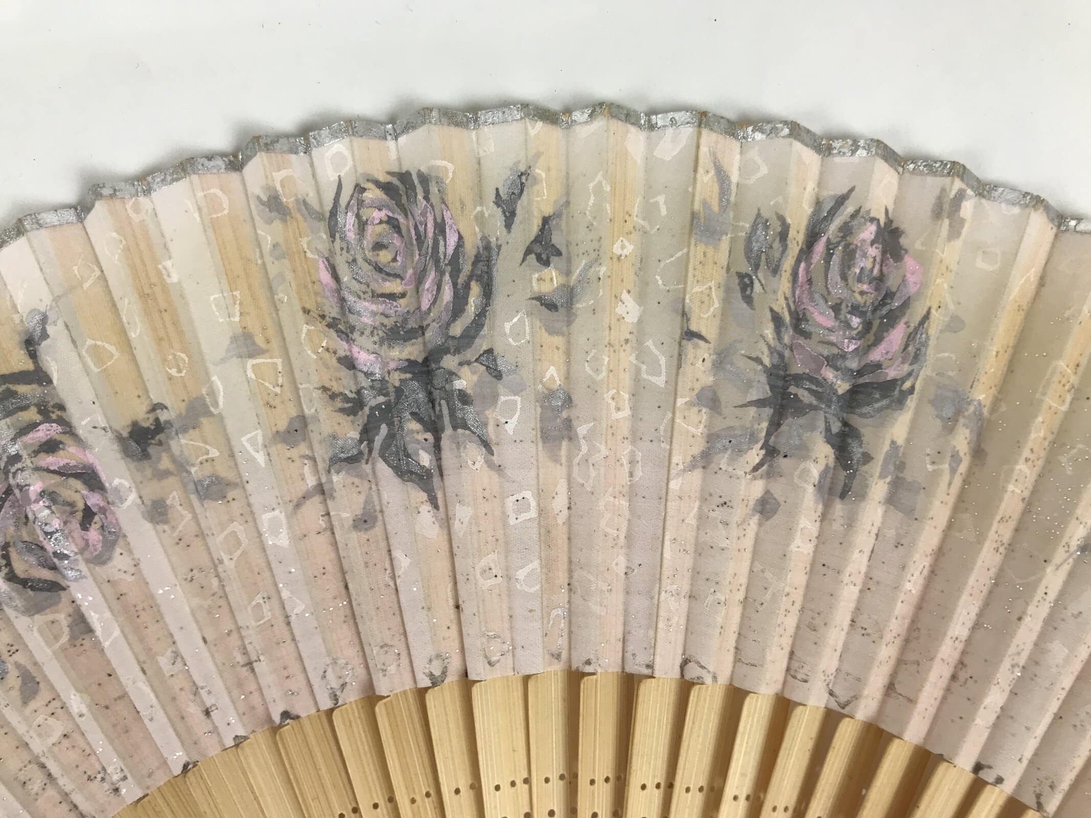 This is a traditional Japanese folding fan called sensu. You can use this when it’s hot or as decoration. This decorative fan is made with a sheer fabric. A very cool light pink, this fan features large pink roses and has silver sparkles throughout. The design is only on the front side. The frame is a combination of natural bamboo with decorative cutouts and clear resin end pieces with silver sparkles inside.