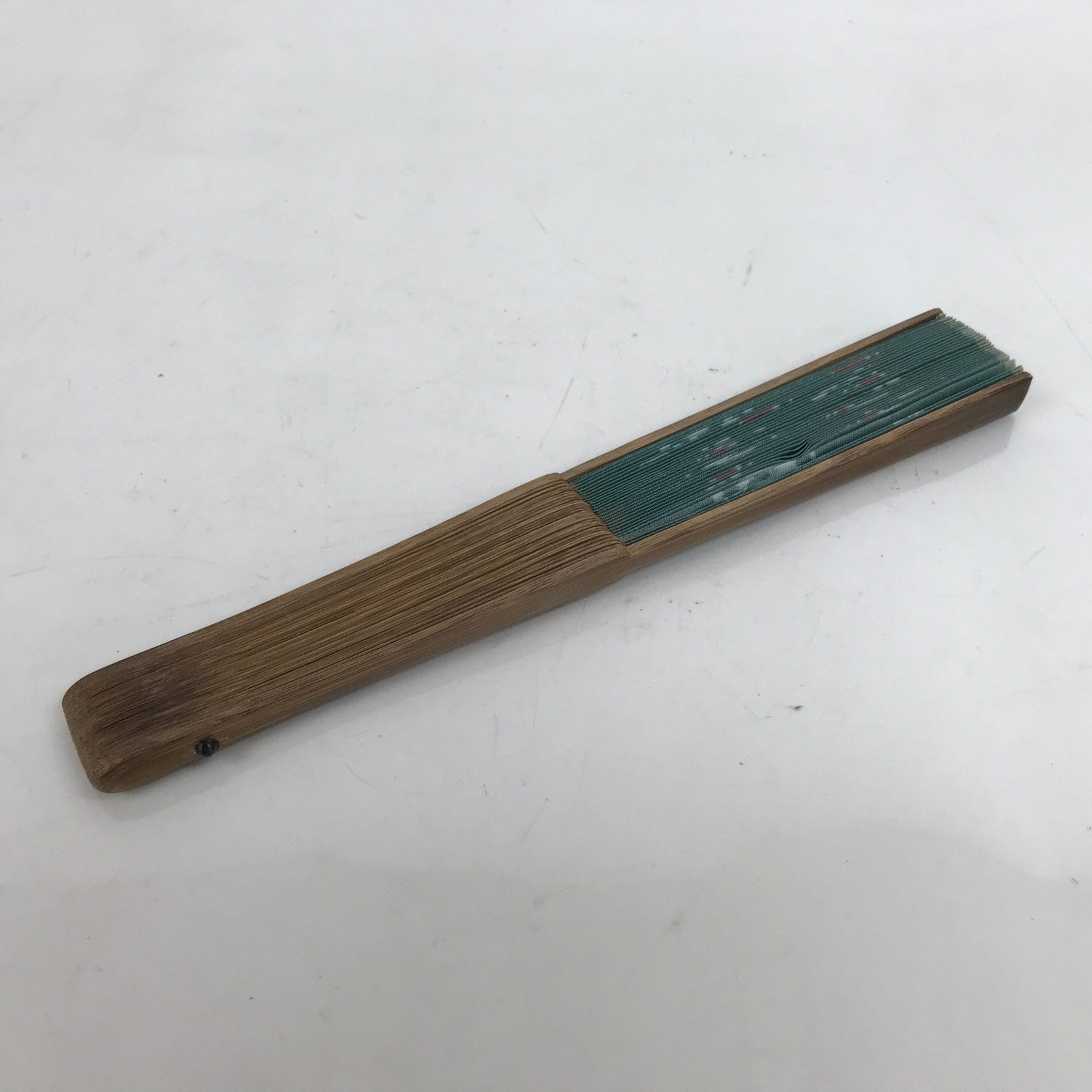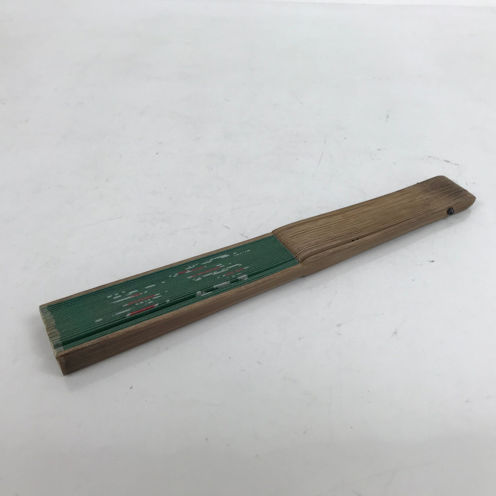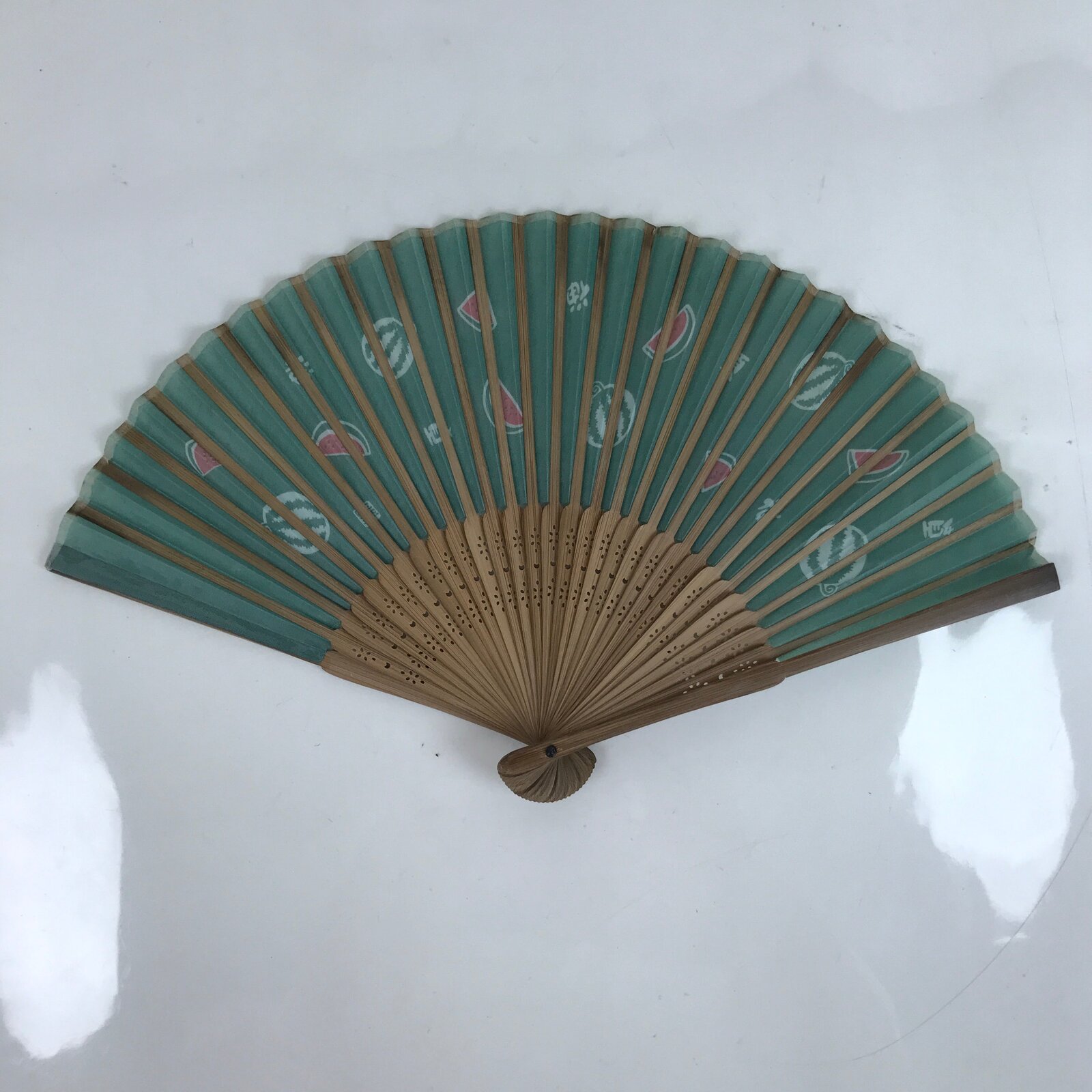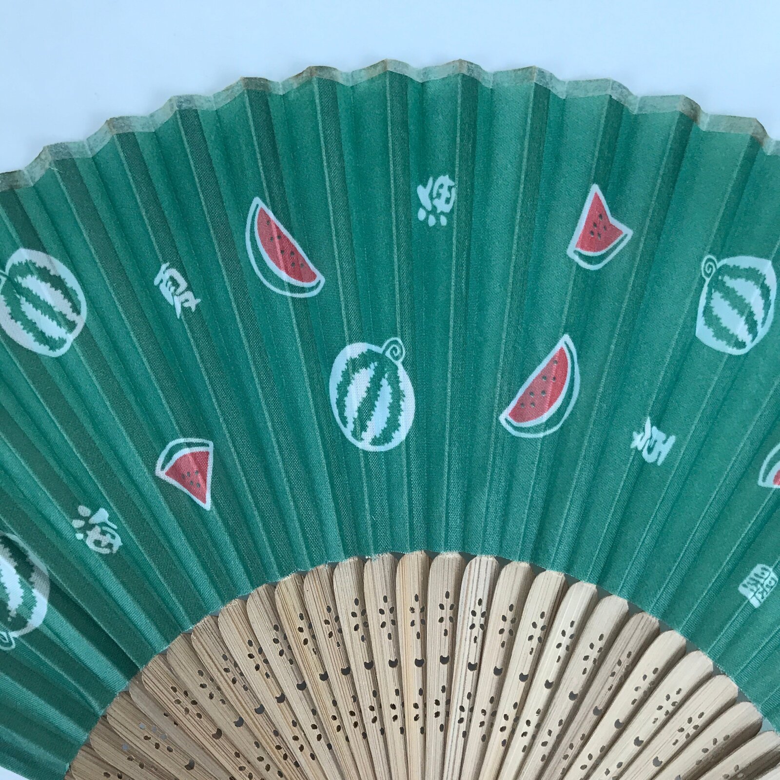 This is a traditional Japanese folding fan called sensu. You can use this when it’s hot or as decoration. This decorative fan is made with a green fabric featuring whole and sliced watermelons with the kanjis for “summer” and “ocean”. The back is blank. The frame is natural bamboo.