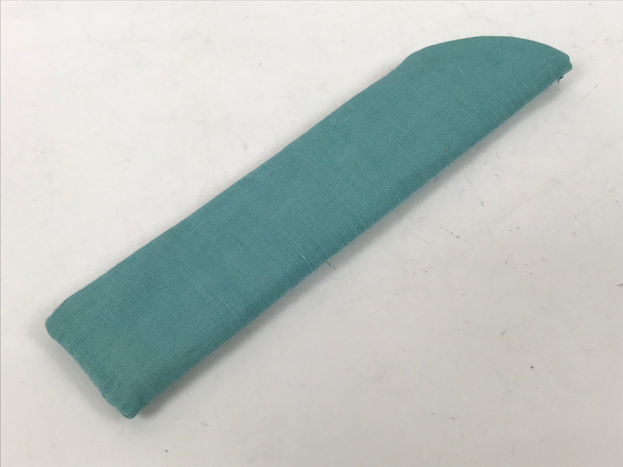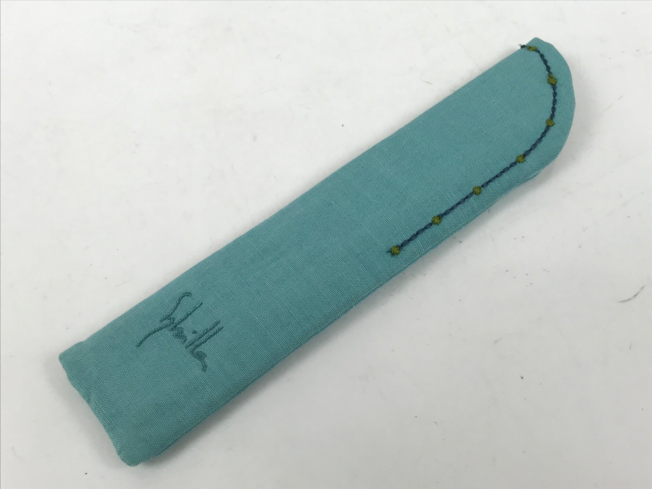 This is a traditional Japanese folding fan called sensu. You can use this when it’s hot or as decoration. This decorative fan is made with a blue fabric with small dots only on the outer edge. The frame is natural bamboo stained a grassy green color and has small floral and dot cutouts for detail. There is a small bamboo bead that is attached to the bottom by a string. It comes with a matching storage case made of blue fabric with small embroidery elements and green for the inside lining.