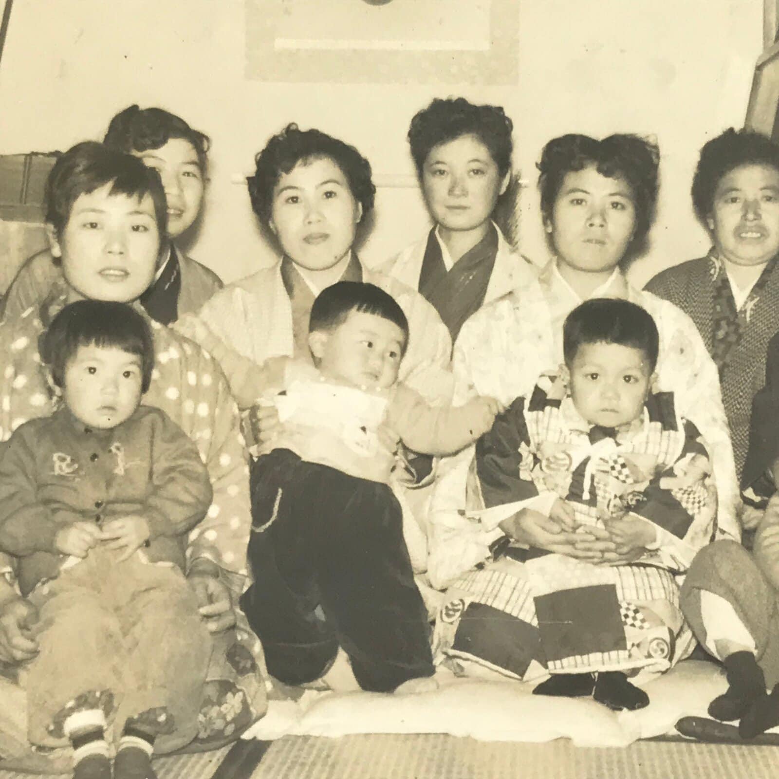 This is a black and white photograph of women in kimono with four young children. This family photo was likely taken during the New Years holiday where Japanese families come together and celebrate.