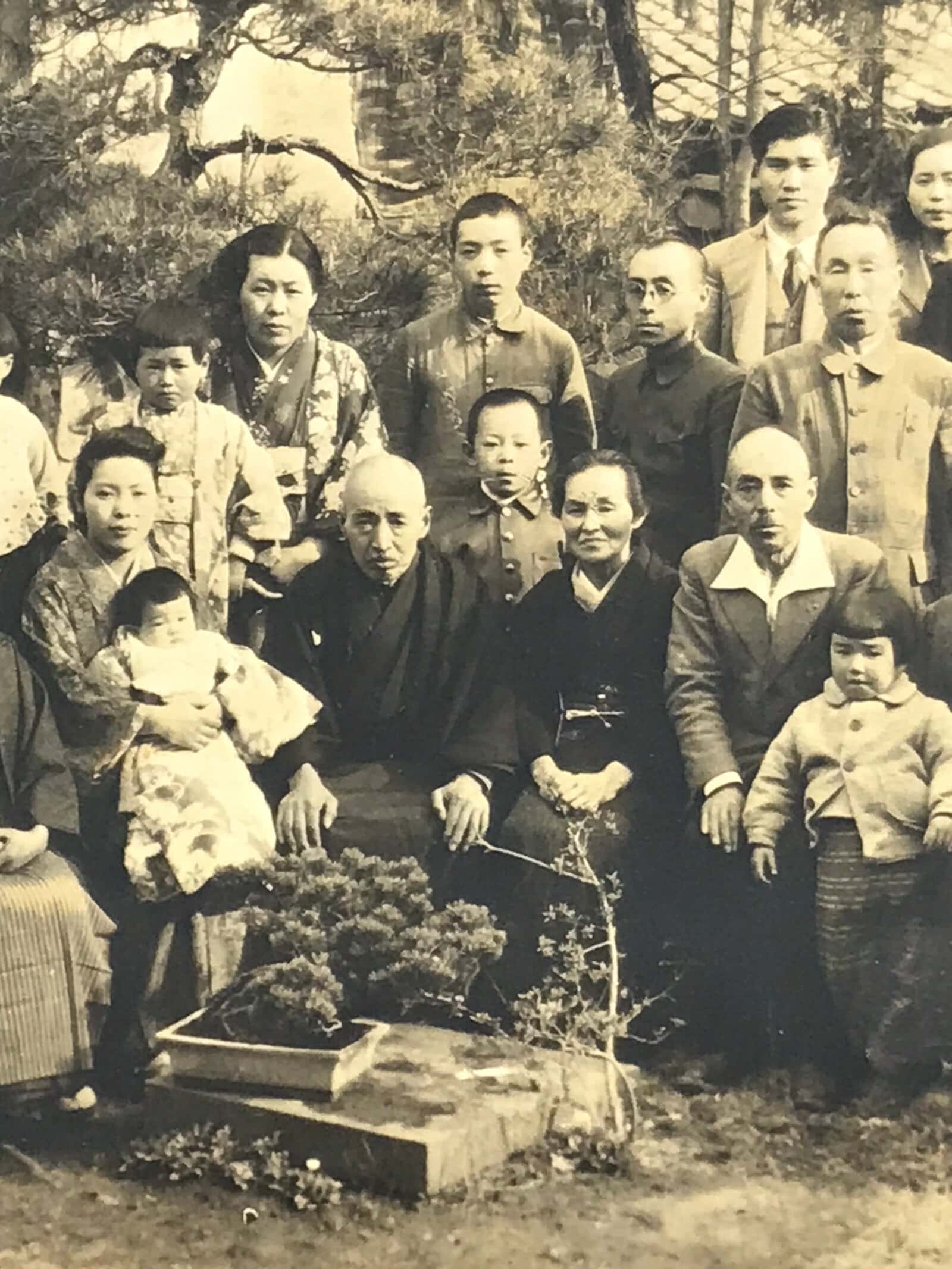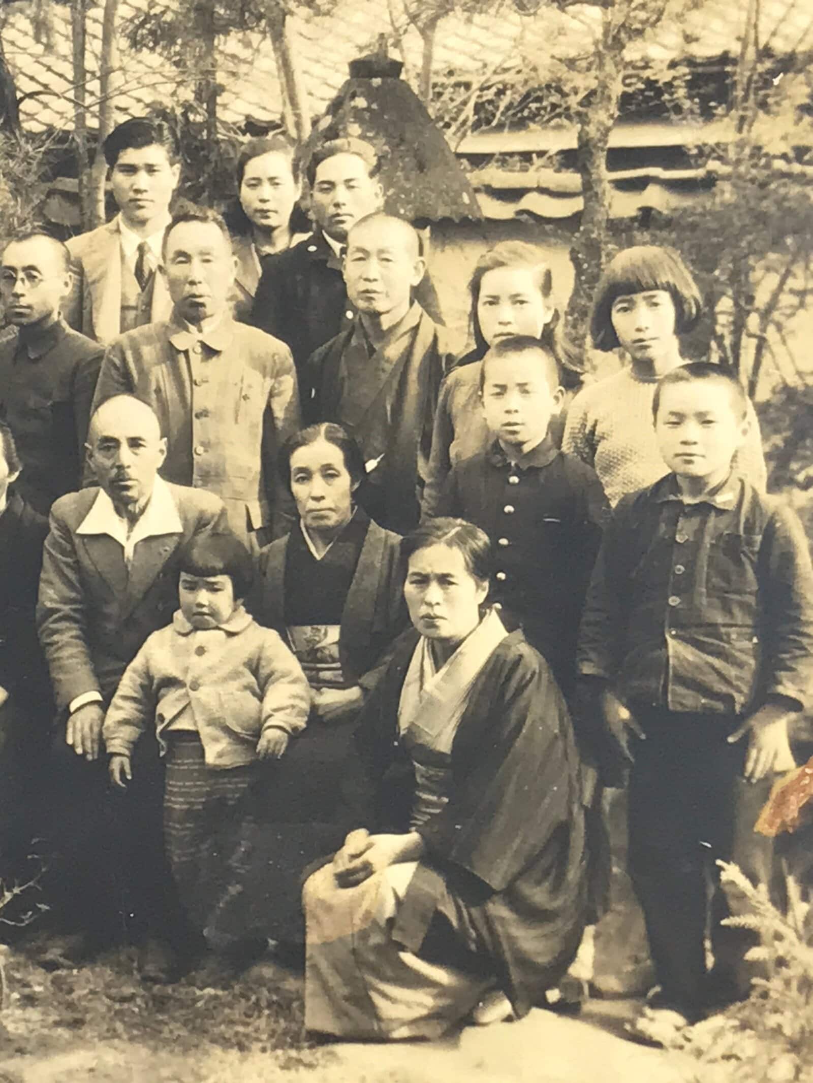 This is an original vintage Showa Era portrait photograph of a large multigenerational family taken in a back garden in a soft sepia tone. Majority of the adult women wear various styles of kimono while the men wear suits or other uniforms. Most of the children wear popular western clothing of the time.