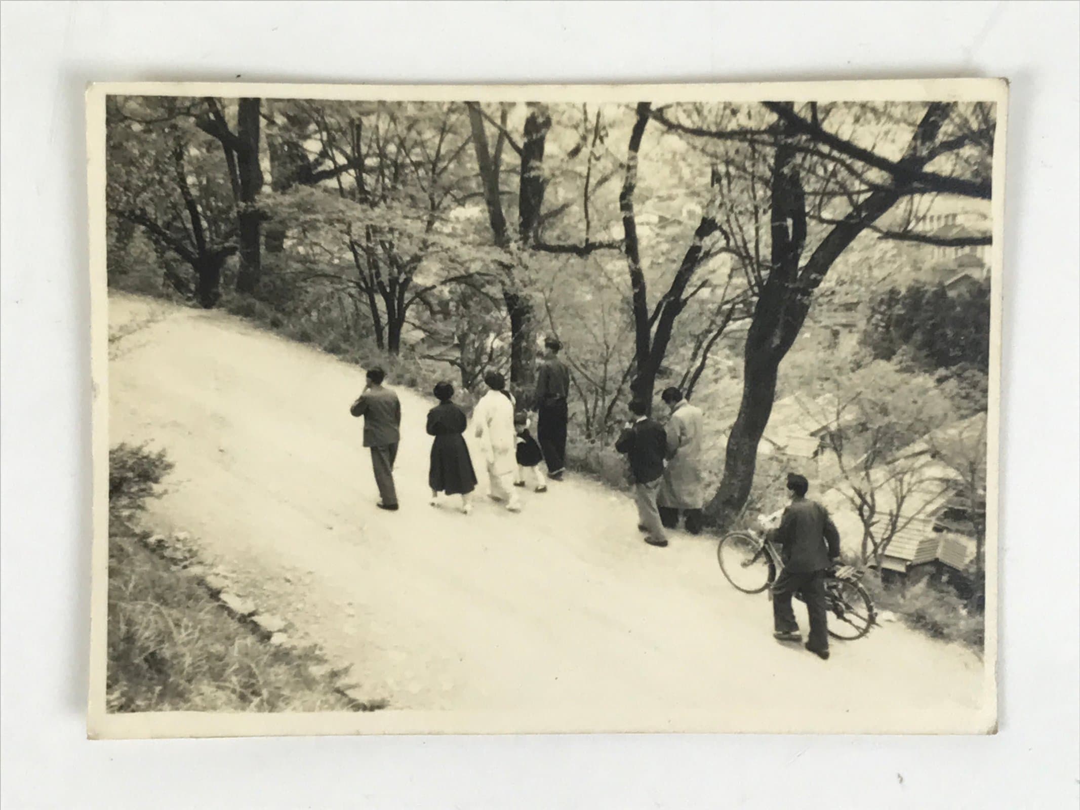 This is an original vintage Showa-era black and white photograph of a family with a little girl taking a walk along a tree-lined dirt road.