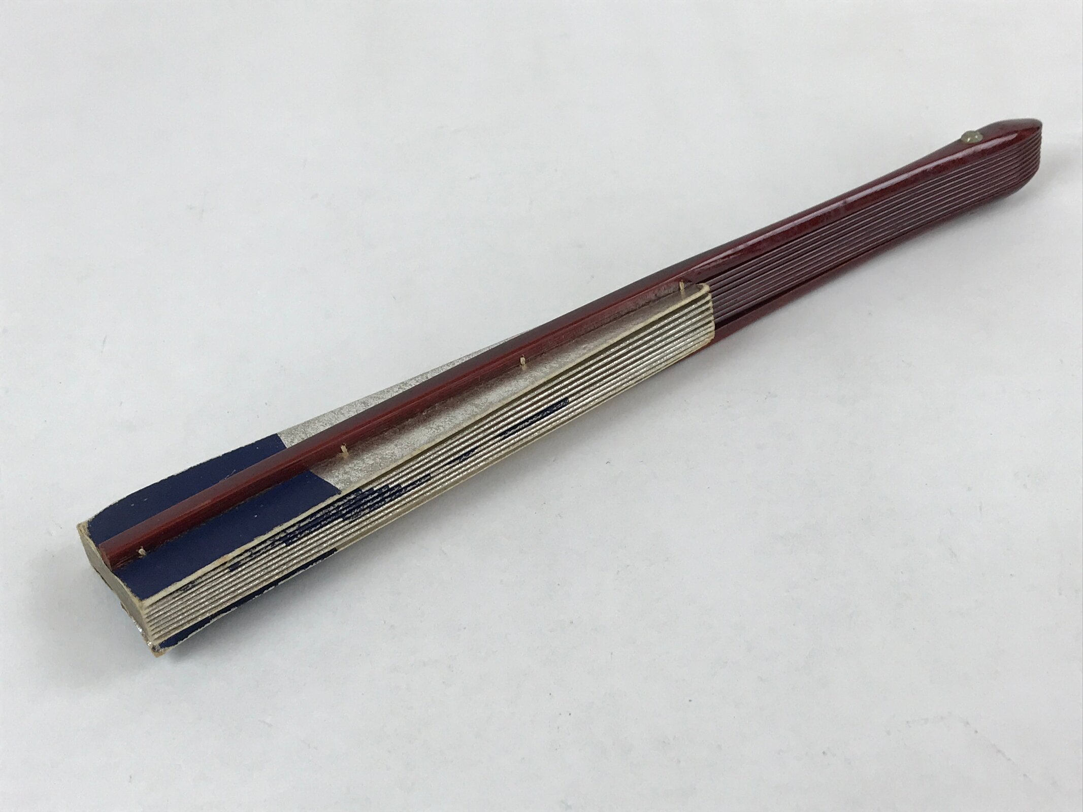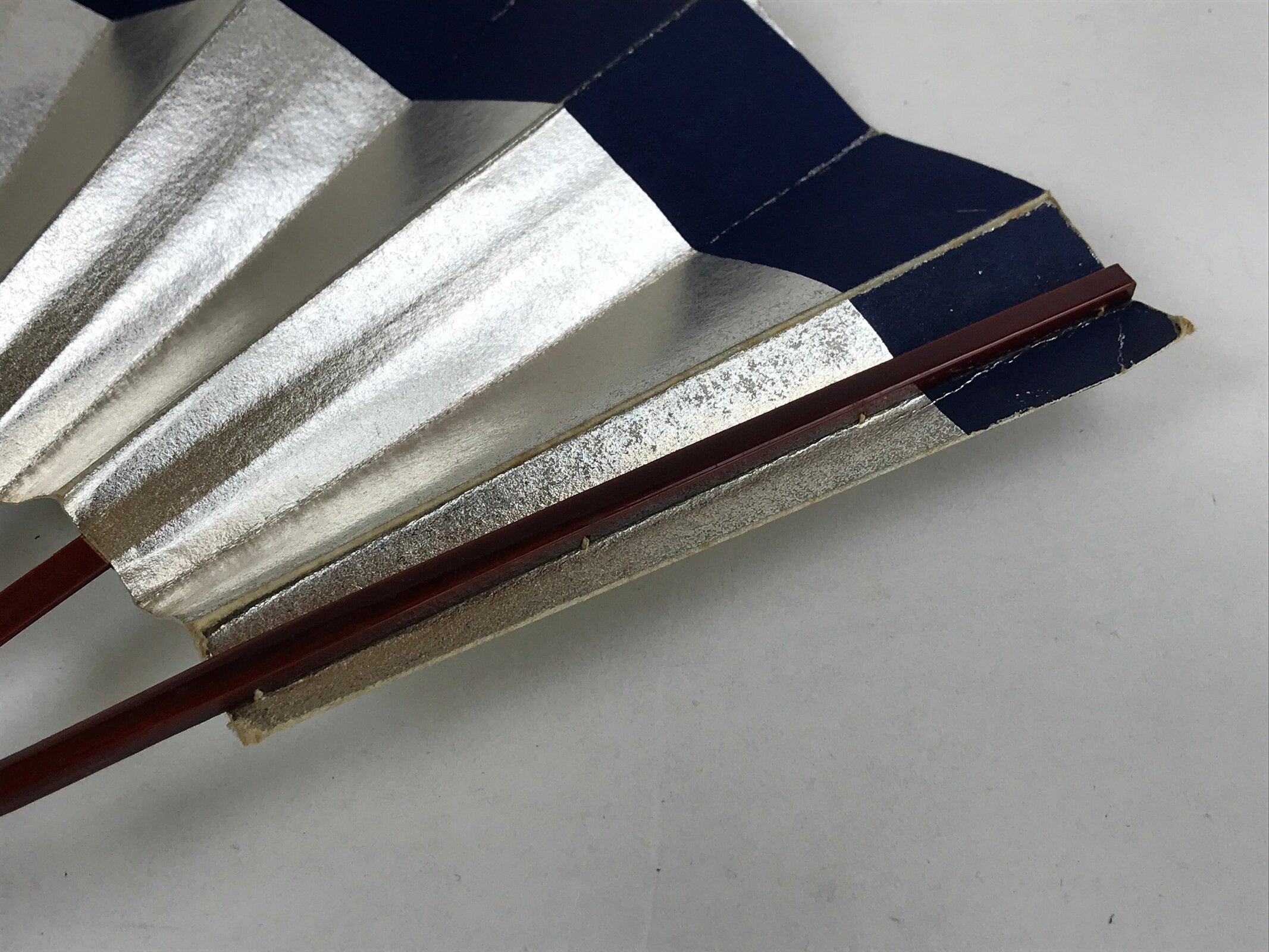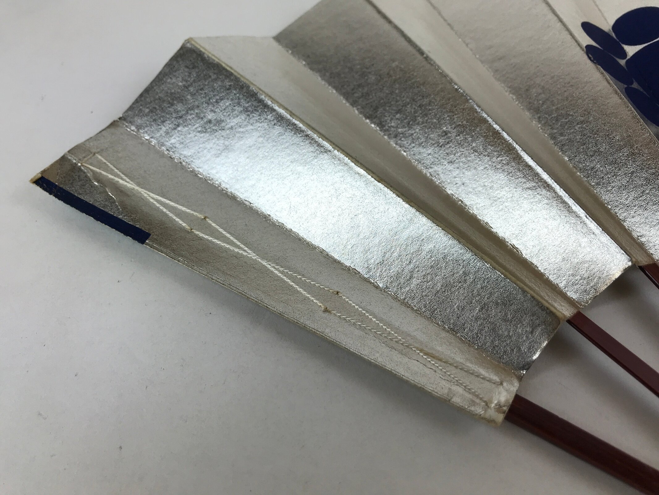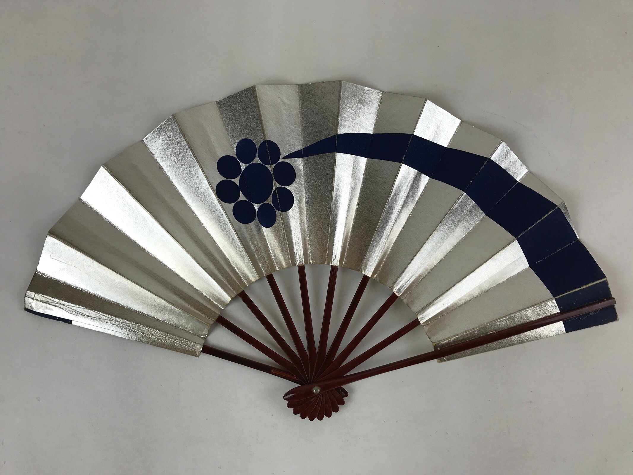 This is a traditional Japanese folding fan called sensu. You can use this when it’s hot or as decoration. It is sometimes used in traditional Japanese dance. It is metallic silver foil paper with a dark navy blue design. Both sides have a geometric floral design. The frame is lacquered in a dark brown. The paper is secured with white string.
