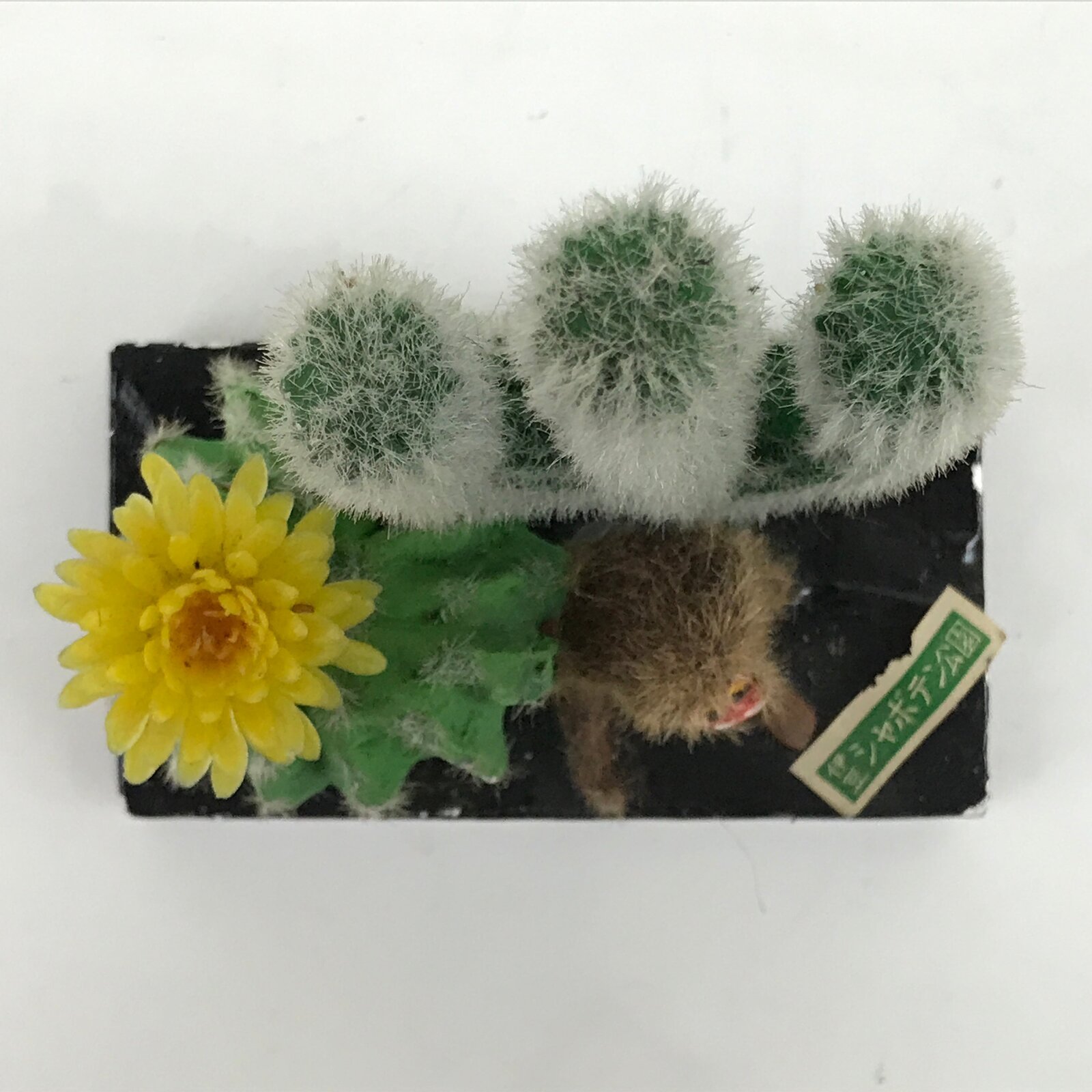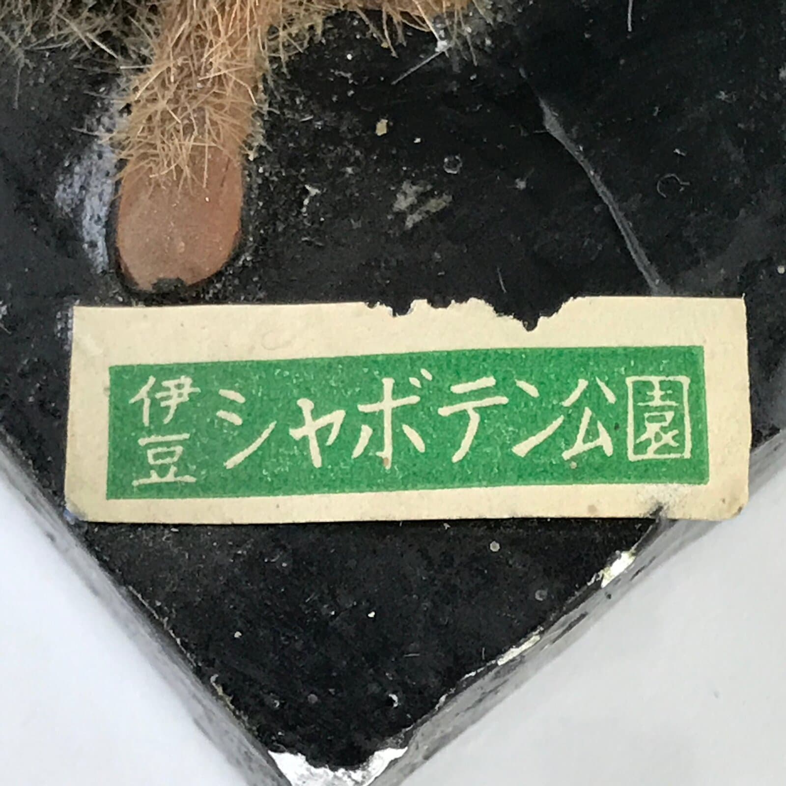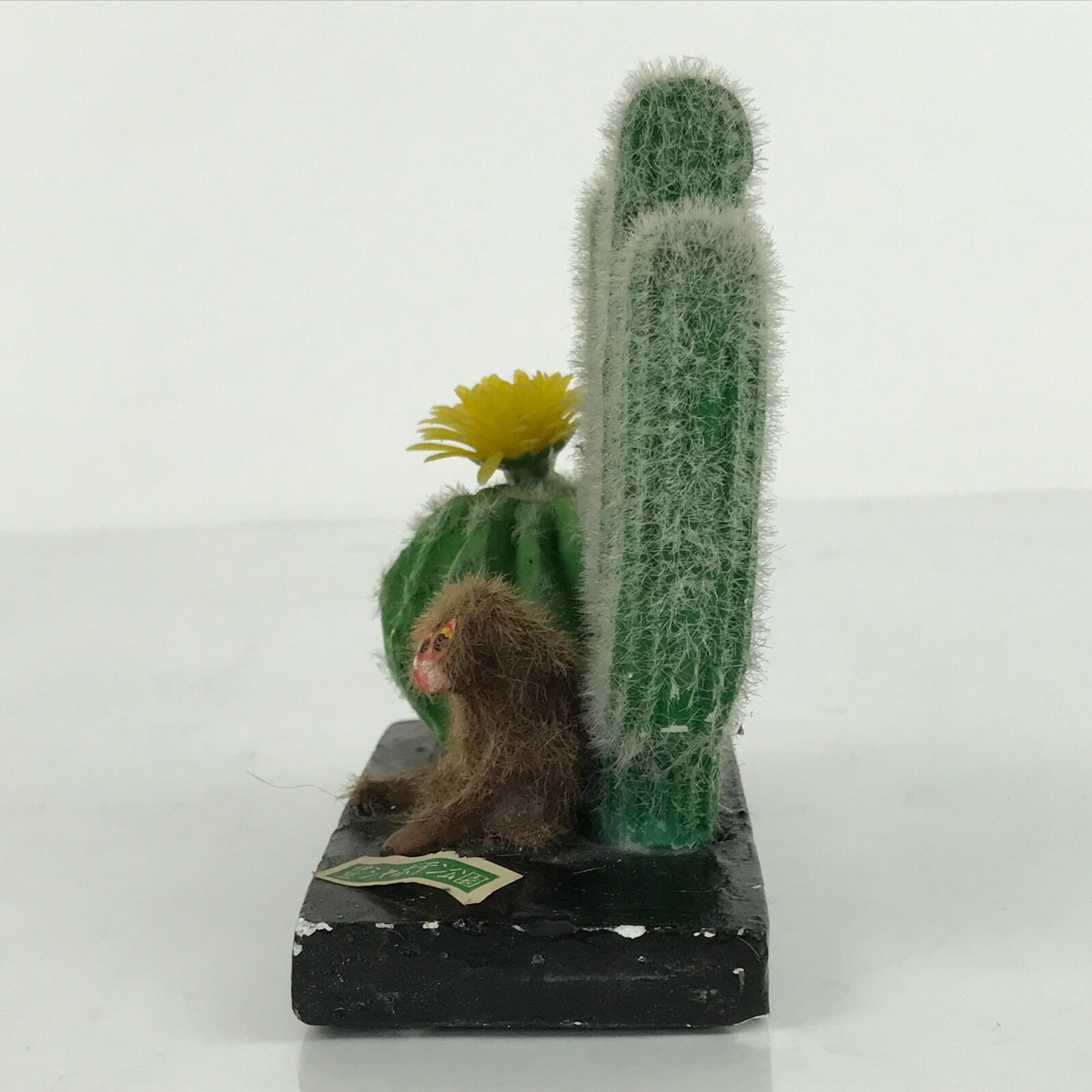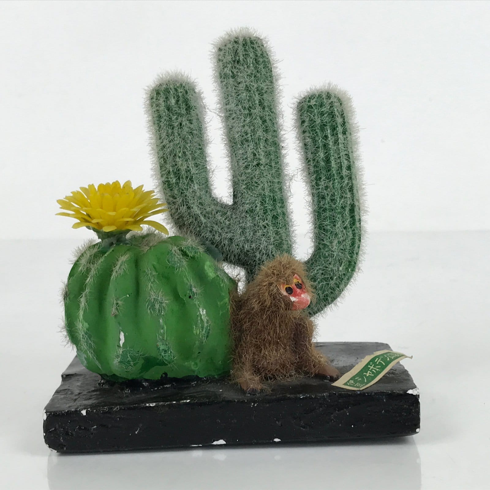 This vintage Japanese plaster figurine represents two cacti with a sitting monkey on front. There is a paper label on the black stand.
