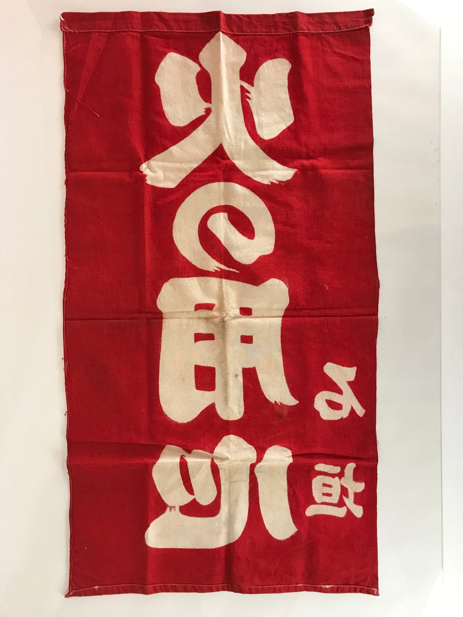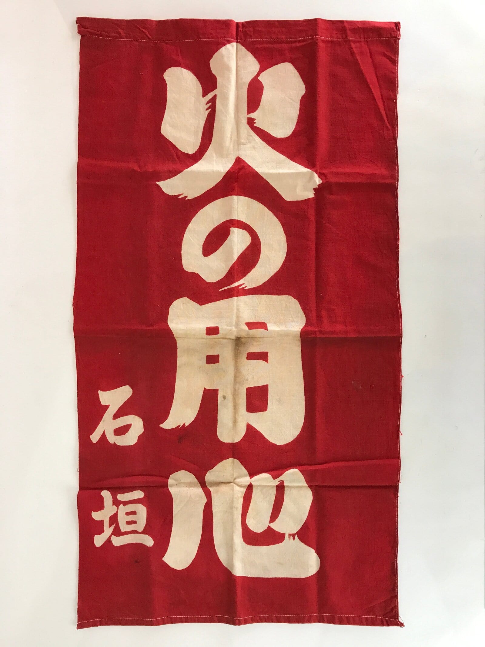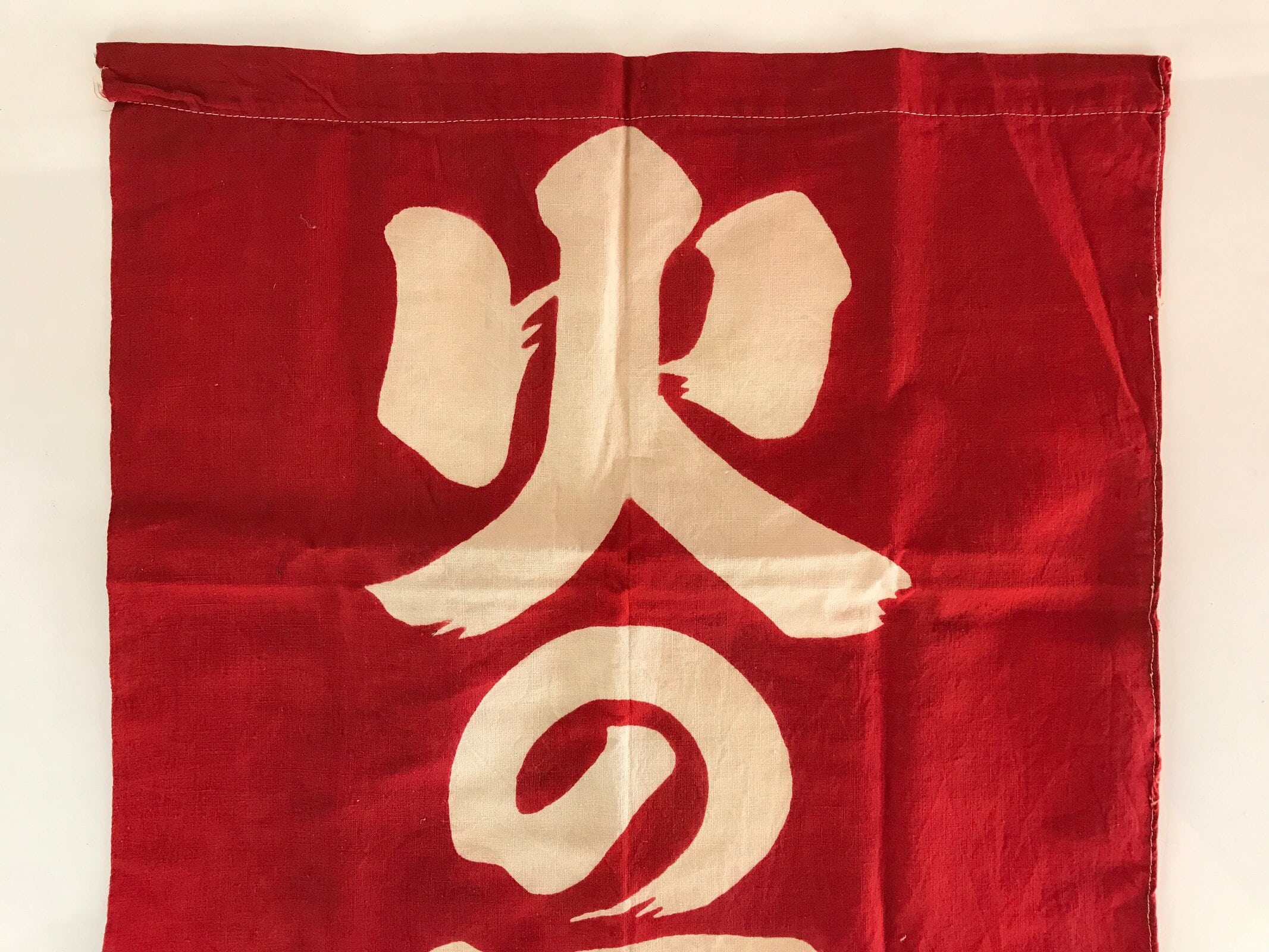 This is a Japanese vintage fire warning flag. It is written in Japanese as beware of fire (Hino-Yojin). In Japan, on winter nights, when the neighborhood association and others patrol the area. They walk and clap their clappers (Hyoshigi) while shouting, “Beware of fire.”