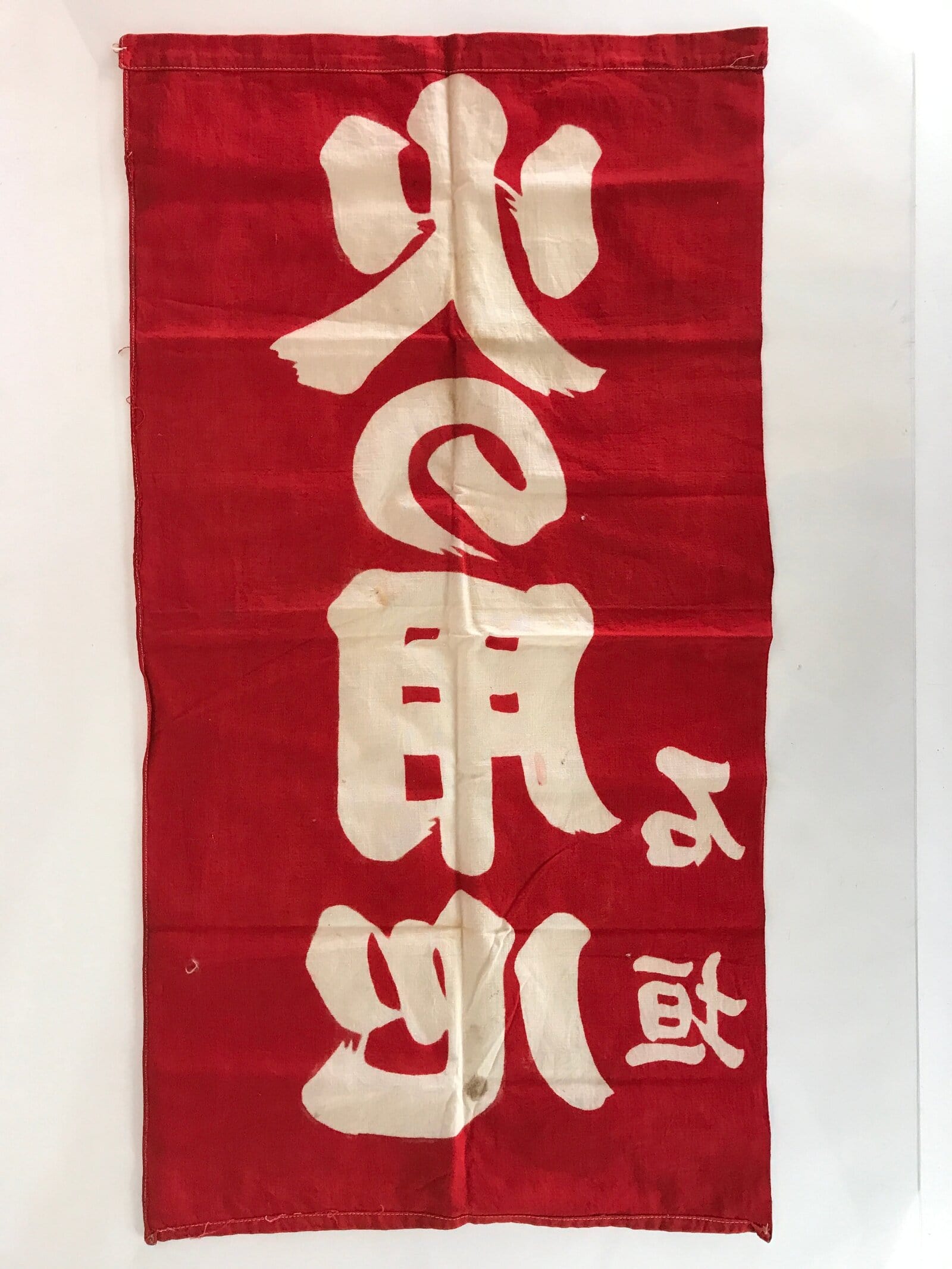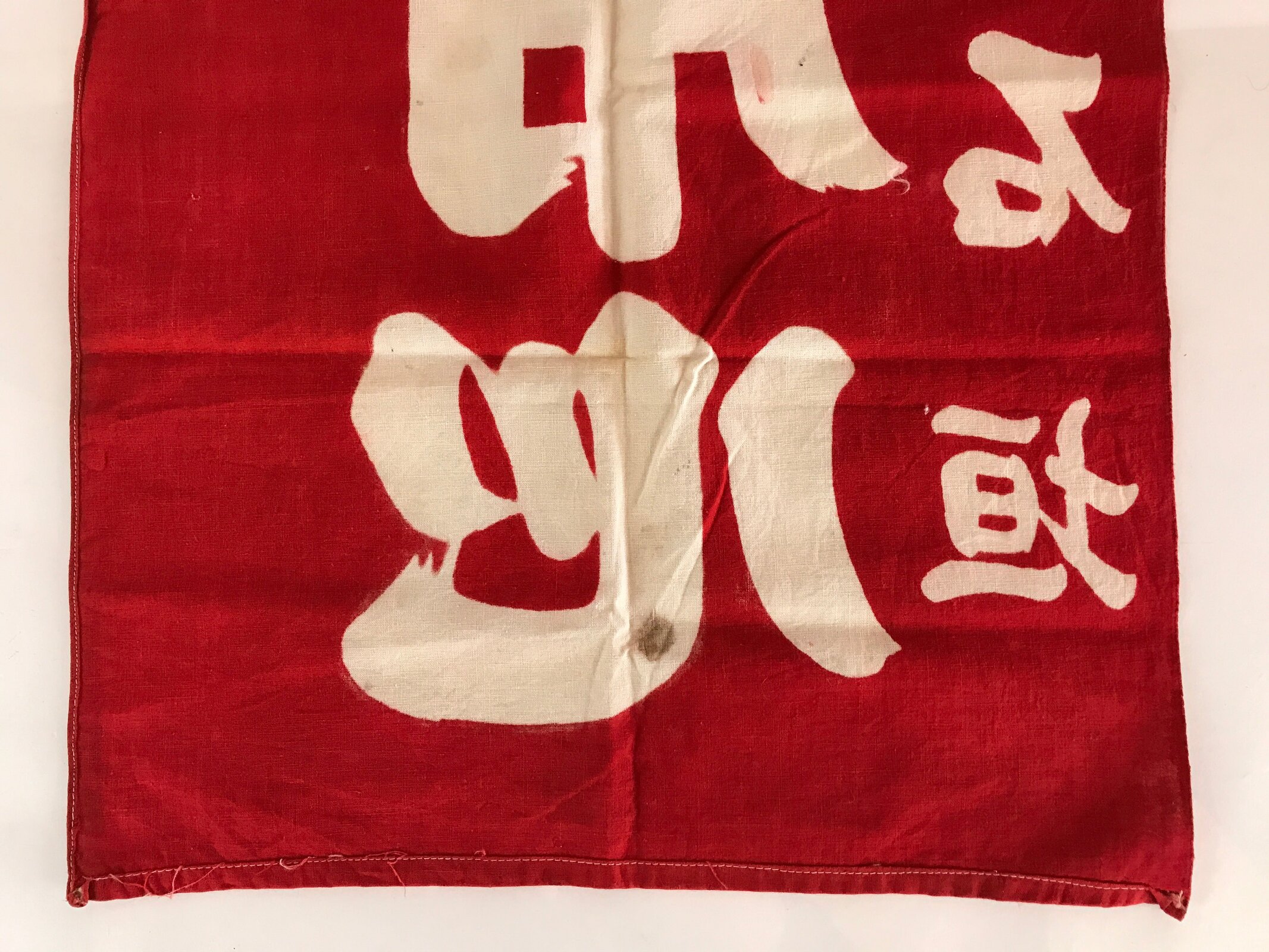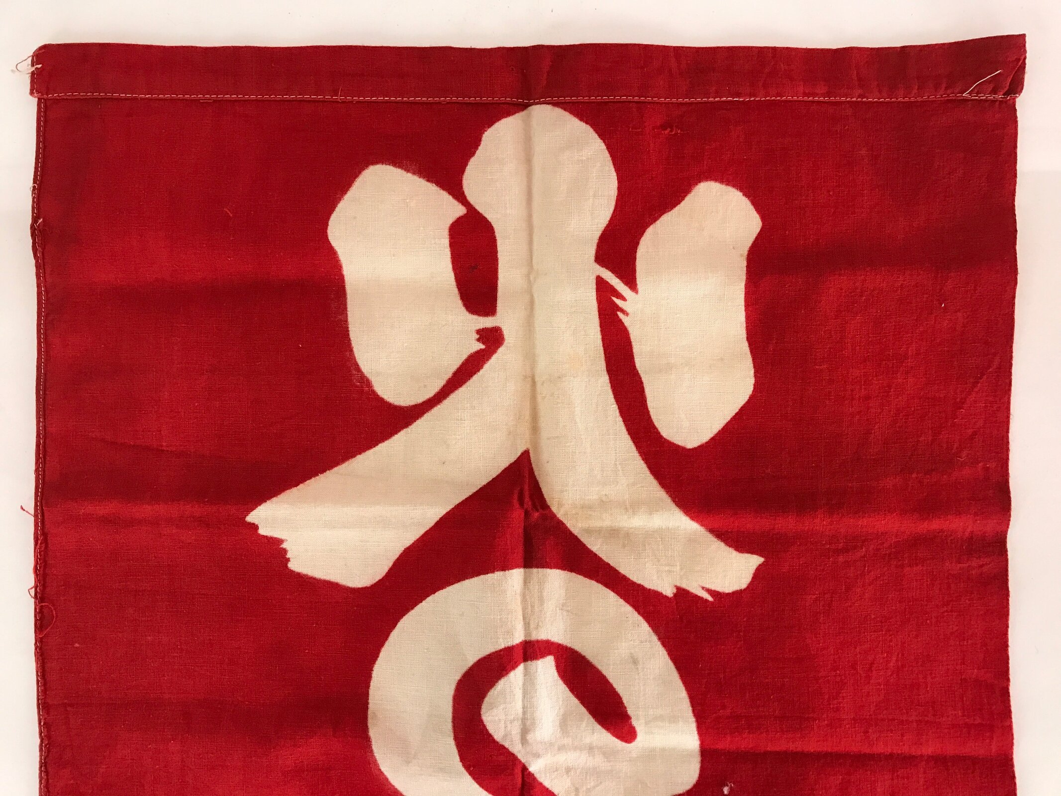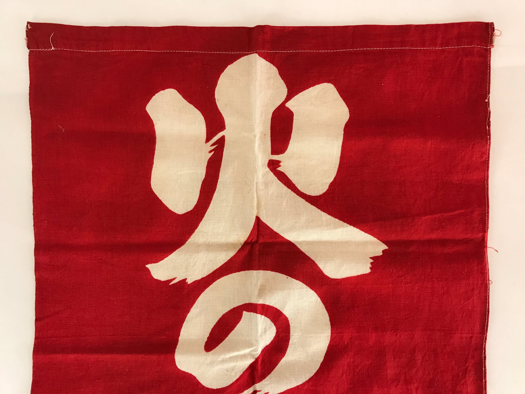 This is a Japanese vintage fire warning flag. It is written in Japanese as beware of fire (Hino-Yojin). In Japan, on winter nights, when the neighborhood association and others patrol the area. They walk and clap their clappers (Hyoshigi) while shouting, “Beware of fire.”