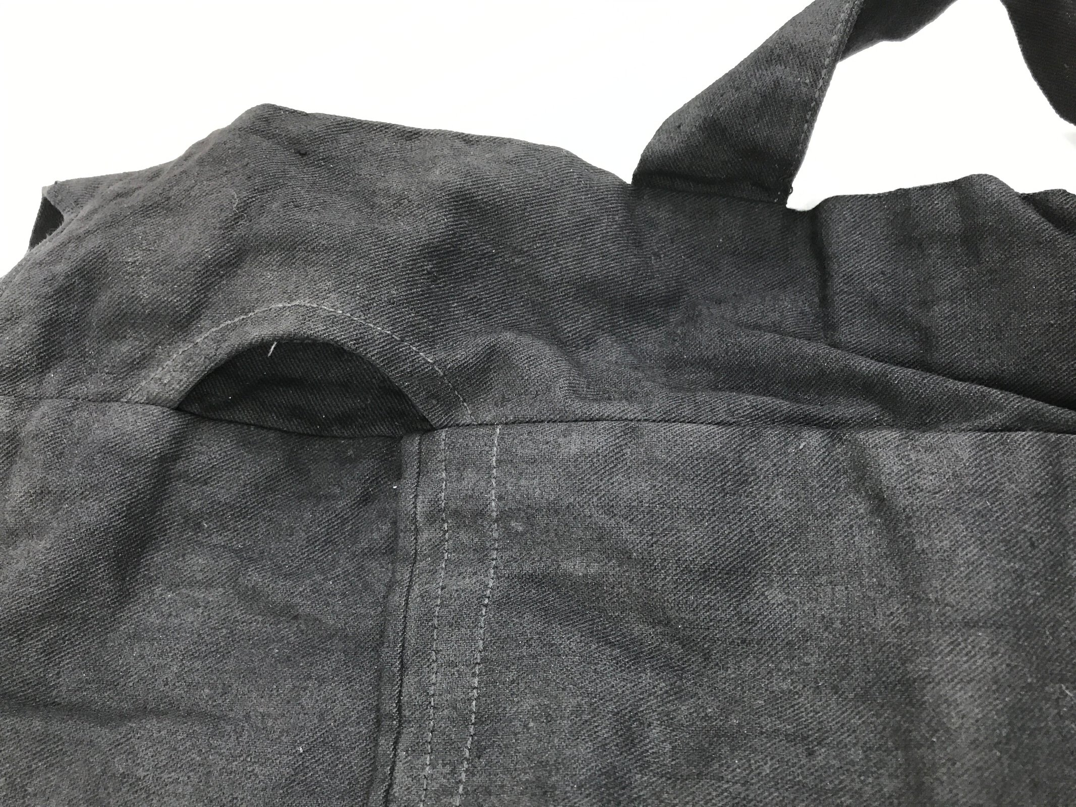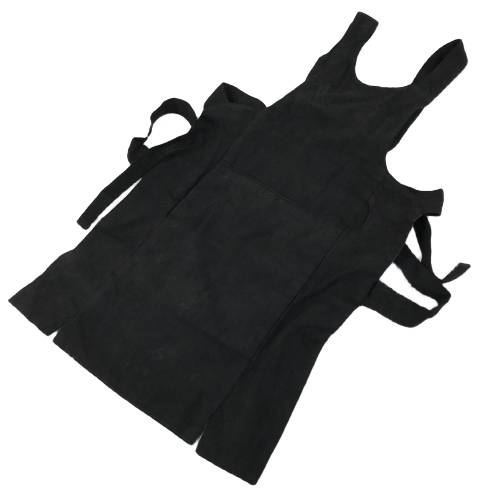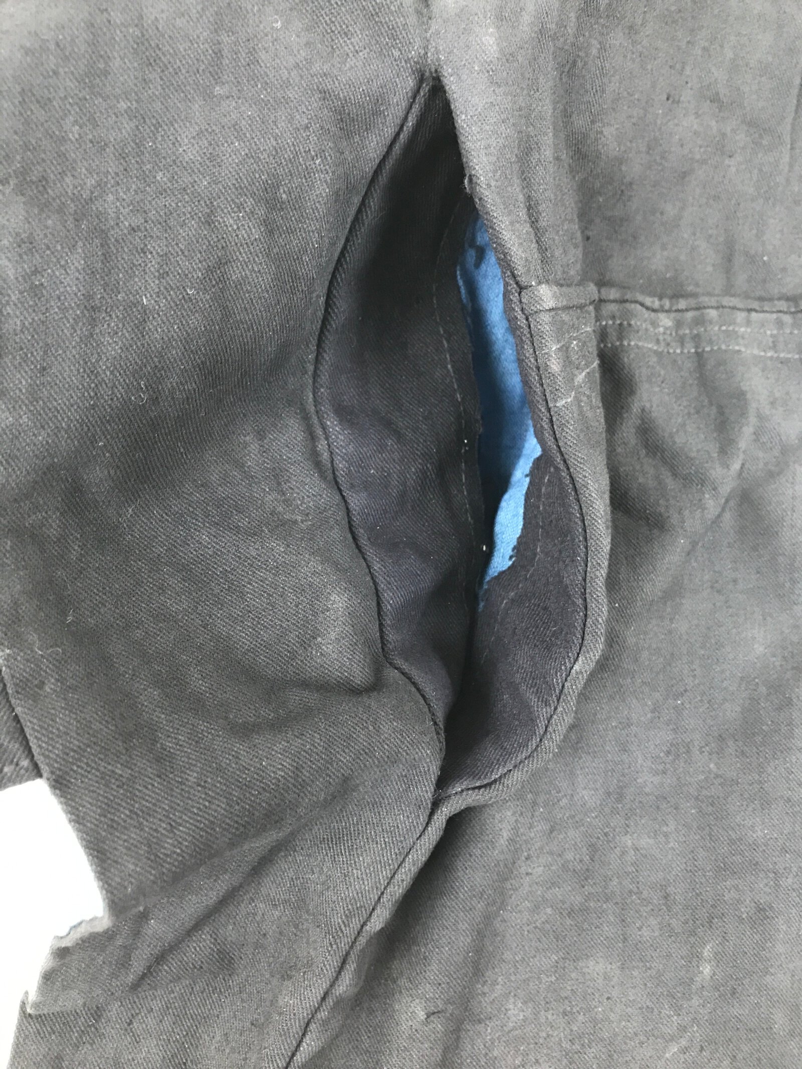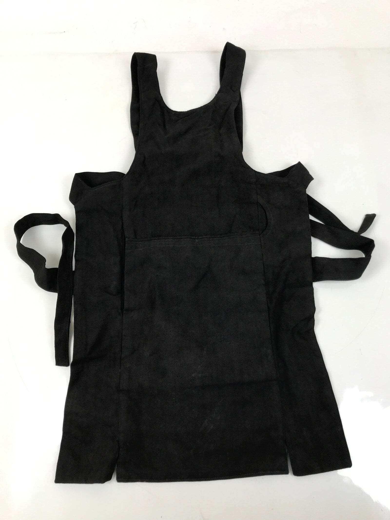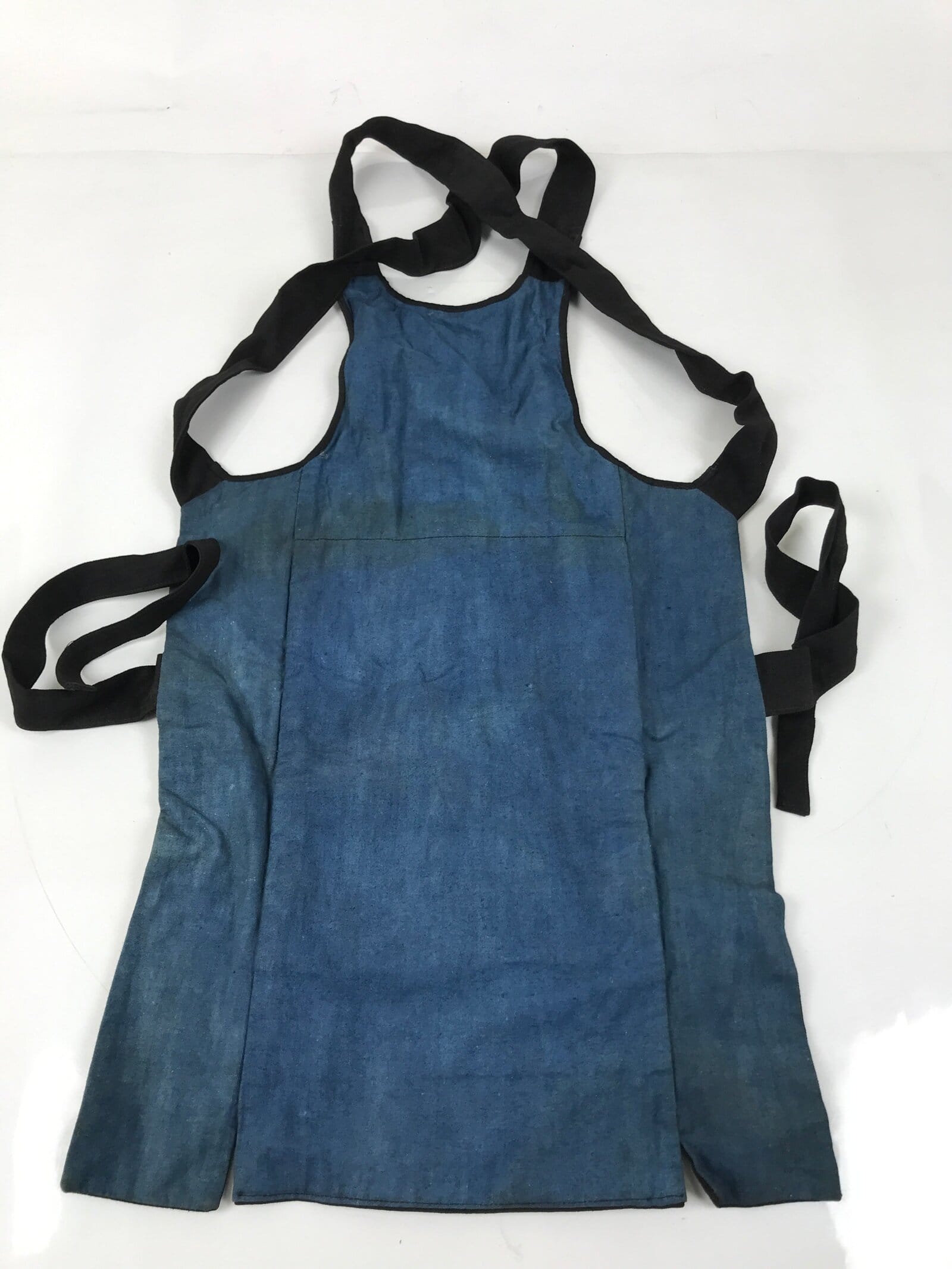 This is a vintage Japanese fireman’s uniform apron, also called haragake. It is made of heavy black and blue cotton fabric with three pockets for tools. It fits small, close to the body, and over the head. Then it fastens with ties around the back of the waist. The top piece is narrower than standard aprons as to allow for better movement of the chest and arms.