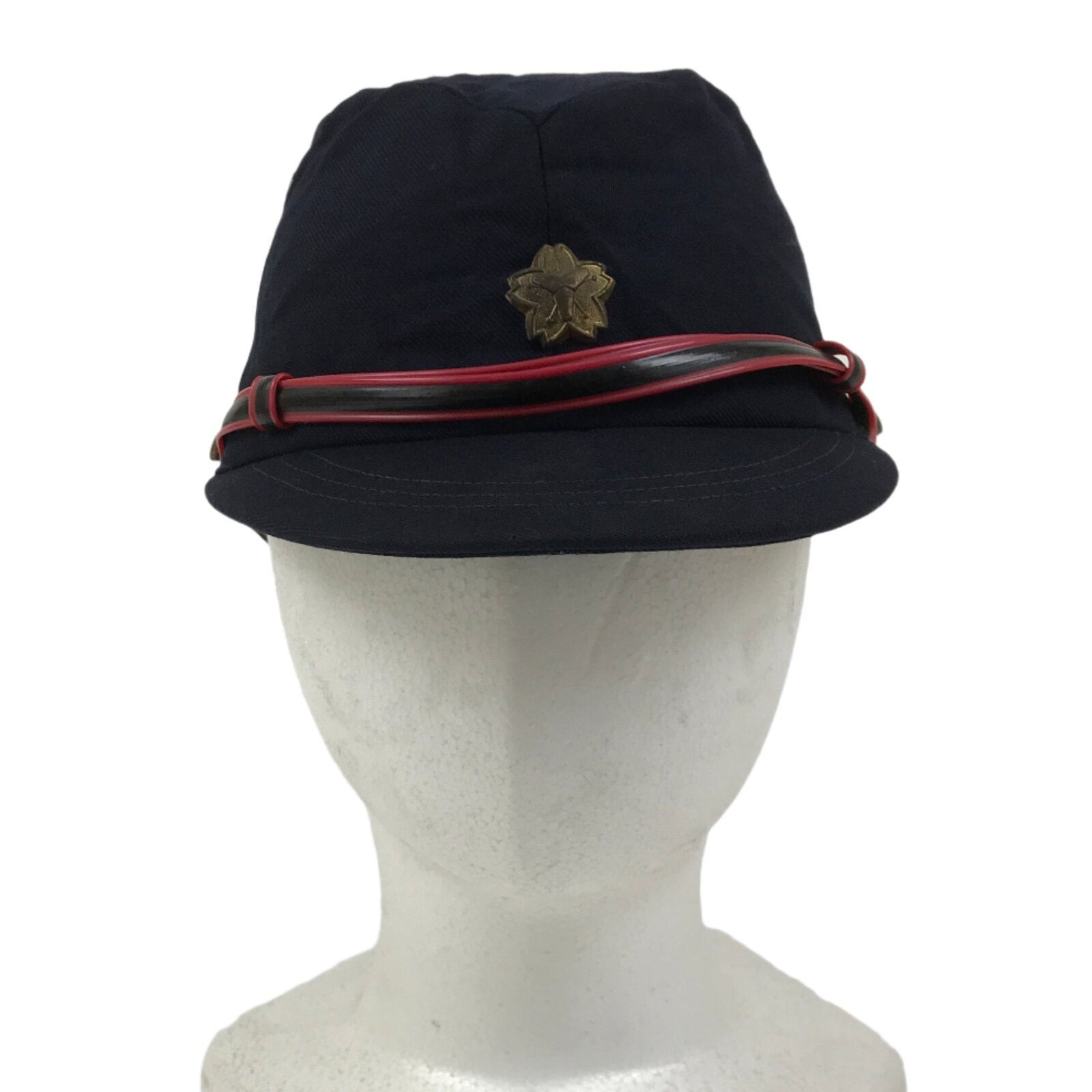 This is a vintage Japanese fireman’s regular uniform hat. It is made of a navy blue fabric with metal rings at the top for ventilation. It is decorated with a red and black vinyl band across the front, indicating the hat’s owner would have been a deputy division chief or division chief. There are two metal buttons on either side with a cherry blossom at the center as well as a large metal cherry blossom pin front and center.