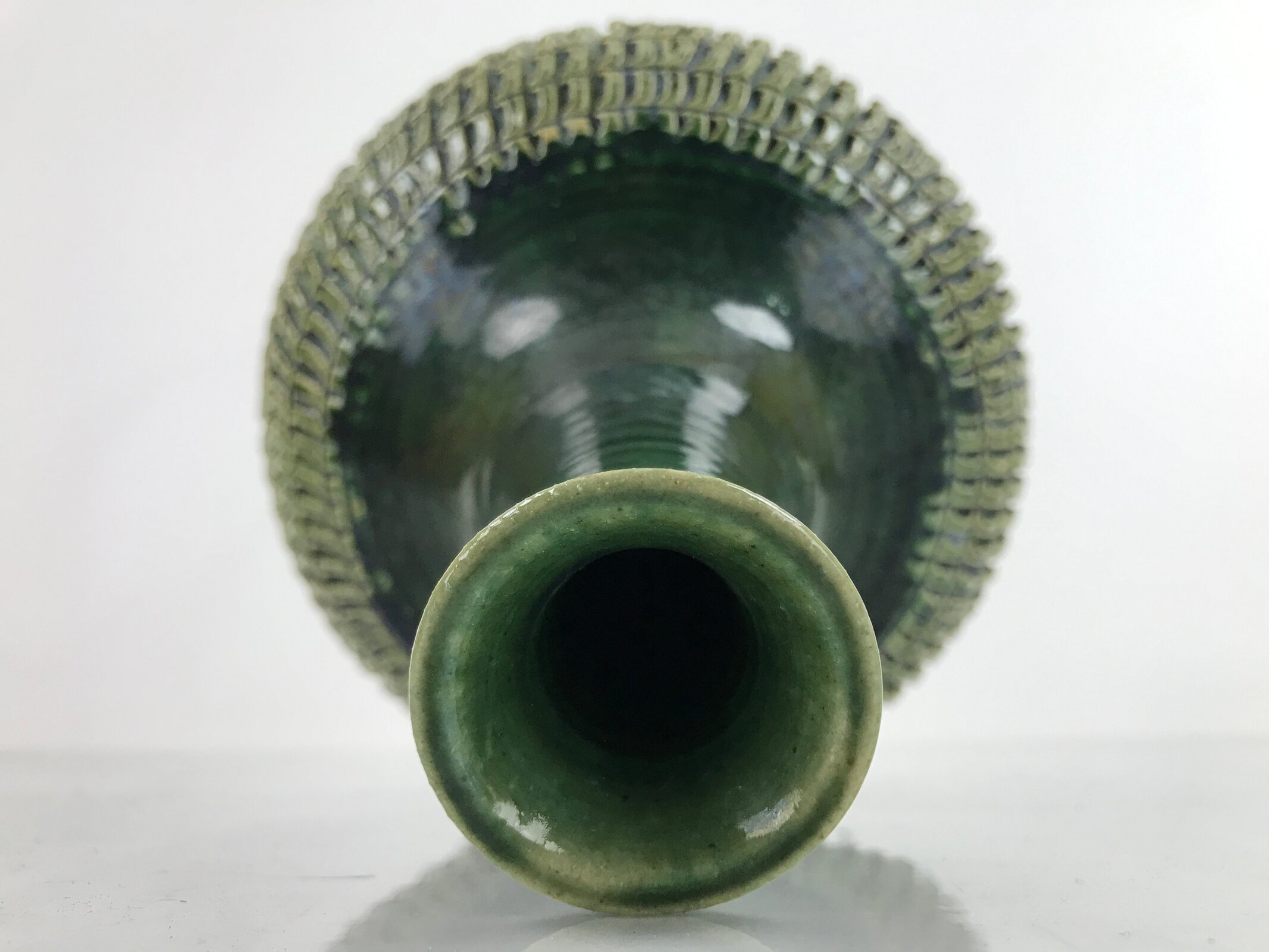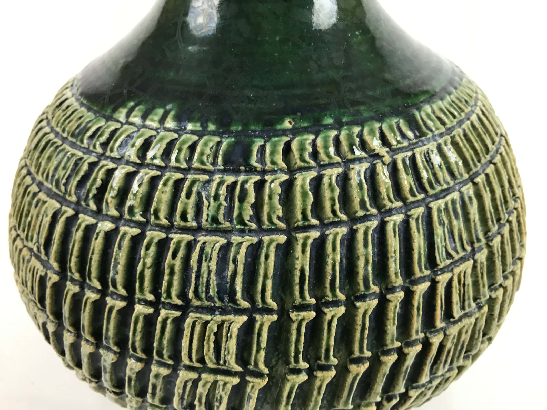 This Japanese vintage pottery flower vase or kabin is an Oribe vase with a green glaze and a beautiful engraved pattern. It is round and has a tall neck. This vase is signed on the bottom. It is sold in a wooden box, perfect for storage when not on display. This vase can be used for Ikebana flower arrangement. It is an elegant piece, suitable for any season and ideal for any home or office.