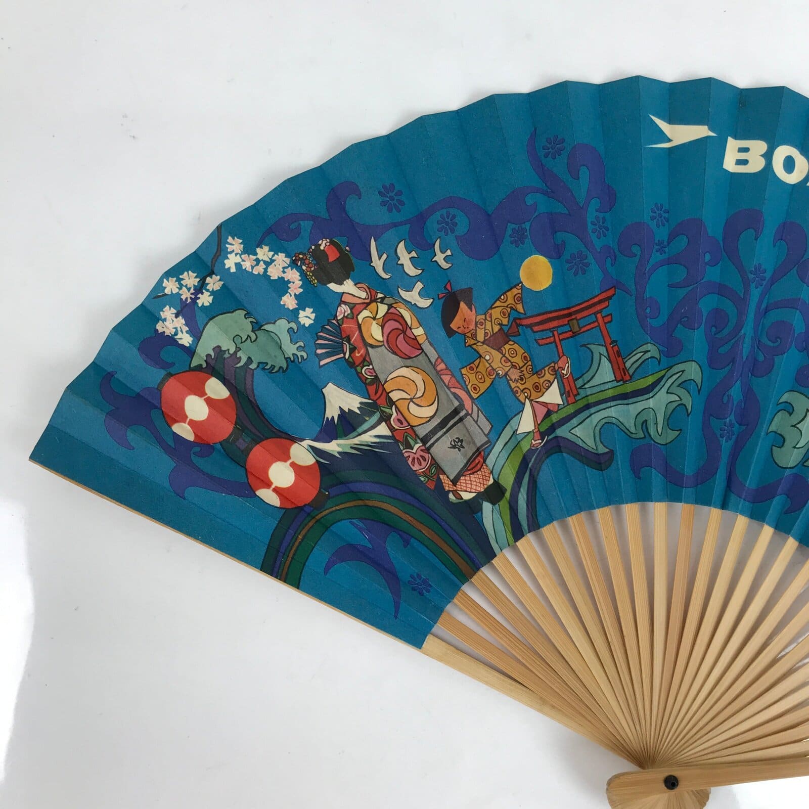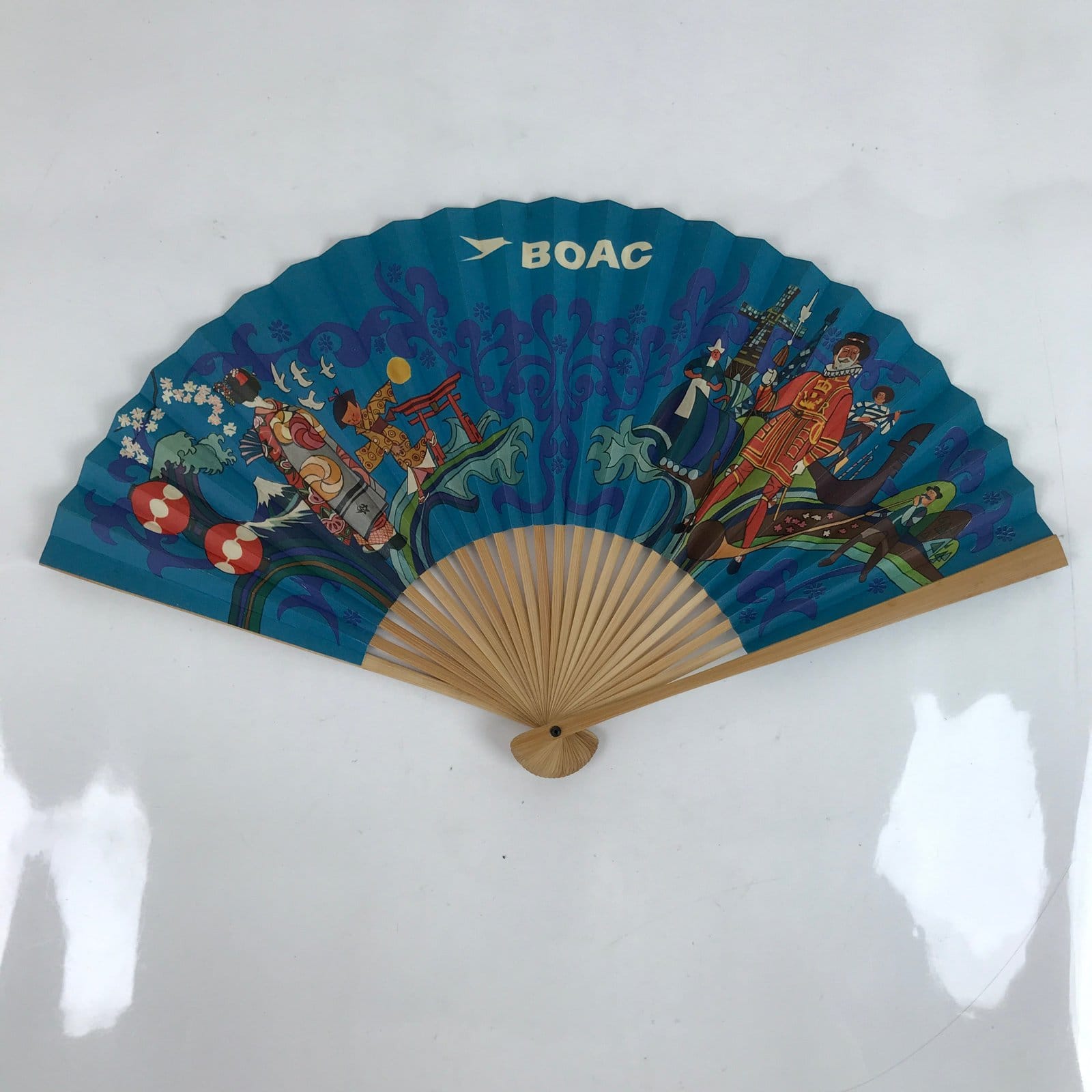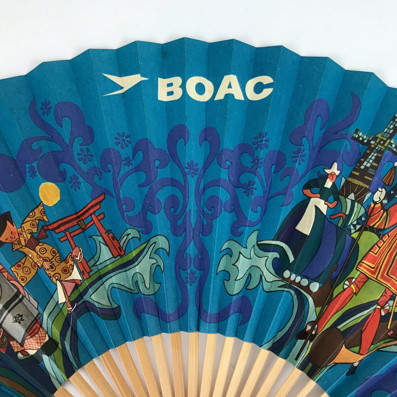 This is a traditional Japanese folding fan called sensu. You can use this when it’s hot or as decoration. This fan is made of a natural bamboo frame and is a bright blue with both Japanese style and European style stylized imagery in bold colors. This is a promotional item from BOAC Airlines (flying world-wide from 1940-1974). The back side is blank.