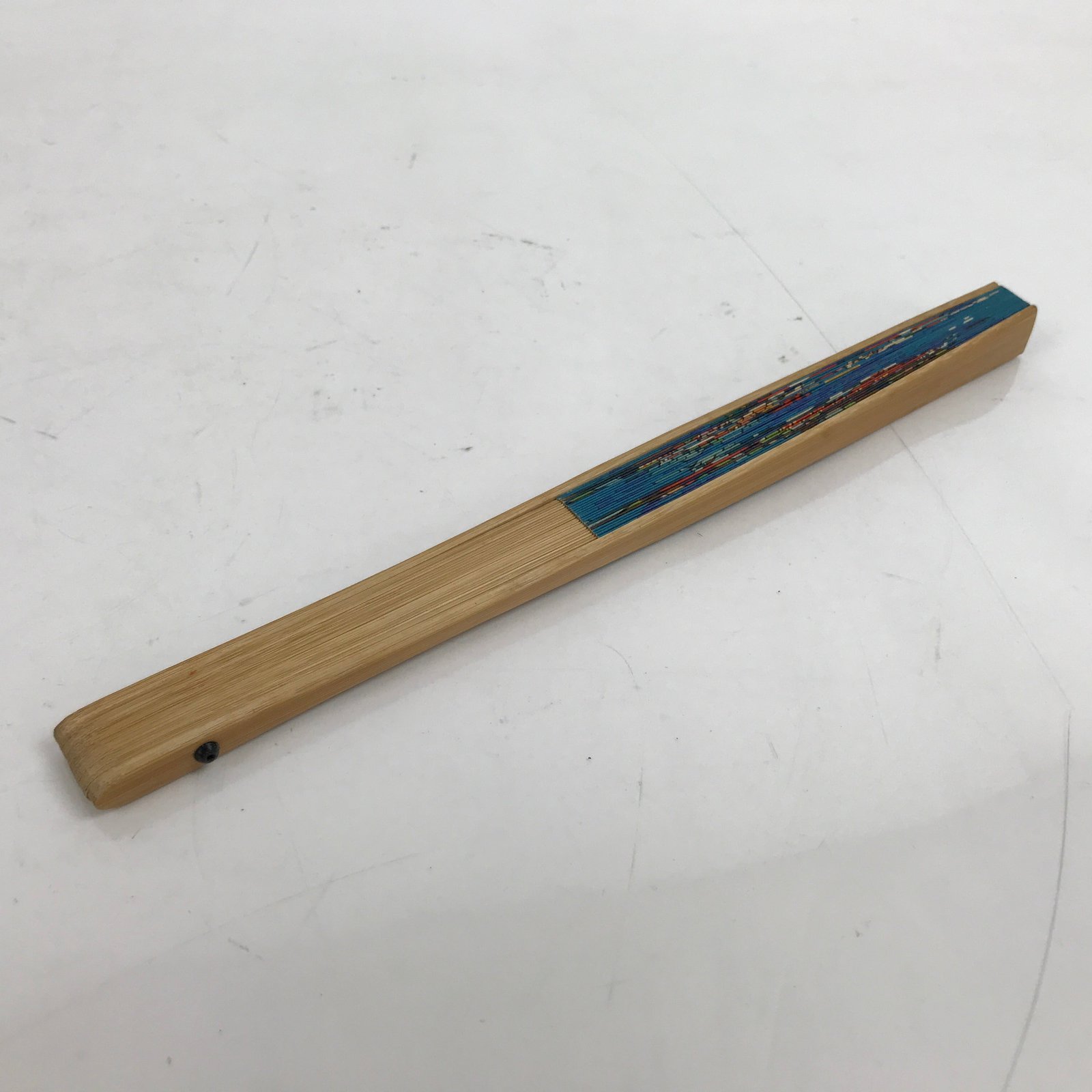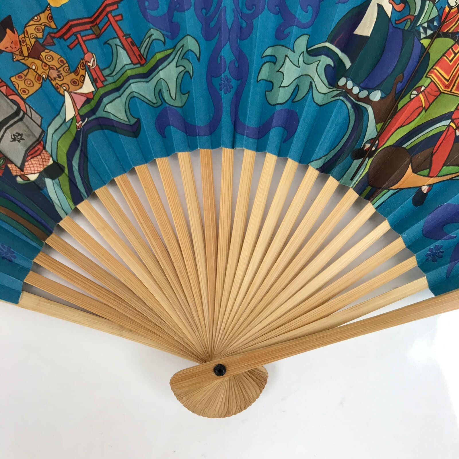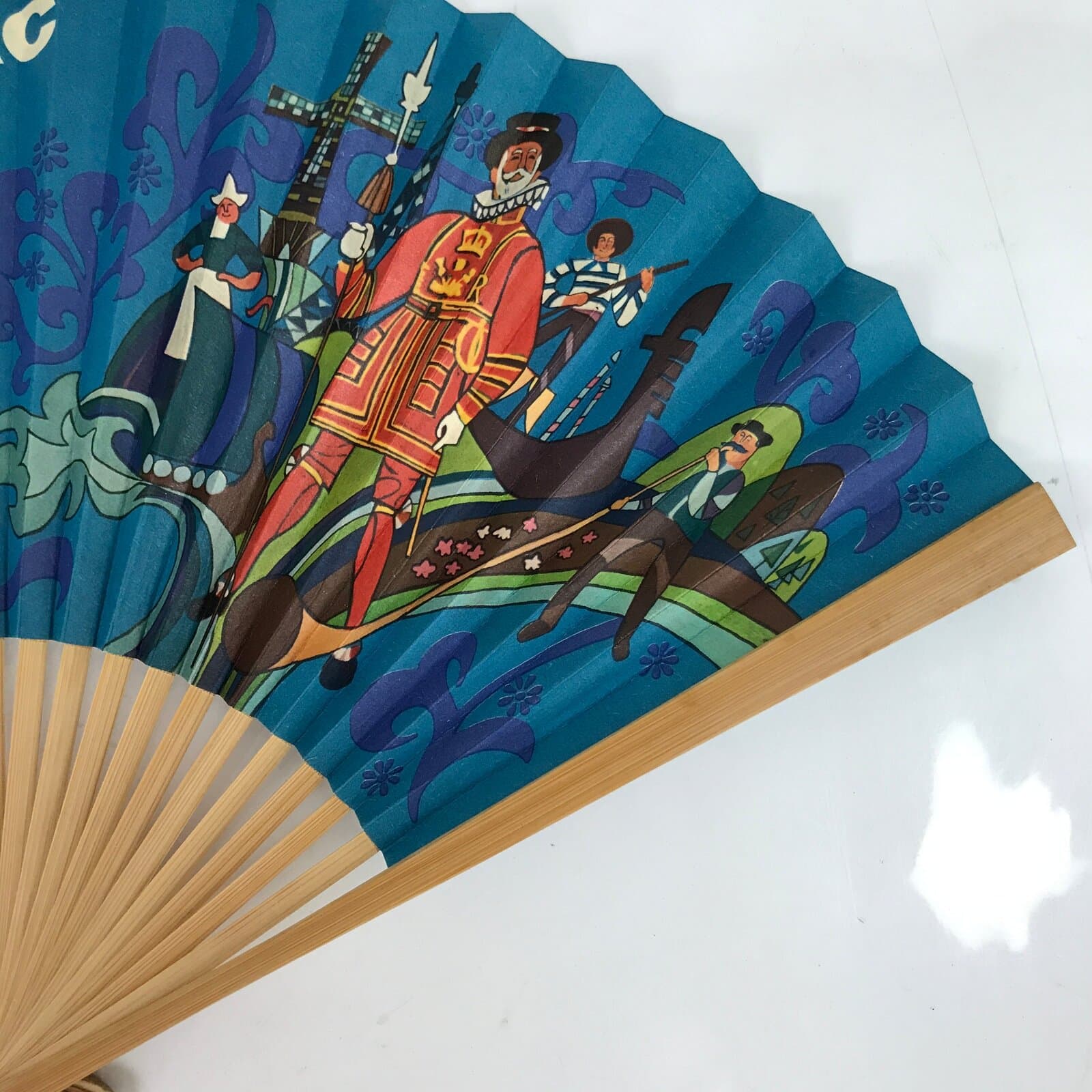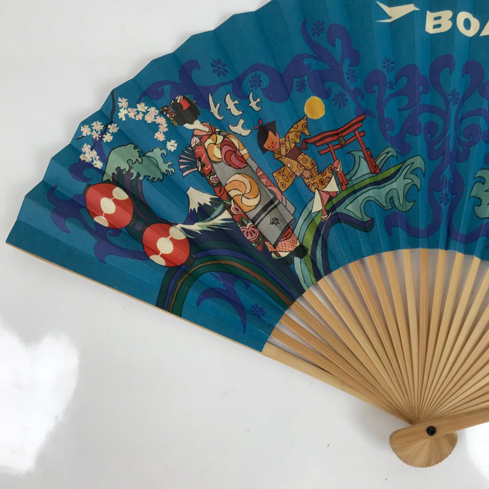This is a traditional Japanese folding fan called sensu. You can use this when it’s hot or as decoration. This fan is made of a natural bamboo frame and is a bright blue with both Japanese style and European style stylized imagery in bold colors. This is a promotional item from BOAC Airlines (flying world-wide from 1940-1974). The back side is blank.