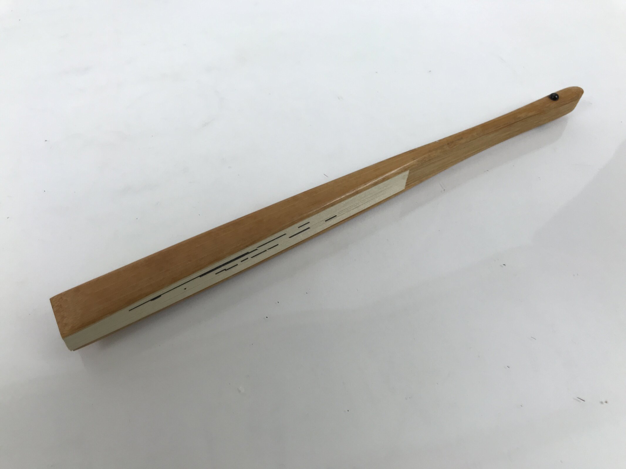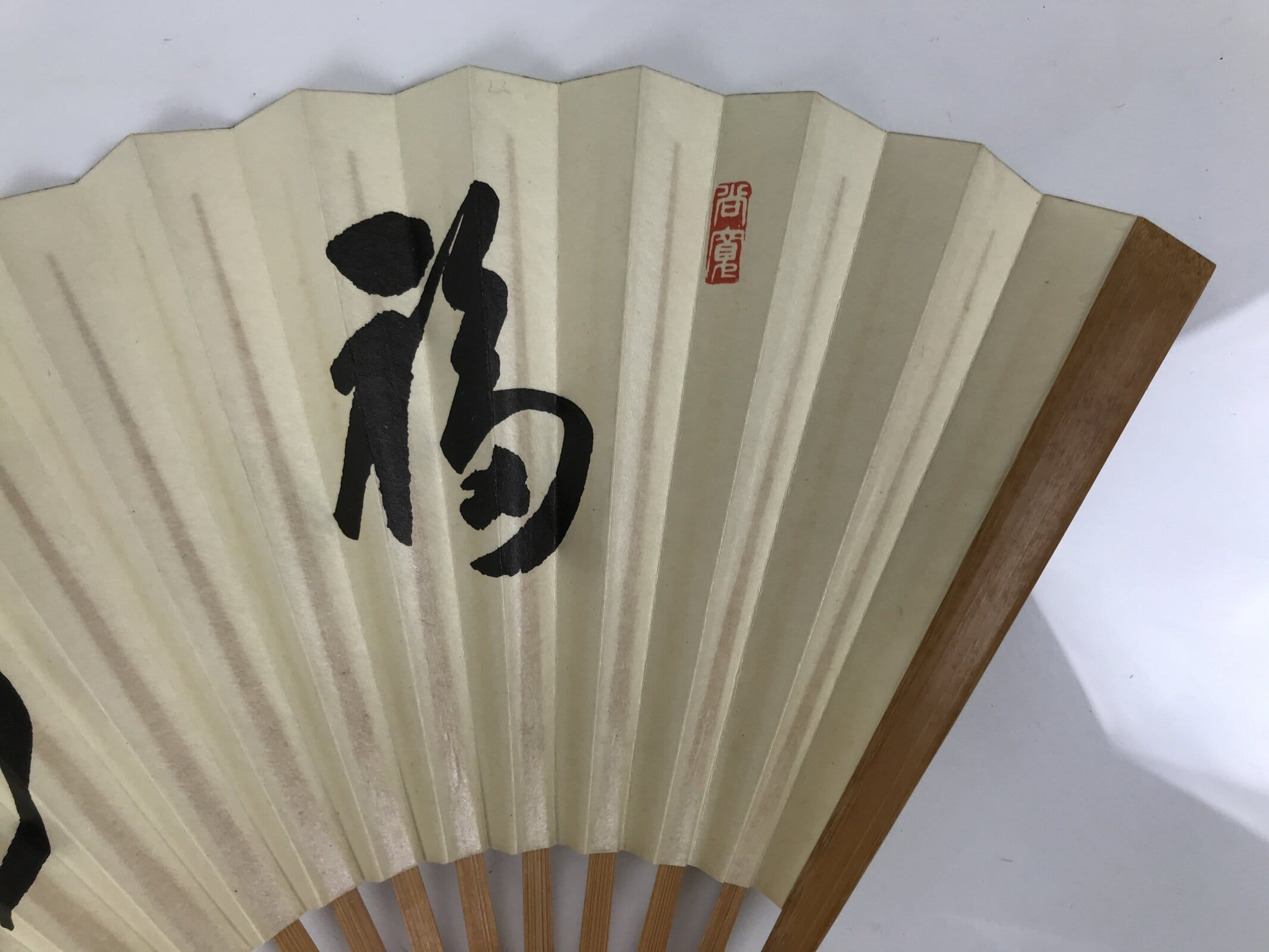 This is a traditional Japanese folding fan called sensu. You can use this when it’s hot or as decoration. This decorative fan features black calligraphy with 2 big kanji characters meaning happiness and long life. On the back, there is an abstract wave pattern. The inner frame is natural bamboo.