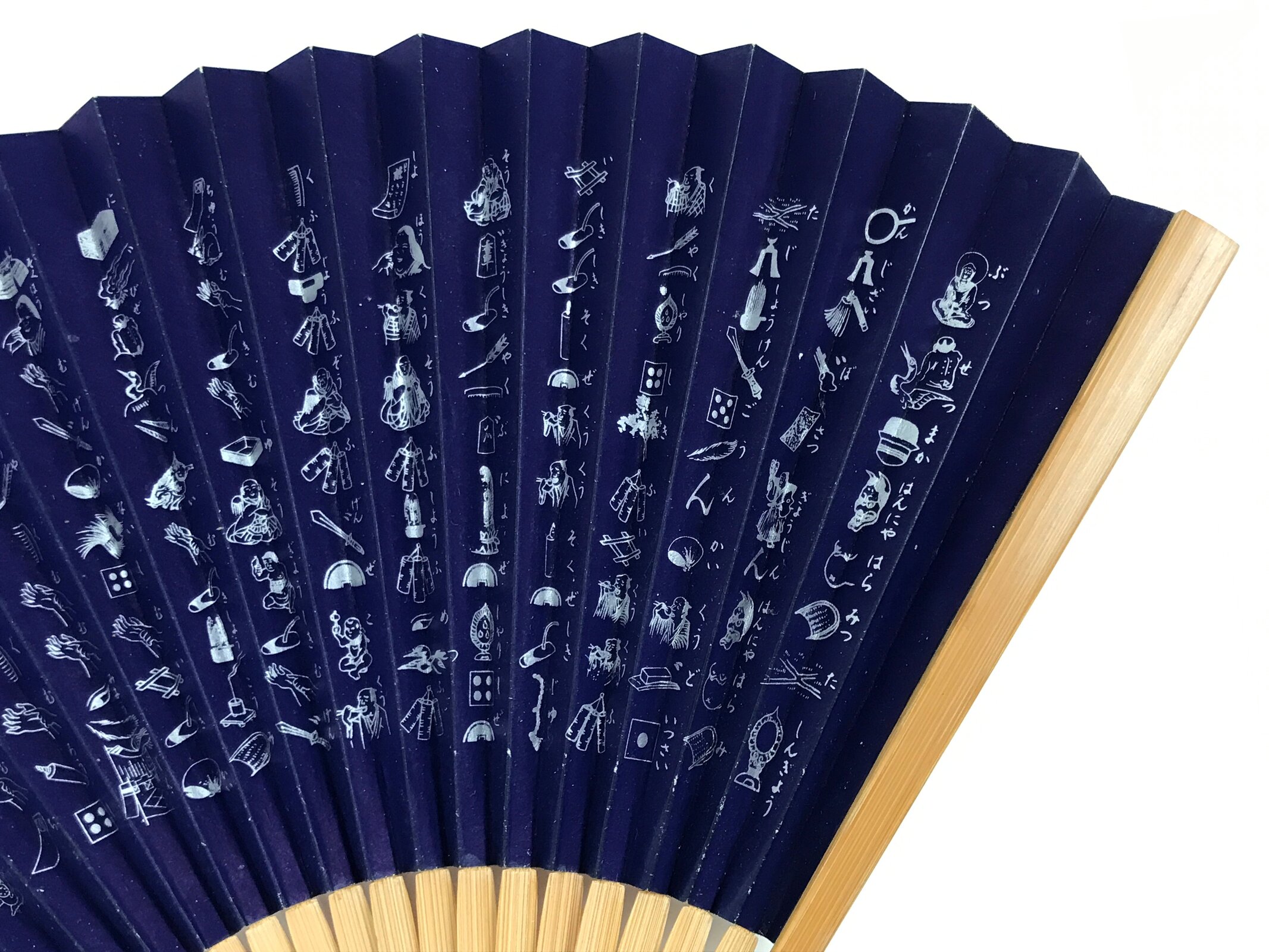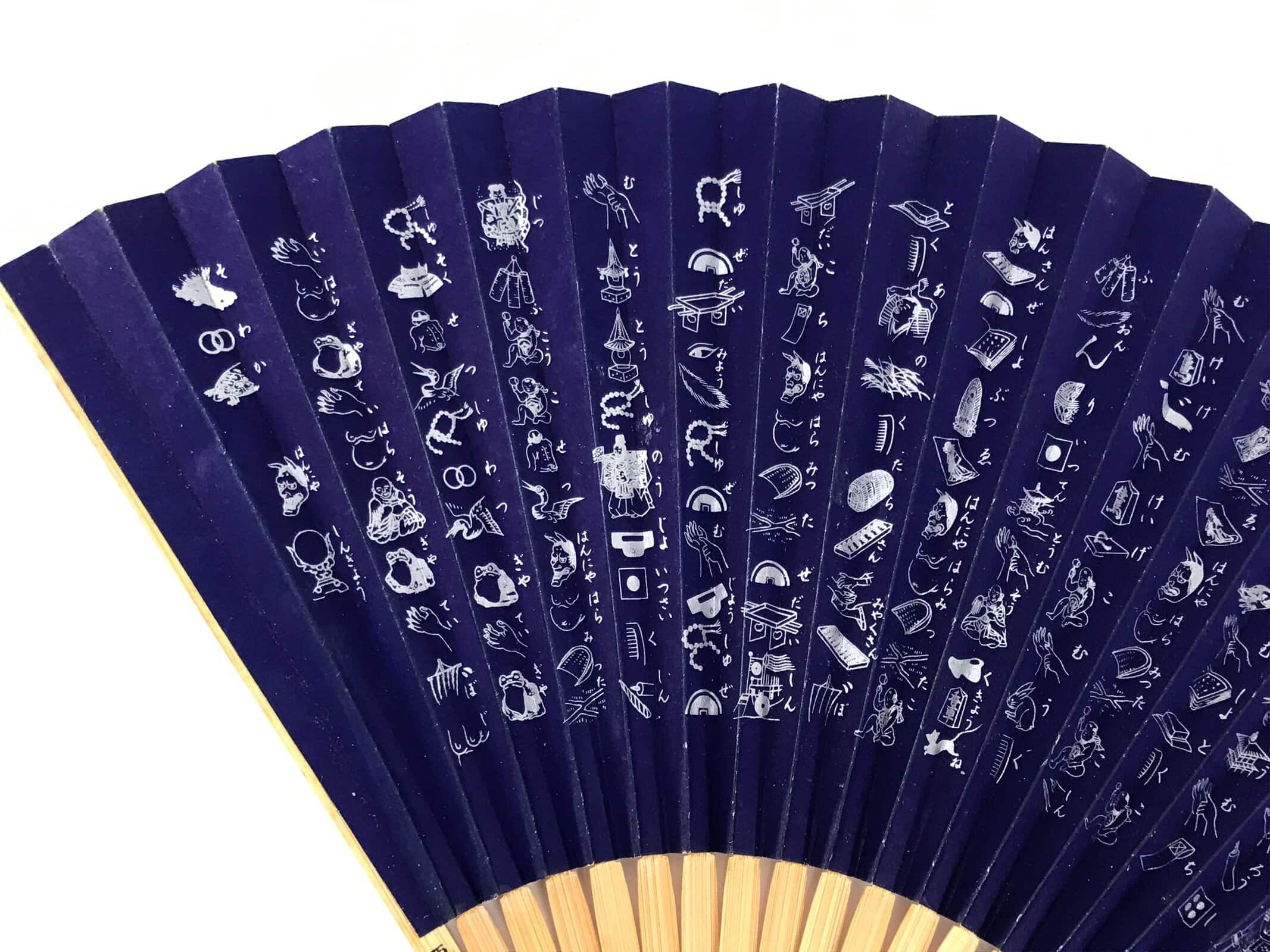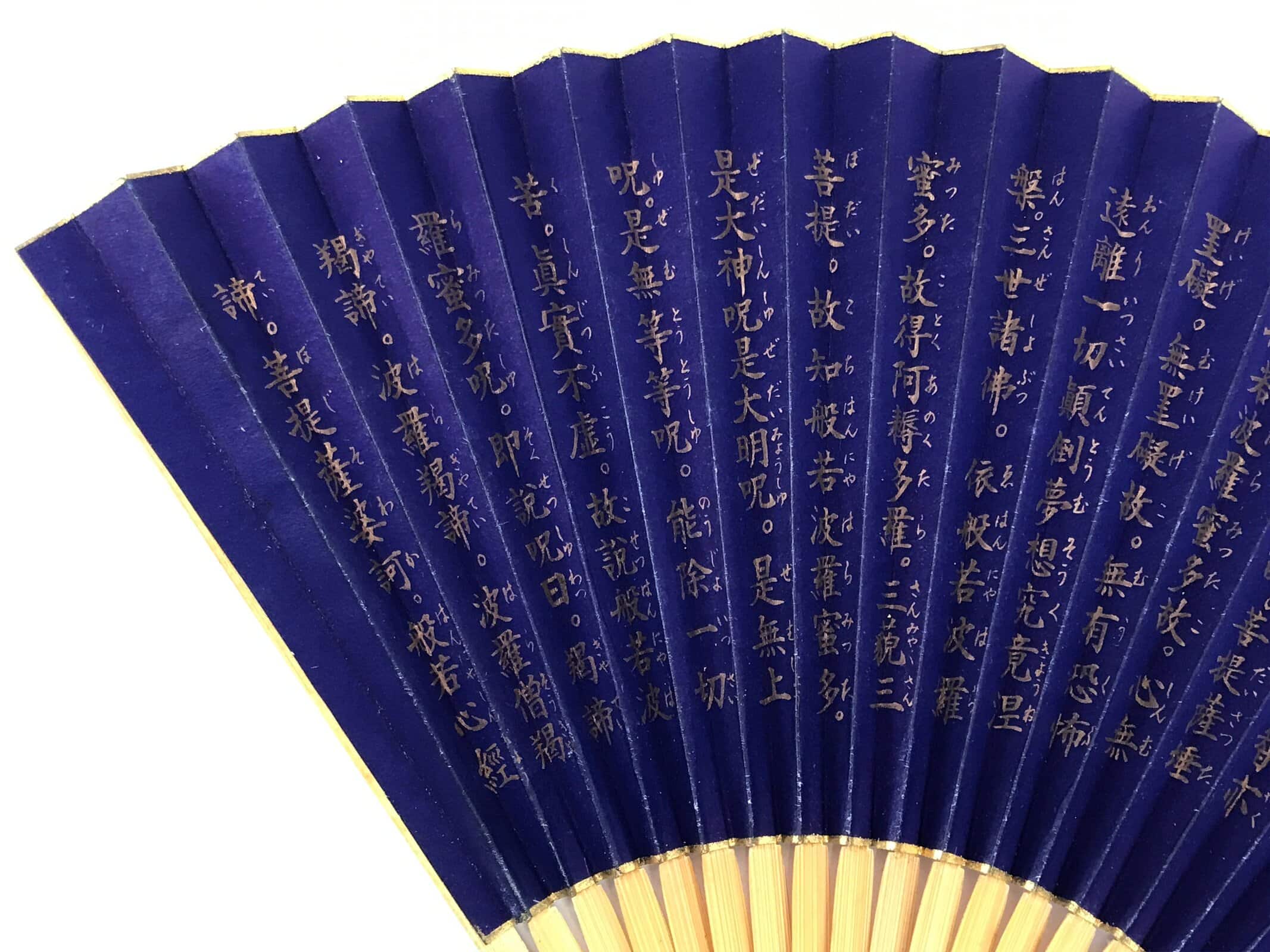 This is a traditional Japanese folding fan called sensu. You can use this when it’s hot or as decoration. This fan is a dark blue on both sides. On one side it has gold kanji characters with furigana for reading and depicts the Heart Sutra, a very popular sutra from Mahayana Buddhism. On the other is small pictograms that help pronunciation and memorization. The frame is natural bamboo.