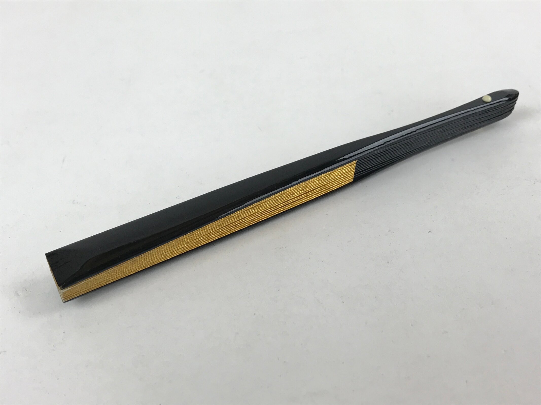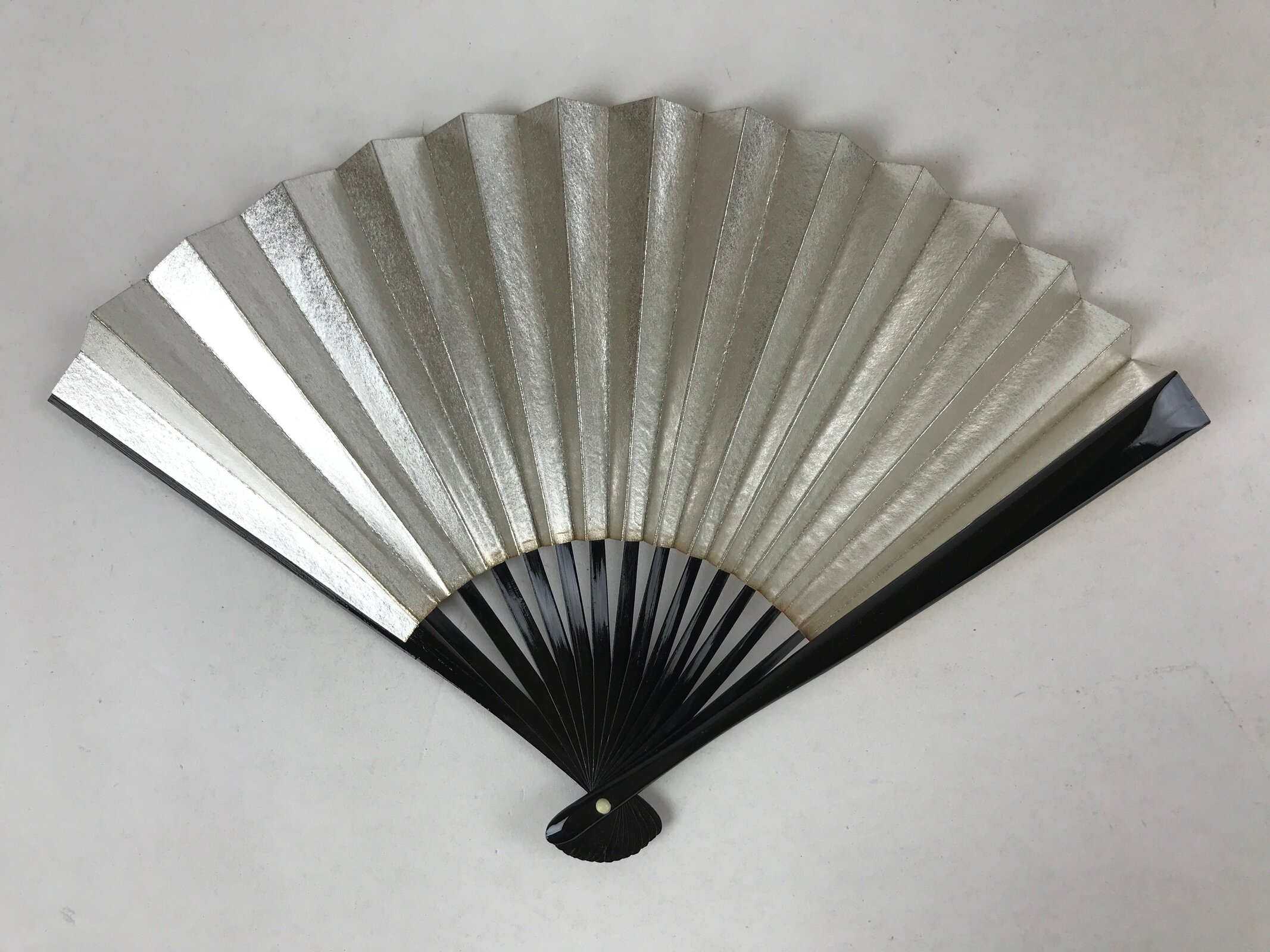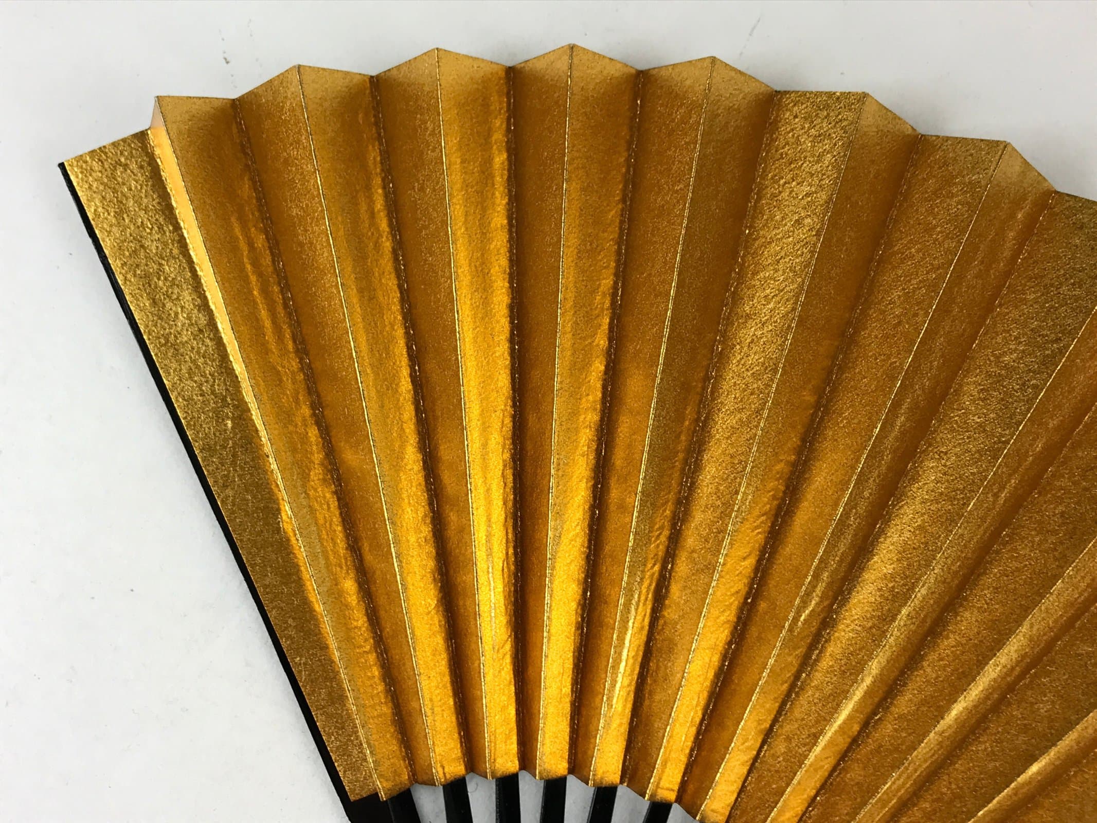 This is a traditional Japanese folding fan called sensu. You can use this when it’s hot or as decoration. This small decorative fan is a simple metallic gold with no designs. The back is silver. The frame is natural bamboo and coated with black lacquer.