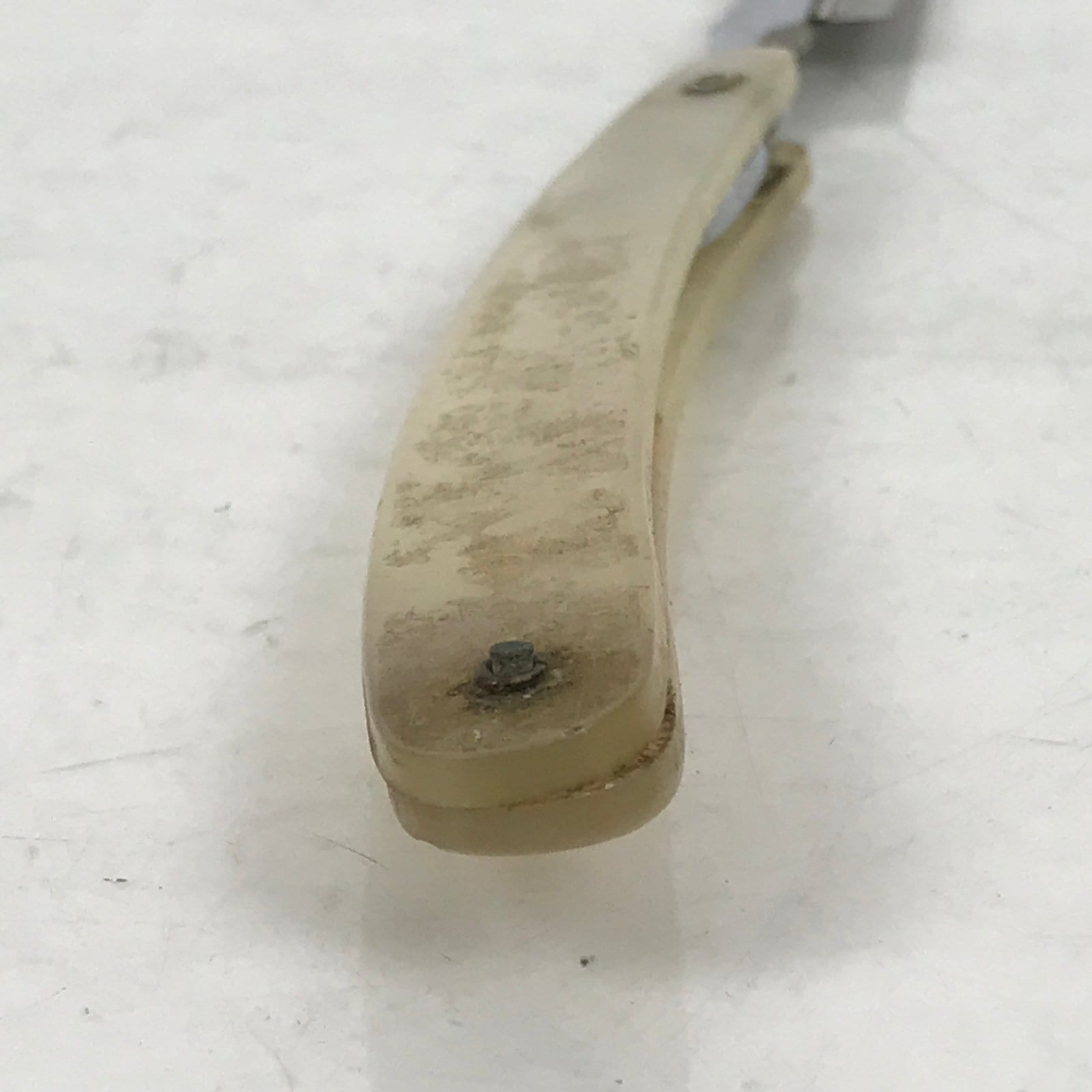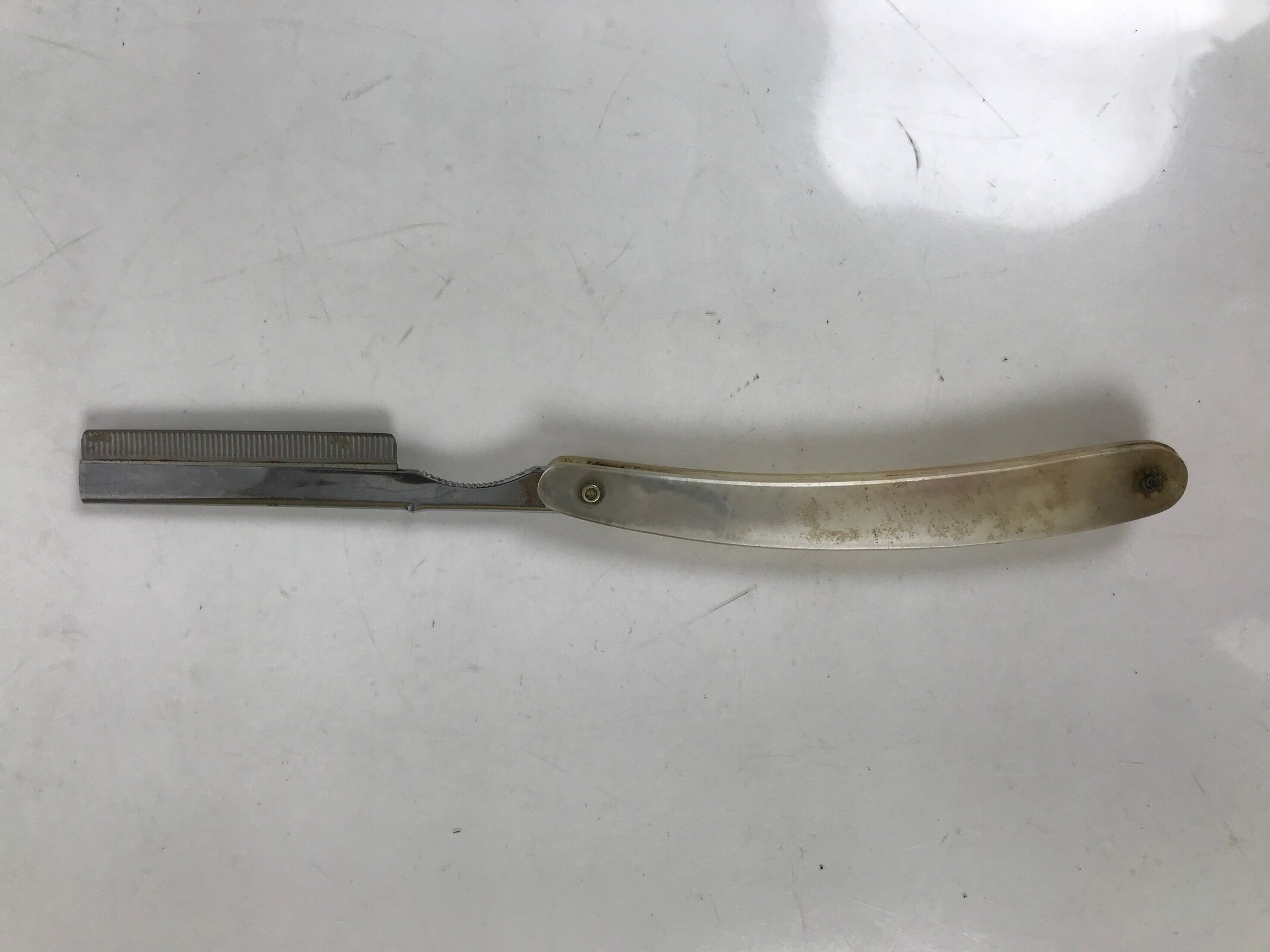 This is a vintage Japanese foldable razor. It has a steel blade and a resin handle that can hold the blade when folded. The blade can be replaced. The inscriptions on the handle read Nikken.