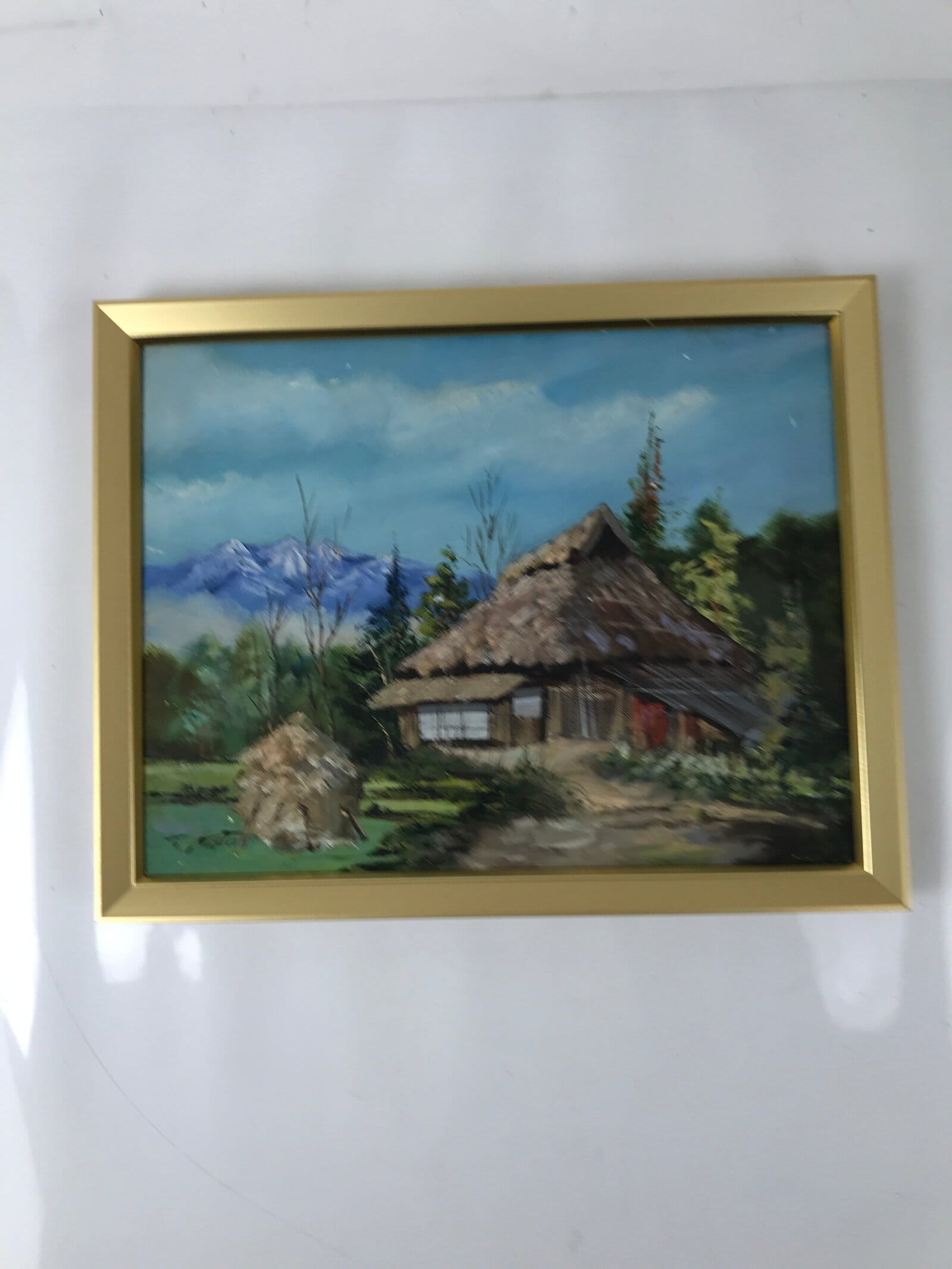 This original acrylic artwork represents a traditional kominka house and a straw bale. In the background, there are high mountains, likely the Japanese Alps, covered with snow. It is signed and has a sticker with the artist’s name on the back of the canvas. This piece is framed in a wood frame with a glass panel and a cord at the back. It is an elegant piece for home and office decor.