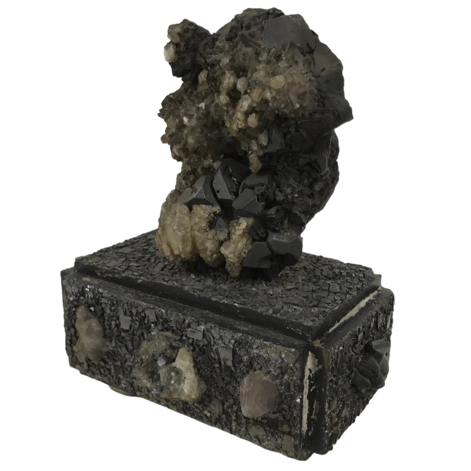 This item is a vintage Japanese viewing stone, also called Suiseki. This statue is a cut of what appears to be galena crystal formations with quartz (not confirmed). It is fixed to a heavy rectangular ceramic base also decorated with stone and crystal fragments.