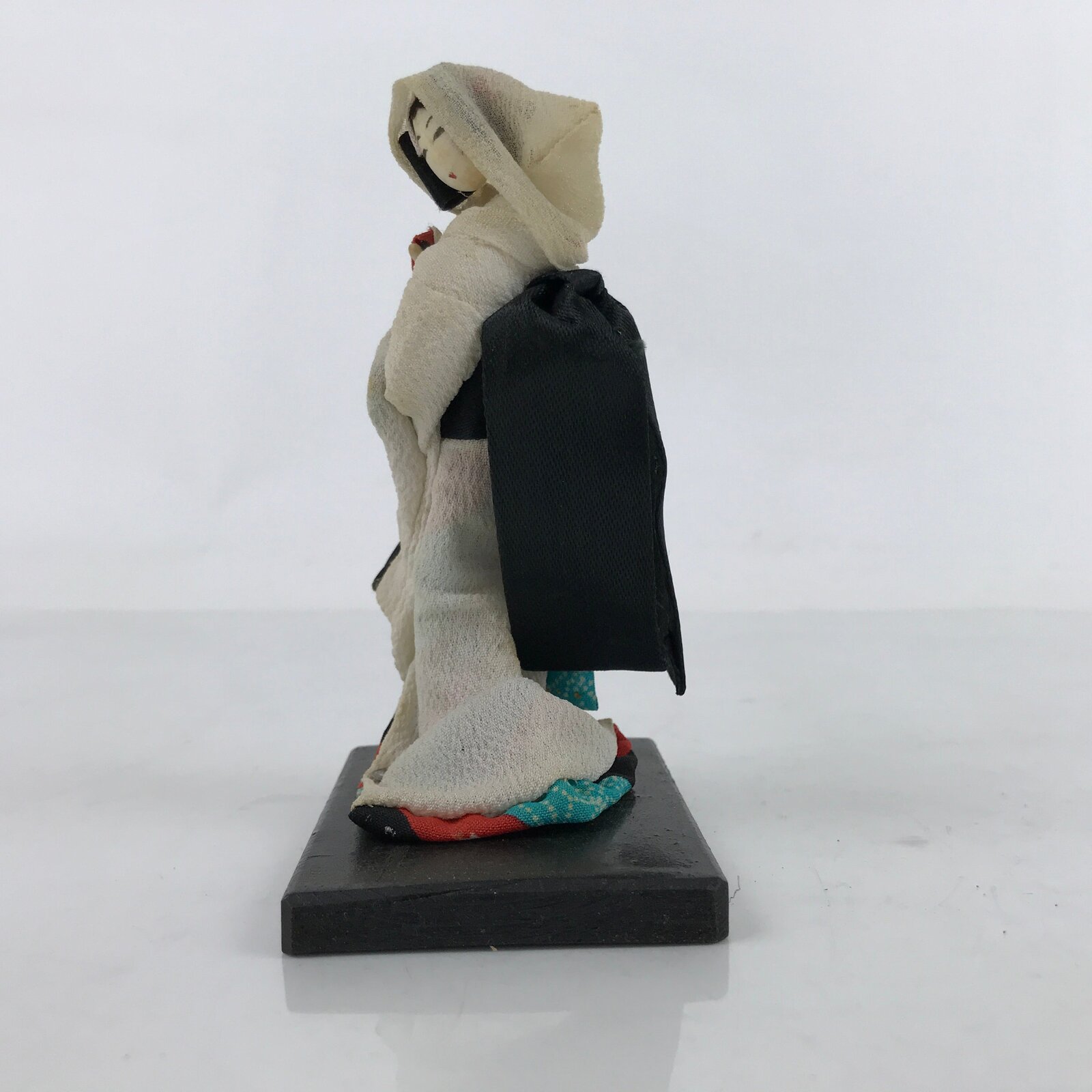 This vintage Japanese wooden kokeshi doll figurine represents a very elegant geisha woman wearing a blue, red and white kimono with a beige overcoat. The hair is hidden by a hood. The doll is attached to a wooden base. Nihon ningyo dolls make perfect decorative items.