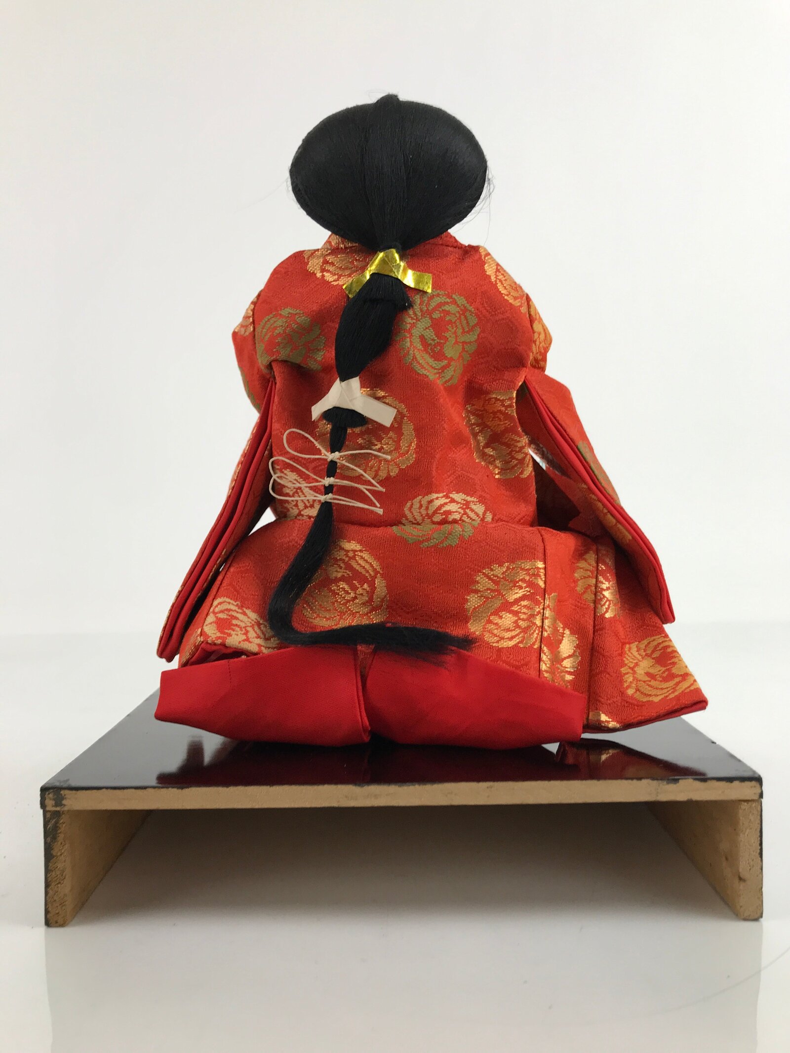 This vintage Japanese wooden court lady doll wears a gorgeous juni-hitoe-like red kimono. This is a quality hina doll made of silk and wood and the head is removable as it was handcrafted separately from the body with a wood base and gofun, a white chalk commonly used in crafting doll faces made from the shells of oysters, clams, etc. This doll stands on a wooden lacquered stand decorated with maki-e art on the front. This elegant doll is an excellent addition to any hina set of doll collections.