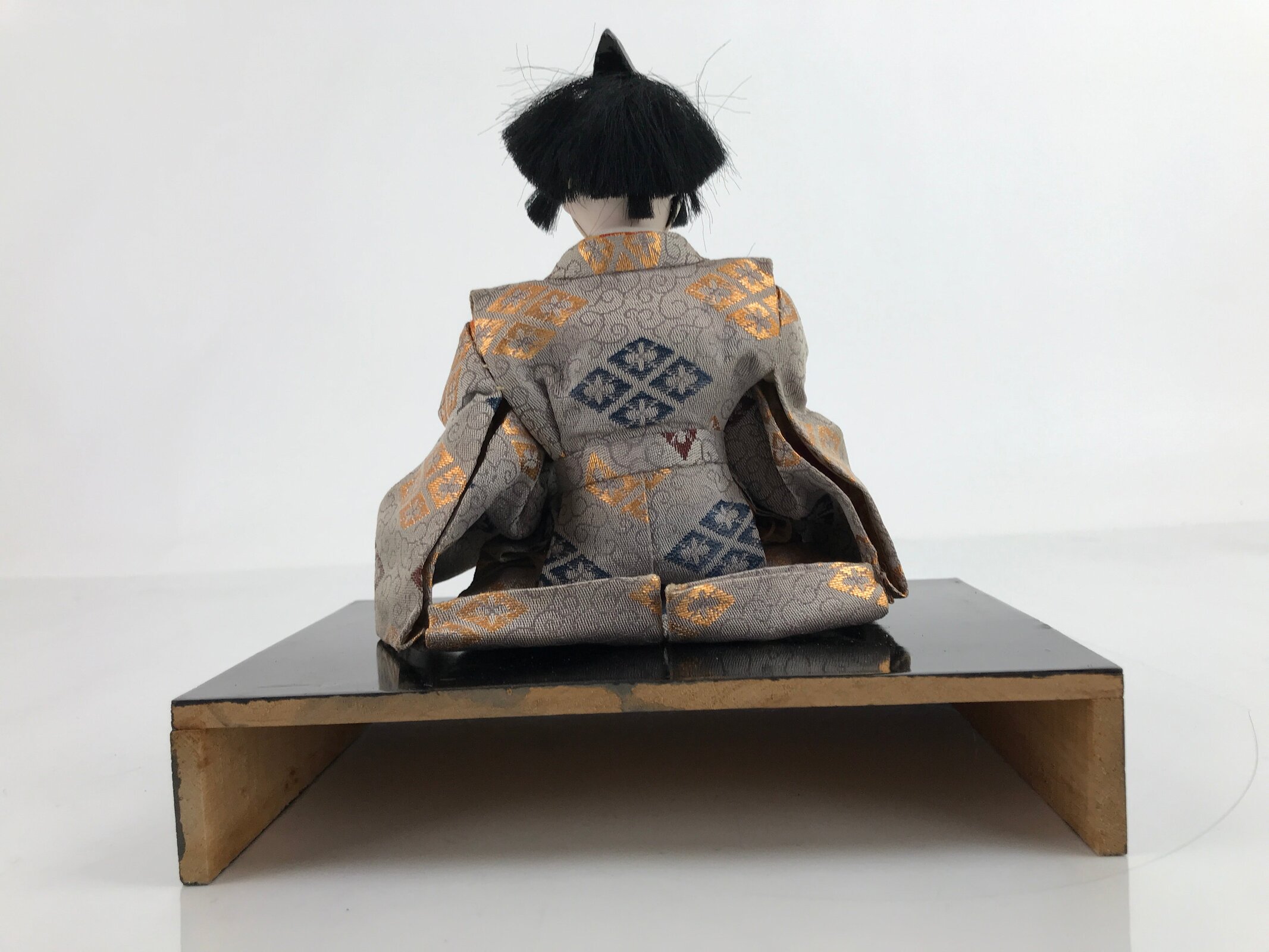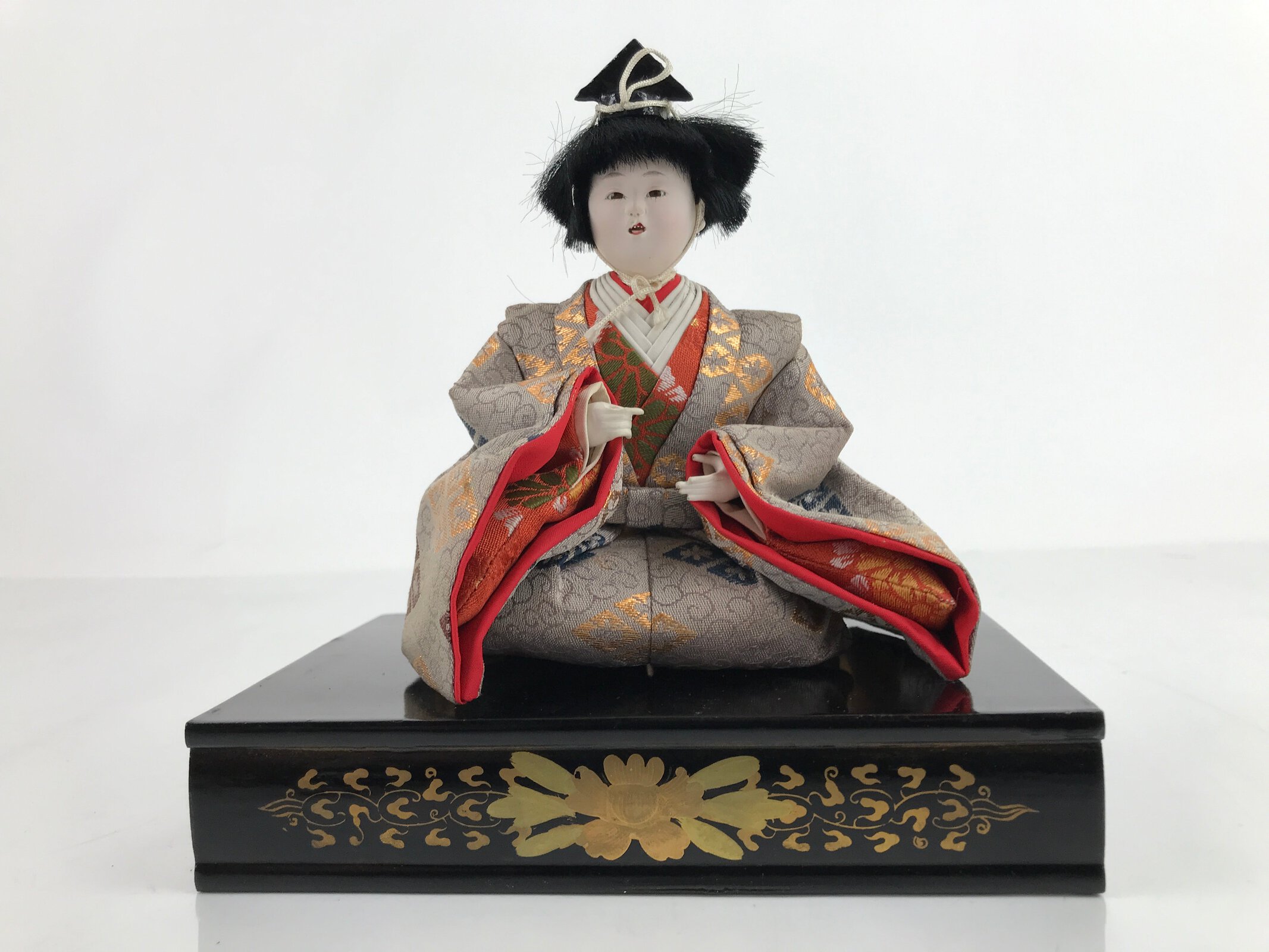 This vintage Japanese wooden court musician doll wears a gorgeous light brown kimono coat with a family crest pattern on it and a small black hat. This is a quality hina doll made of silk and wood and the head is removable as it was handcrafted separately from the body with a wood base and gofun, a white chalk commonly used in crafting doll faces made from the shells of oysters, clams, etc. This doll sits on a wooden lacquered stand decorated with maki-e art on the front. This elegant doll is an excellent addition to any Hina doll collection.