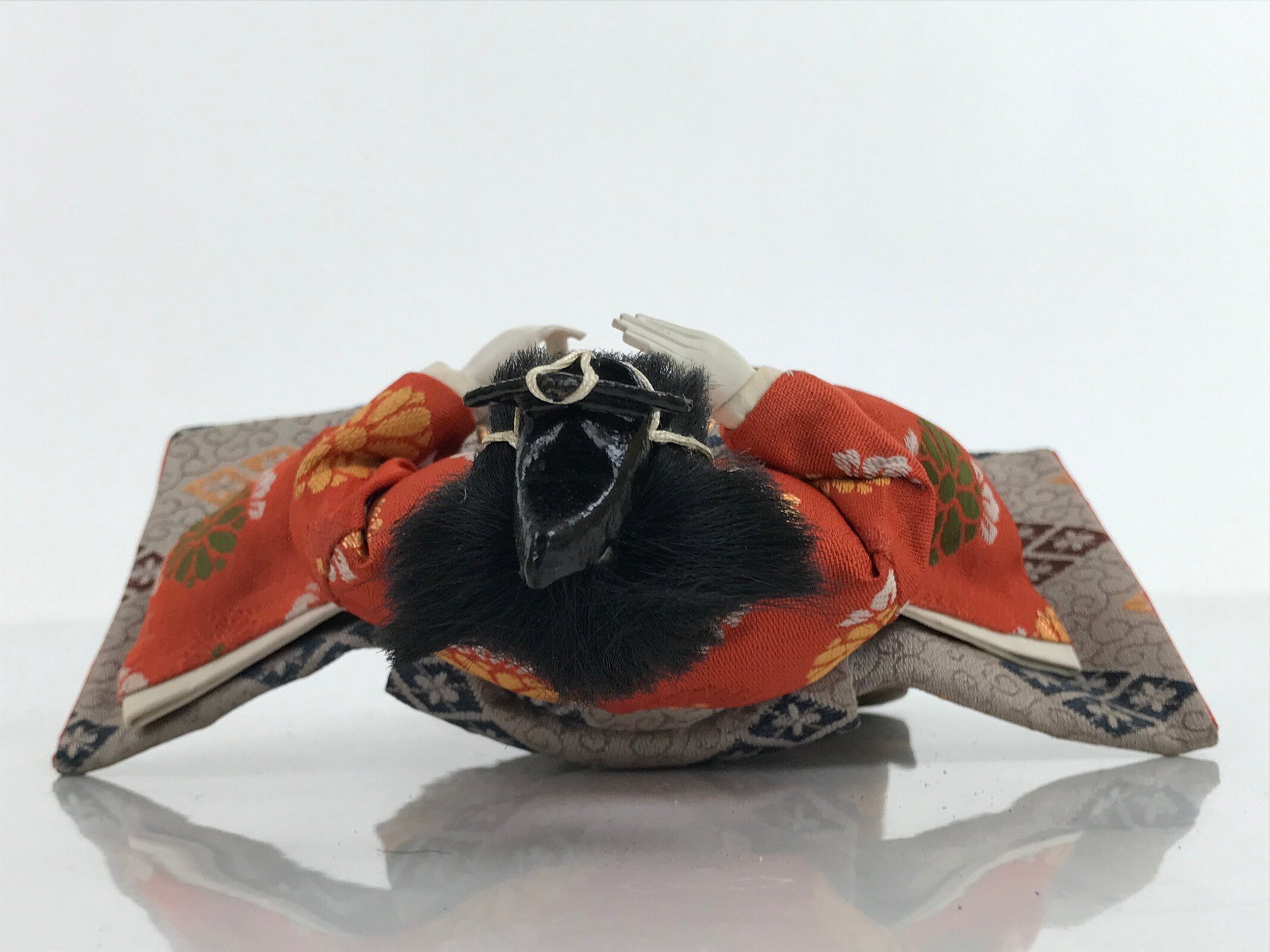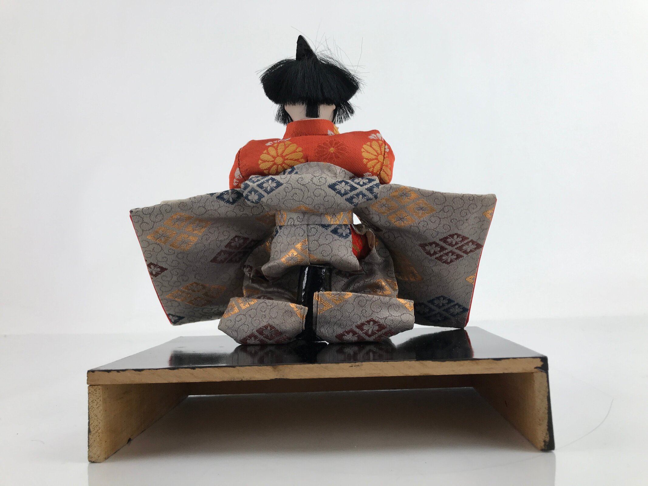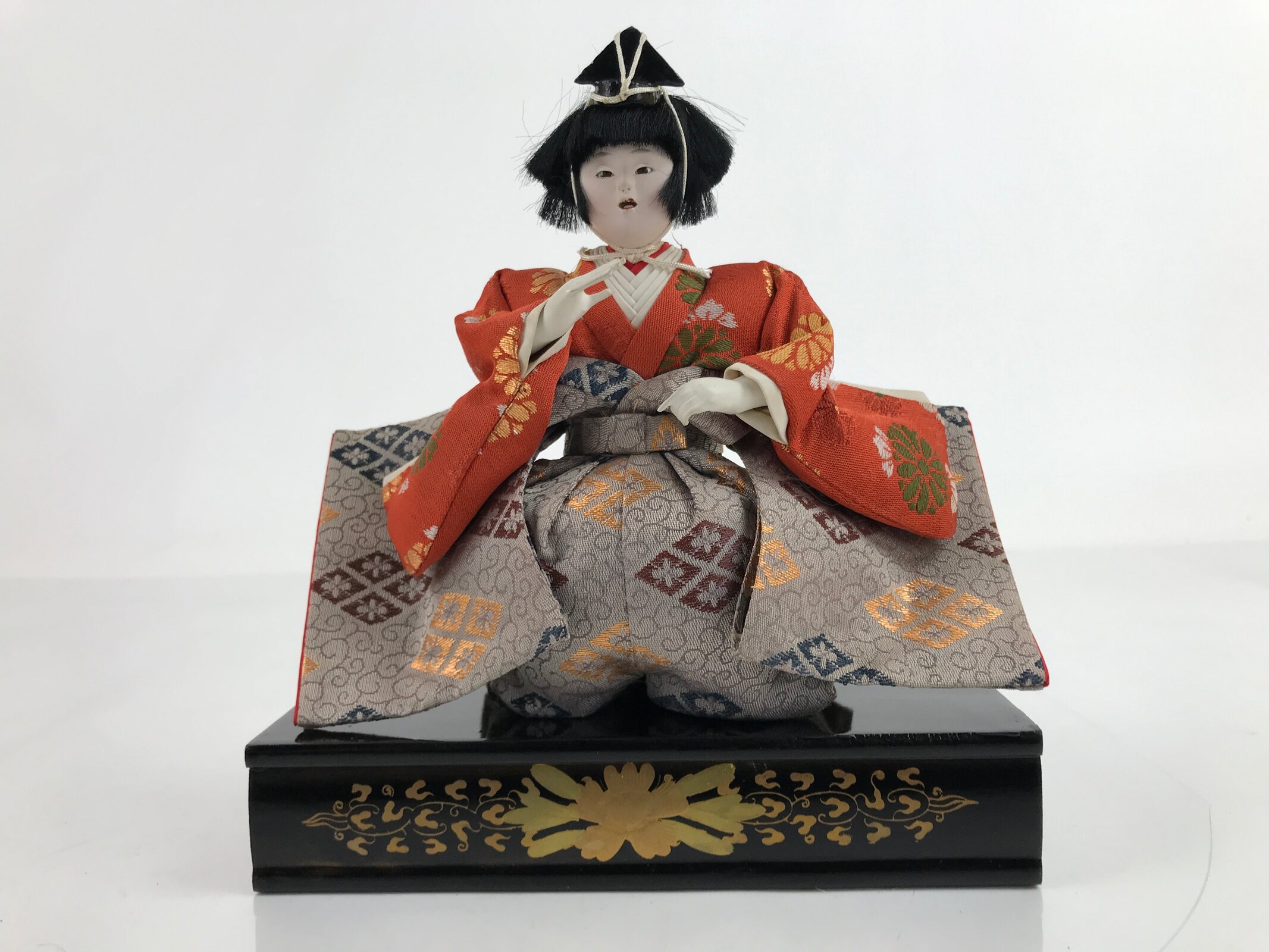 This vintage Japanese wooden court musician doll wears a gorgeous orange and light brown hakama kimono with a family crest pattern on it and a small black hat. This is a quality hina doll made of silk and wood and the head is removable as it was handcrafted separately from the body with a wood base and gofun, a white chalk commonly used in crafting doll faces made from the shells of oysters, clams, etc. This doll sits on a wooden lacquered stand decorated with maki-e art on the front. This elegant doll is an excellent addition to any Hina doll collection.